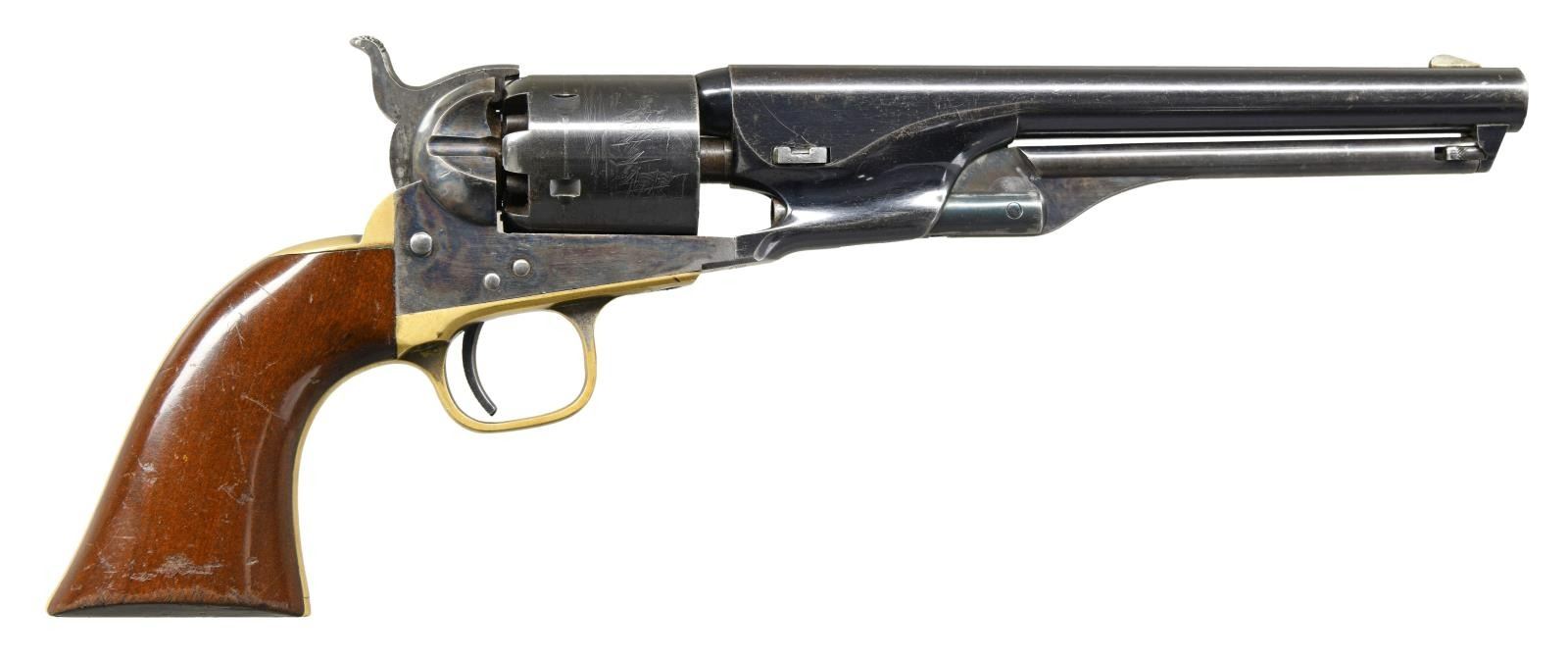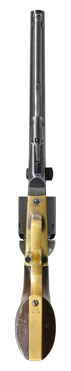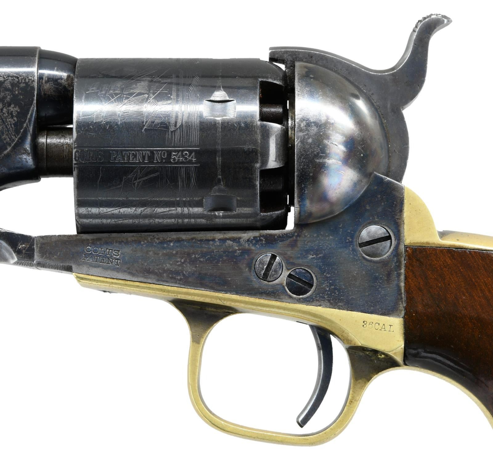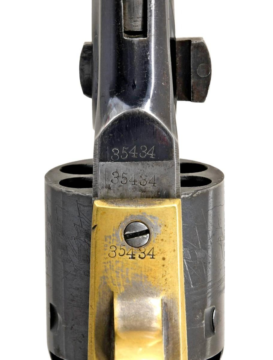 REVOLVER. Cal. 36. S# 35434. This outstanding example is one of the highest condition 1861 Navy revolvers this cataloguer has ever seen. When comparing production totals with the 1851 Navy (approx. 272,000) & the 1860 Army (200,000), the scarcity of this model (38,843) makes any survivors quite desirable. Factoring in the condition of this fine example, one should not let this opportunity pass them by! Bbl. 7-1/2" round with New York address & German silver blade front sight. Round six shot cyl. with naval scene roll engraving. Creeping style loading lever. Blue finish with case colored frame and hammer having silver finished brass backstrap and trigger guard. 1 piece walnut grip. Bbl., frame, grip straps and cyl. have matching numbers. Wedge is unnumbered. Mfg. 1871. UNATTACHED ACCESSORIES: one handwritten and one typed letter from separate individuals regarding the history of this revolver. CONDITION: very fine. Barrel and cylinder retain over 85% bright original blue showing small spots of flaking with minor edge and carry wear. Cyl. scene is clear & visible. Frame retains over 80% vibrant original case colors. Grip straps have a mildly bright appearance retaining small amounts of dark tarnished silver in protected areas. Original grip finish very good showing scratches and marks with edge wear around the butt. Mechanics are fine. Bore is generally bright showing light wear and scattered spots of light pitting. (01-23557). ANTIQUE. $25,000-35,000.