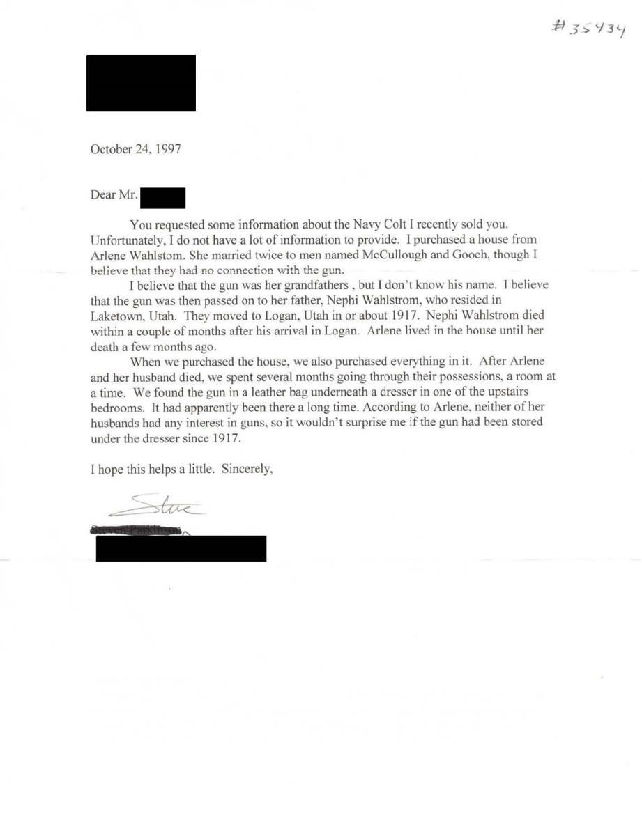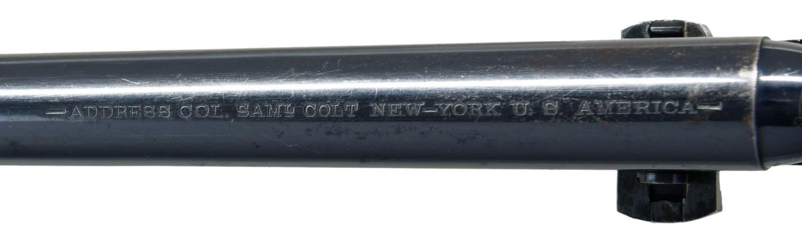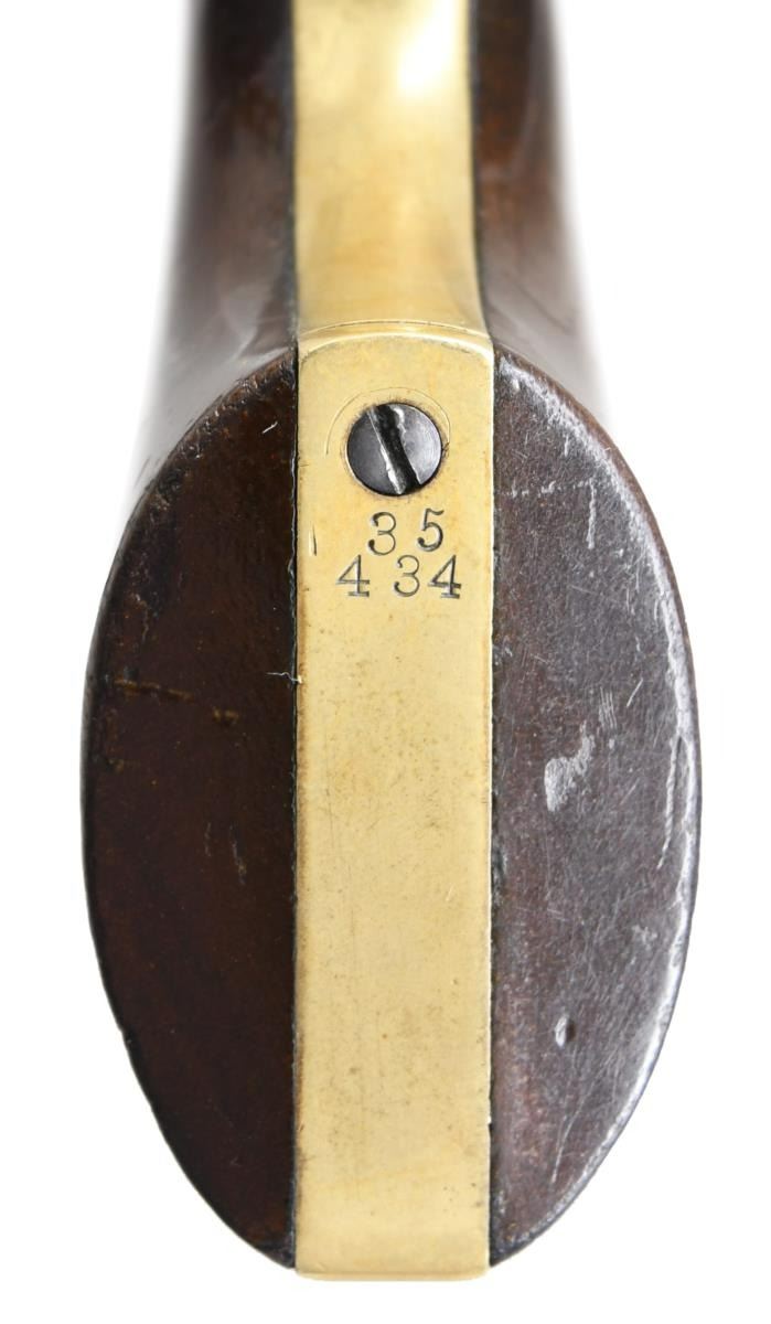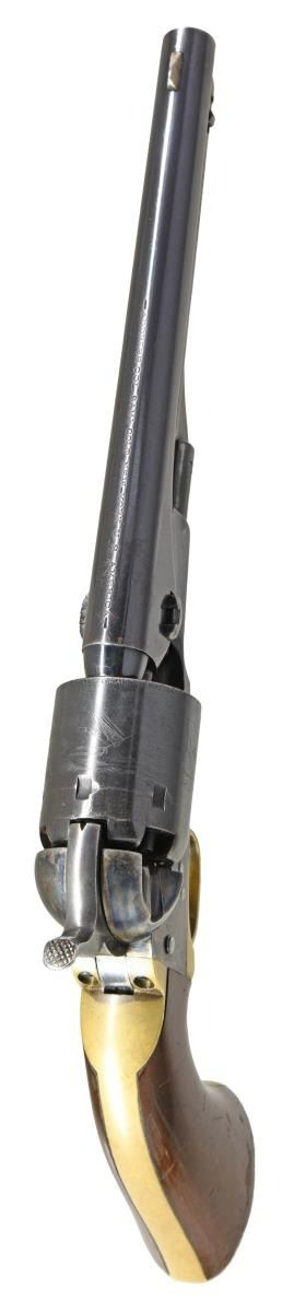 REVOLVER. Cal. 36. S# 35434. This outstanding example is one of the highest condition 1861 Navy revolvers this cataloguer has ever seen. When comparing production totals with the 1851 Navy (approx. 272,000) & the 1860 Army (200,000), the scarcity of this model (38,843) makes any survivors quite desirable. Factoring in the condition of this fine example, one should not let this opportunity pass them by! Bbl. 7-1/2" round with New York address & German silver blade front sight. Round six shot cyl. with naval scene roll engraving. Creeping style loading lever. Blue finish with case colored frame and hammer having silver finished brass backstrap and trigger guard. 1 piece walnut grip. Bbl., frame, grip straps and cyl. have matching numbers. Wedge is unnumbered. Mfg. 1871. UNATTACHED ACCESSORIES: one handwritten and one typed letter from separate individuals regarding the history of this revolver. CONDITION: very fine. Barrel and cylinder retain over 85% bright original blue showing small spots of flaking with minor edge and carry wear. Cyl. scene is clear & visible. Frame retains over 80% vibrant original case colors. Grip straps have a mildly bright appearance retaining small amounts of dark tarnished silver in protected areas. Original grip finish very good showing scratches and marks with edge wear around the butt. Mechanics are fine. Bore is generally bright showing light wear and scattered spots of light pitting. (01-23557). ANTIQUE. $25,000-35,000.