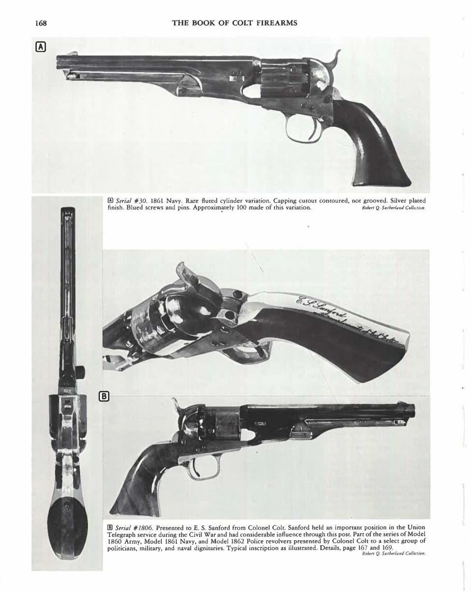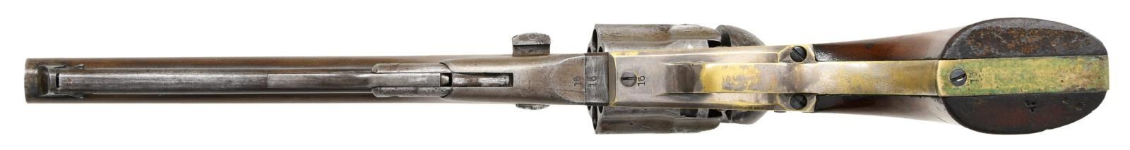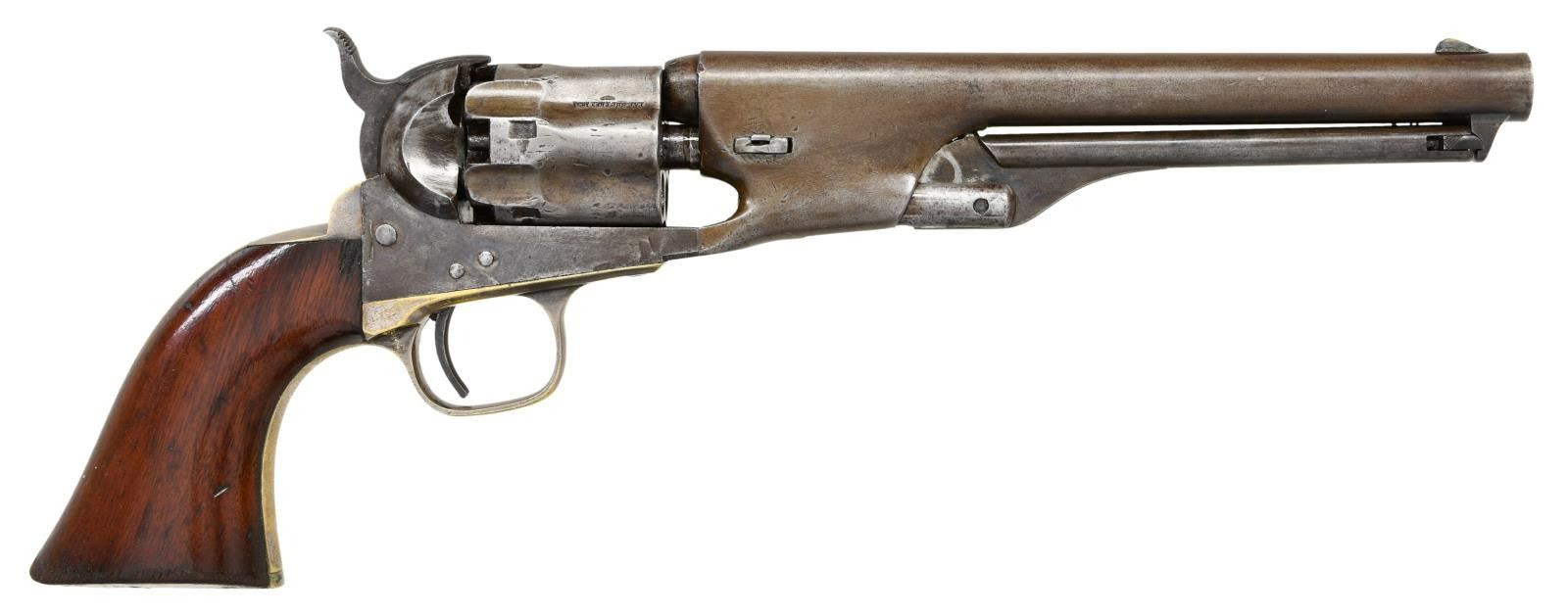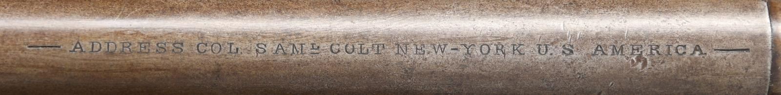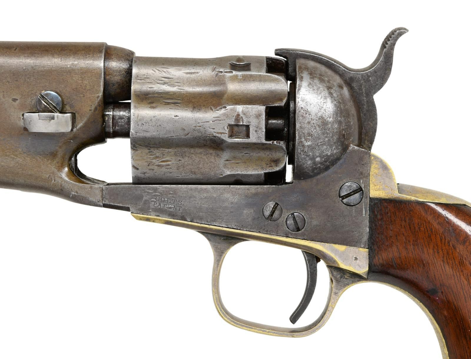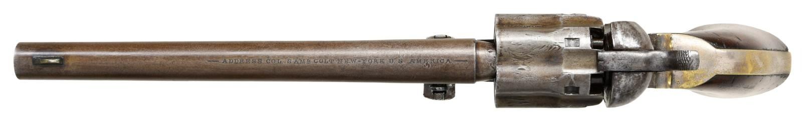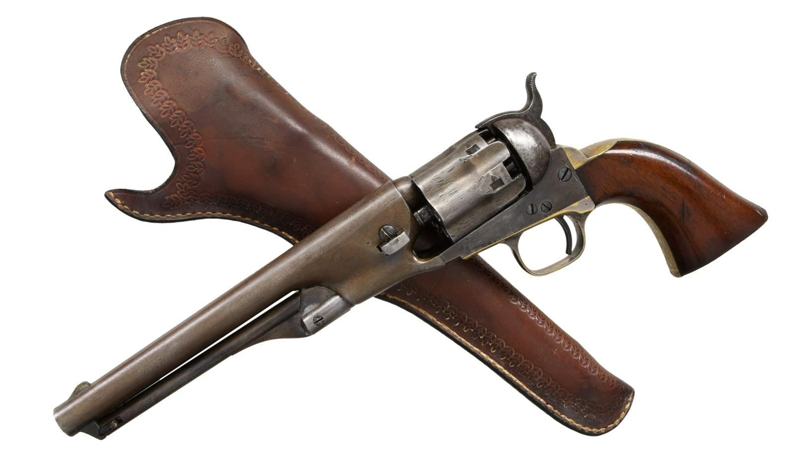 ORIGINAL SLIM JIM HOLSTER. S# 16. Cal. 36. S# 16. Less than 100 fluted cylinder navies are thought made. Other early serial numbers noted are 1, 3, 11, 29, & 30. Like fluted model 1860 armies, one flute is stamped: "PATENT SEPT 10th 1860". Unlike standard production models the capping cut out is not grooved. Standard configuration otherwise: "ADDRESS COL. SAML COLT NEW-YORK U.S. AMERICA" with dashes stamped on 7.5" barrel, small COLTS PATENT stamped left side of frame, mounted with varnished walnut one piece grips. UNATTACHED ACCESSORIES: copies of pages pertaining to this model from "The Book of Colt Firearms" by Sutherland & Wilson. Colt factory letter stating 1 of 20 revolvers sent to colt firearms, New York office 240 Broadway, New York City, April 16th 1861 just four days after the firing on Fort Sumter. CONDITION: very good overall, appears all original, tiny traces a blue and case color, grip frame retains about 25% original silver. Matching serial numbers observed on every part normally marked including barrel, frame, trigger guard, back strap, cylinder, and wedge. Well fit grips were not removed and retain most of their original factory varnish. Mechanically fine, crisp rifled bore. Revolver has well-fit slim Jim holster that clearly show the cylinder flutes that has always been with gun is in beautiful condition. PROVENANCE: Collection of Horst Kreiner. (01-24000/JS). ANTIQUE. $20,000-30,000.