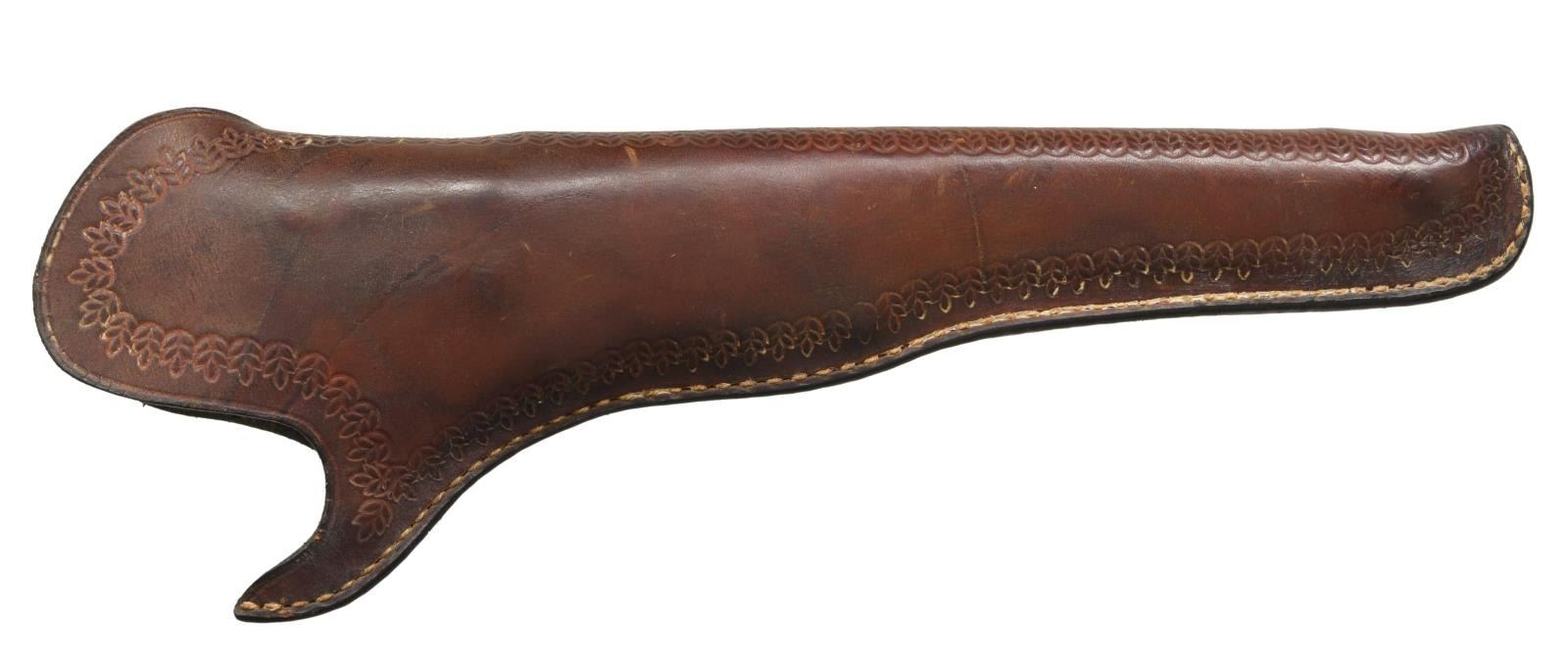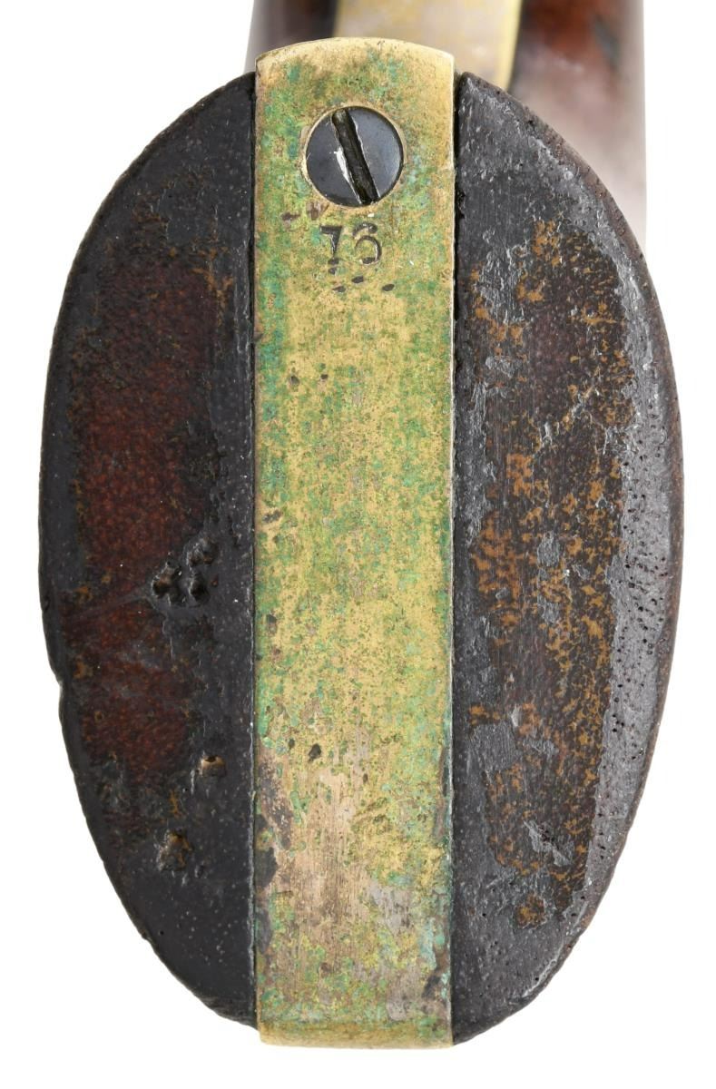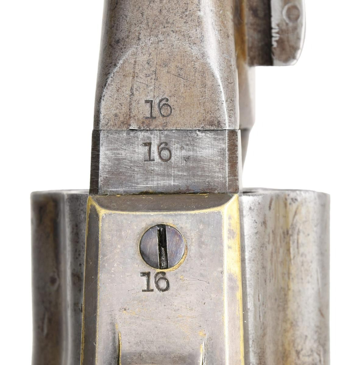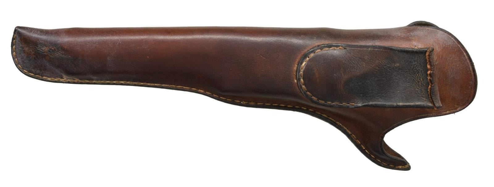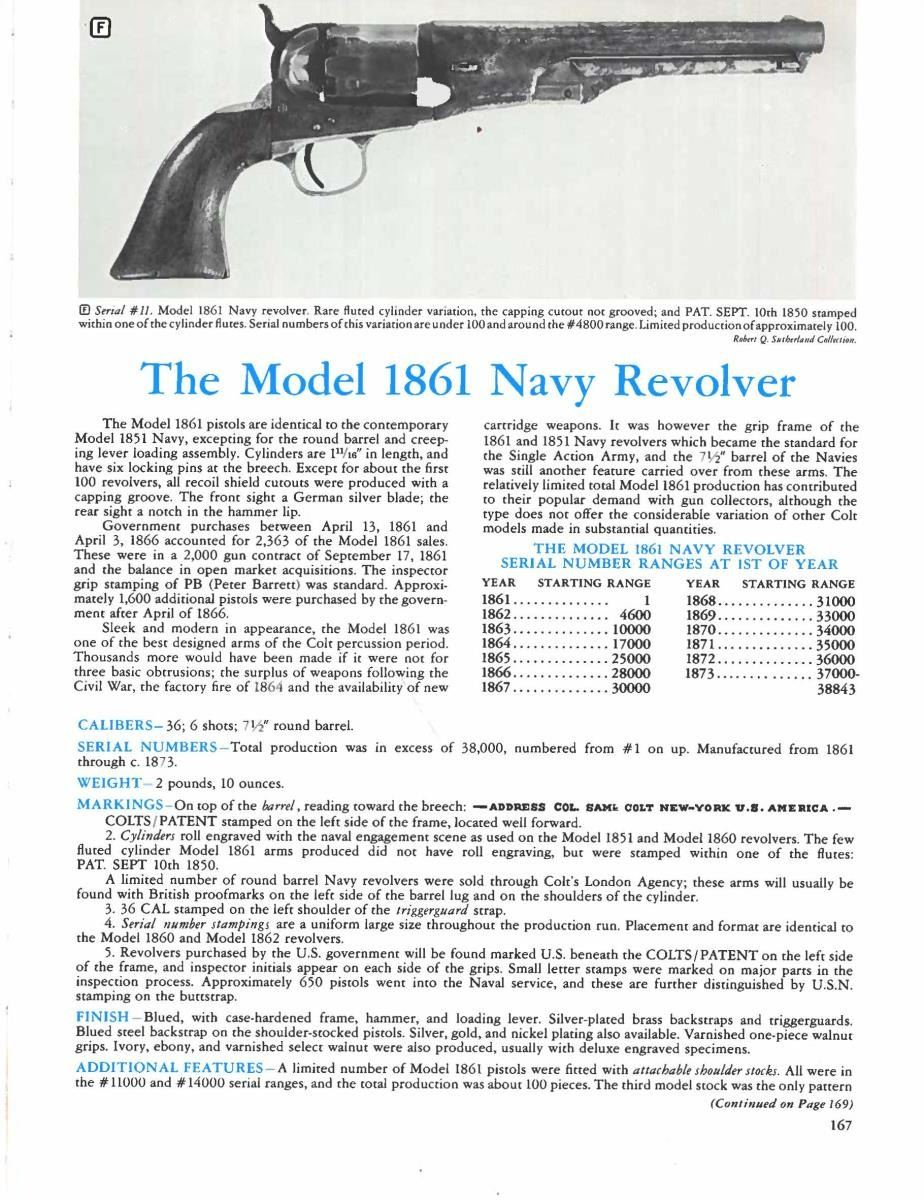 ORIGINAL SLIM JIM HOLSTER. S# 16. Cal. 36. S# 16. Less than 100 fluted cylinder navies are thought made. Other early serial numbers noted are 1, 3, 11, 29, & 30. Like fluted model 1860 armies, one flute is stamped: "PATENT SEPT 10th 1860". Unlike standard production models the capping cut out is not grooved. Standard configuration otherwise: "ADDRESS COL. SAML COLT NEW-YORK U.S. AMERICA" with dashes stamped on 7.5" barrel, small COLTS PATENT stamped left side of frame, mounted with varnished walnut one piece grips. UNATTACHED ACCESSORIES: copies of pages pertaining to this model from "The Book of Colt Firearms" by Sutherland & Wilson. Colt factory letter stating 1 of 20 revolvers sent to colt firearms, New York office 240 Broadway, New York City, April 16th 1861 just four days after the firing on Fort Sumter. CONDITION: very good overall, appears all original, tiny traces a blue and case color, grip frame retains about 25% original silver. Matching serial numbers observed on every part normally marked including barrel, frame, trigger guard, back strap, cylinder, and wedge. Well fit grips were not removed and retain most of their original factory varnish. Mechanically fine, crisp rifled bore. Revolver has well-fit slim Jim holster that clearly show the cylinder flutes that has always been with gun is in beautiful condition. PROVENANCE: Collection of Horst Kreiner. (01-24000/JS). ANTIQUE. $20,000-30,000.