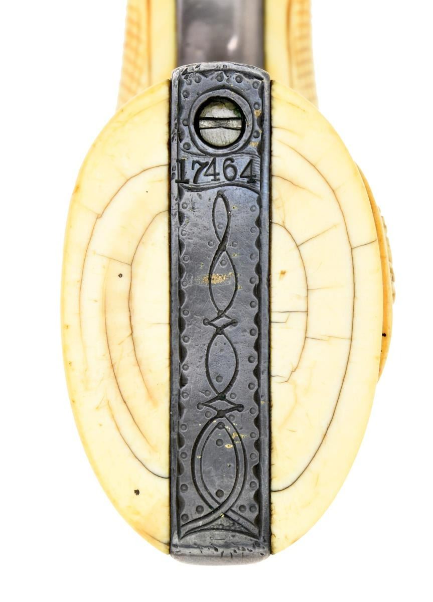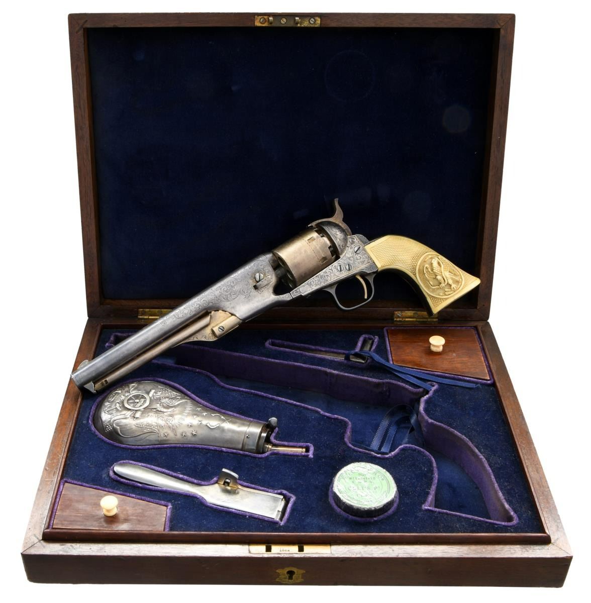 It is mounted with fine 1-piece checkered & carved Mexican eagle grips. According to consignor, an attributed gun S# 17452 from a Santa Anna descendant was discovered about the same time as this revolver in California with nearly identical engraving and same wear. So, it is now thought that these two guns were made as a pair. That revolver was in the Calvin Patrick collection, but it must have been sold before his death when his collection was sold at Burley auctions in 2017. This revolver is finely scroll engraved in the Nimschke style, gold and silver plated, later cased in French fitted mahogany casing with original silver plated eagle & panoply of arms powder flask, silver plated 2-cavity mold, sealed pack of “COL COLT’S REVOLVING BELT PISTOL” combustible cartridges, green label cap tin, pewter oiler, and “L” shaped Colt combination tool.
