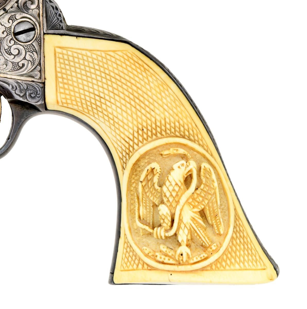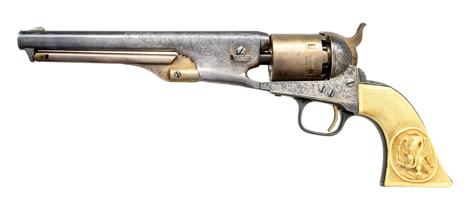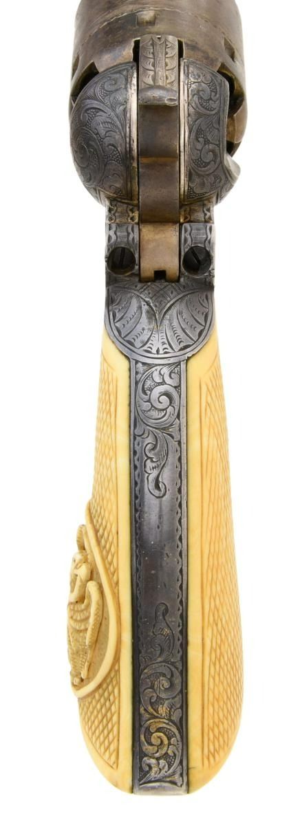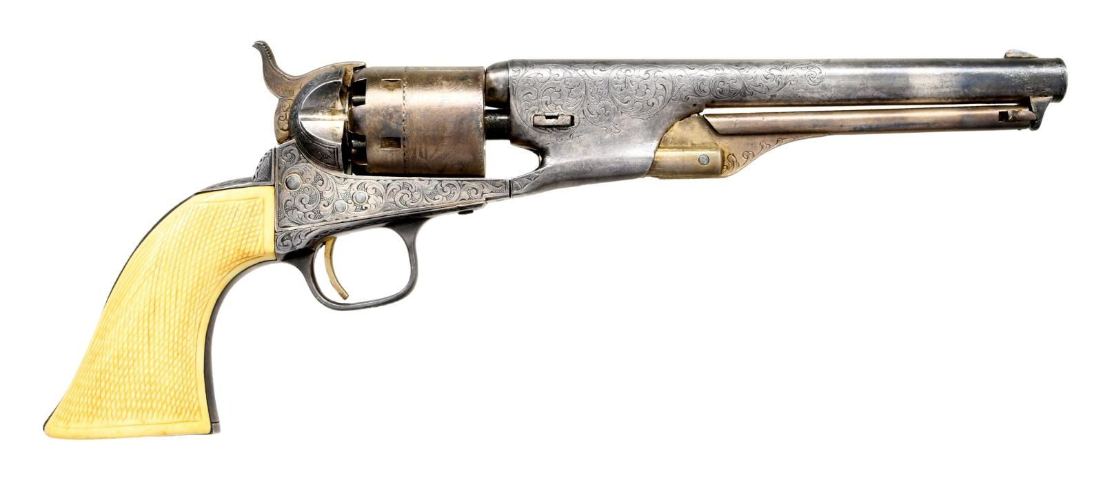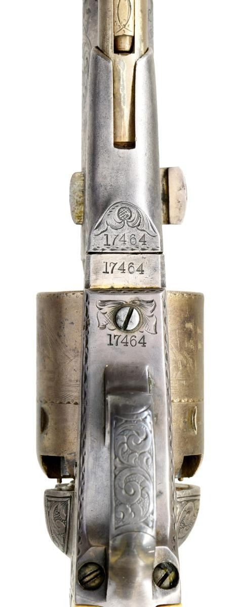 BOBBY SMITH, SANTA ANNA ATTRIBUTION. Cal. 36. S# 17464. Regardless if the Santa Anna attribution is correct or not, the accompanying story is interesting & the revolver is original and contemporarily engraved either by Colt or a New York shop, about the time of revolver’s manufacture in 1868. There are three other nearly identical engraved & ivory mounted 1861 navies attributed to Santa Anna.