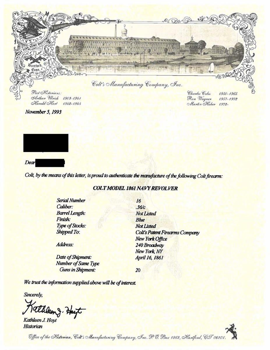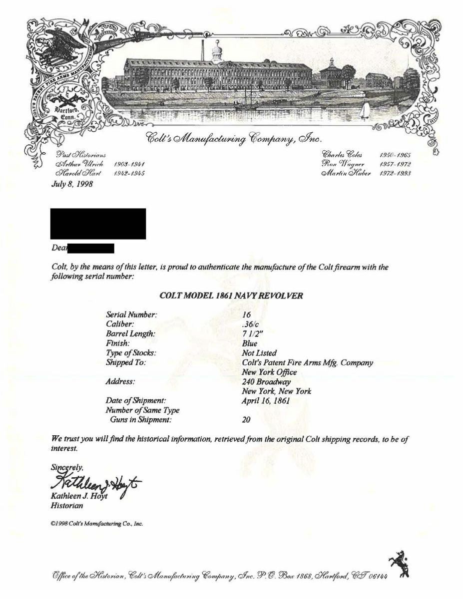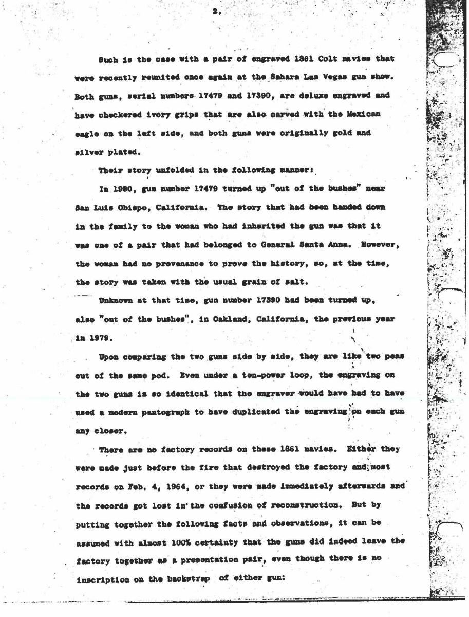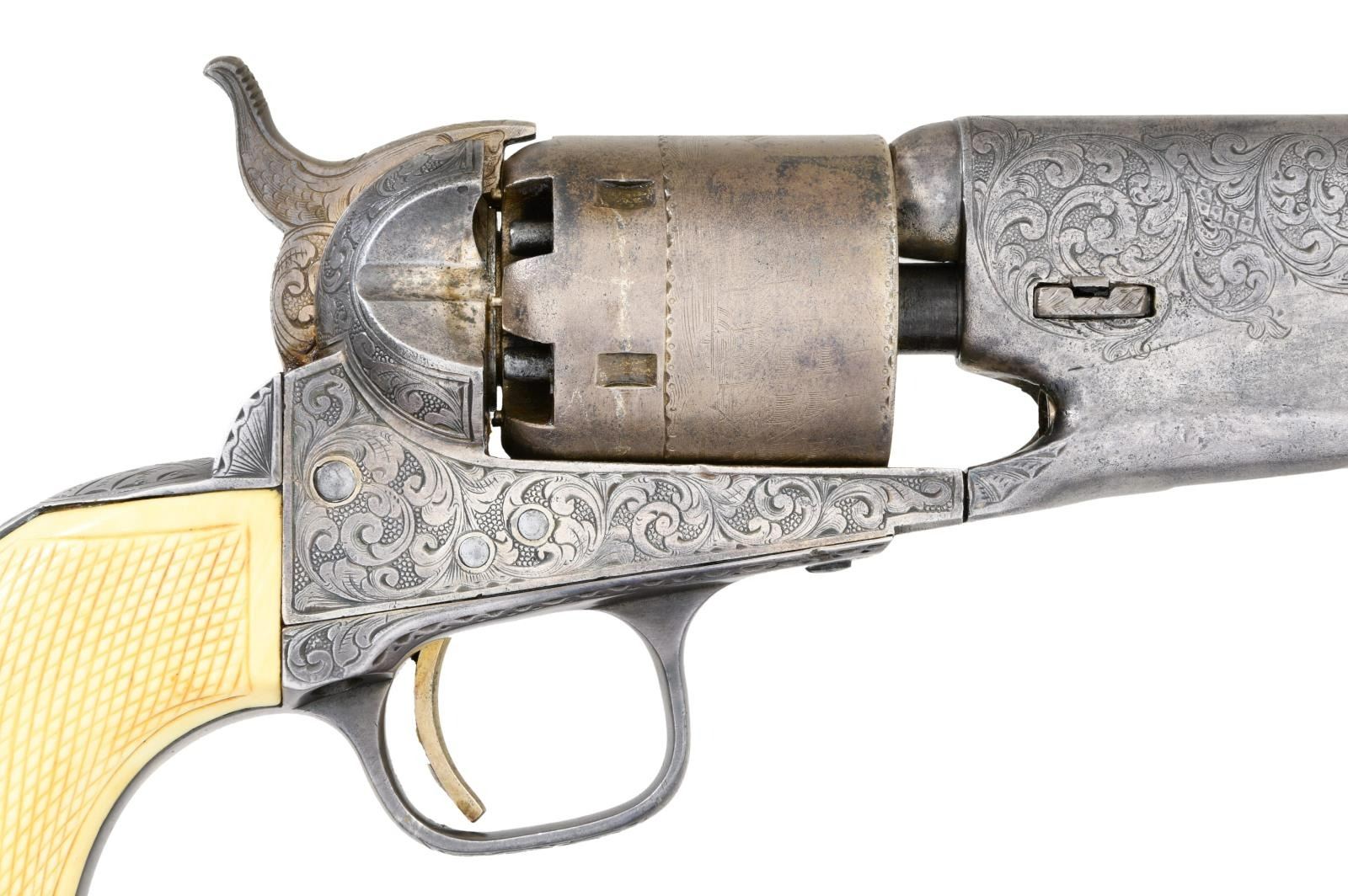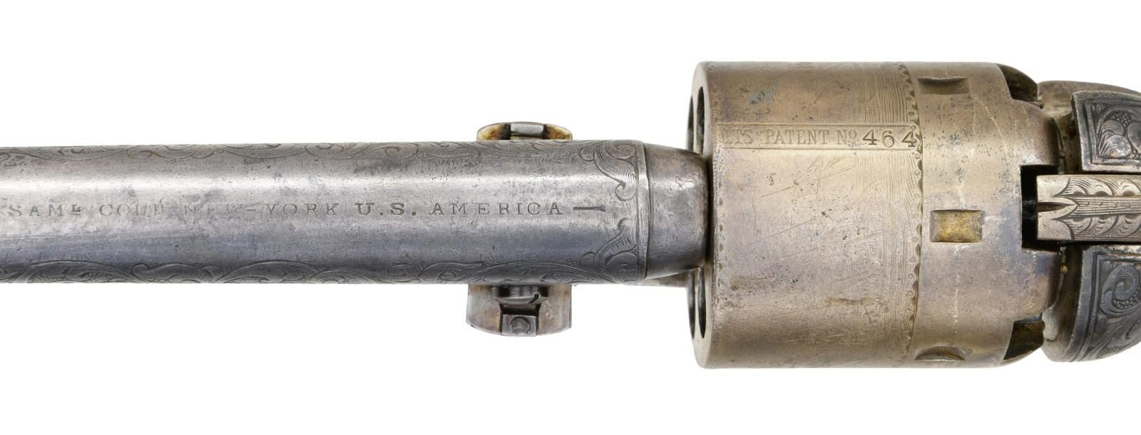 BOBBY SMITH, SANTA ANNA ATTRIBUTION. Cal. 36. S# 17464. Regardless if the Santa Anna attribution is correct or not, the accompanying story is interesting & the revolver is original and contemporarily engraved either by Colt or a New York shop, about the time of revolver’s manufacture in 1868. There are three other nearly identical engraved & ivory mounted 1861 navies attributed to Santa Anna.
