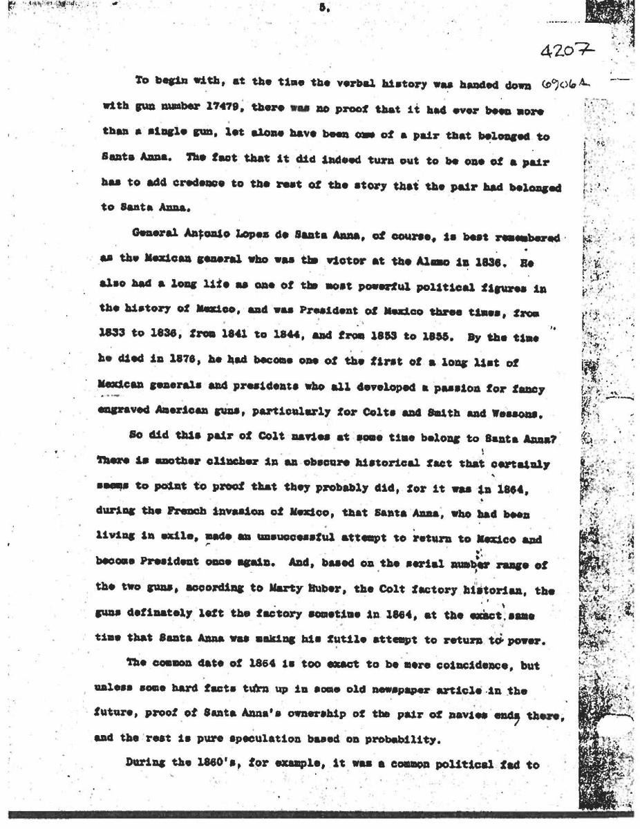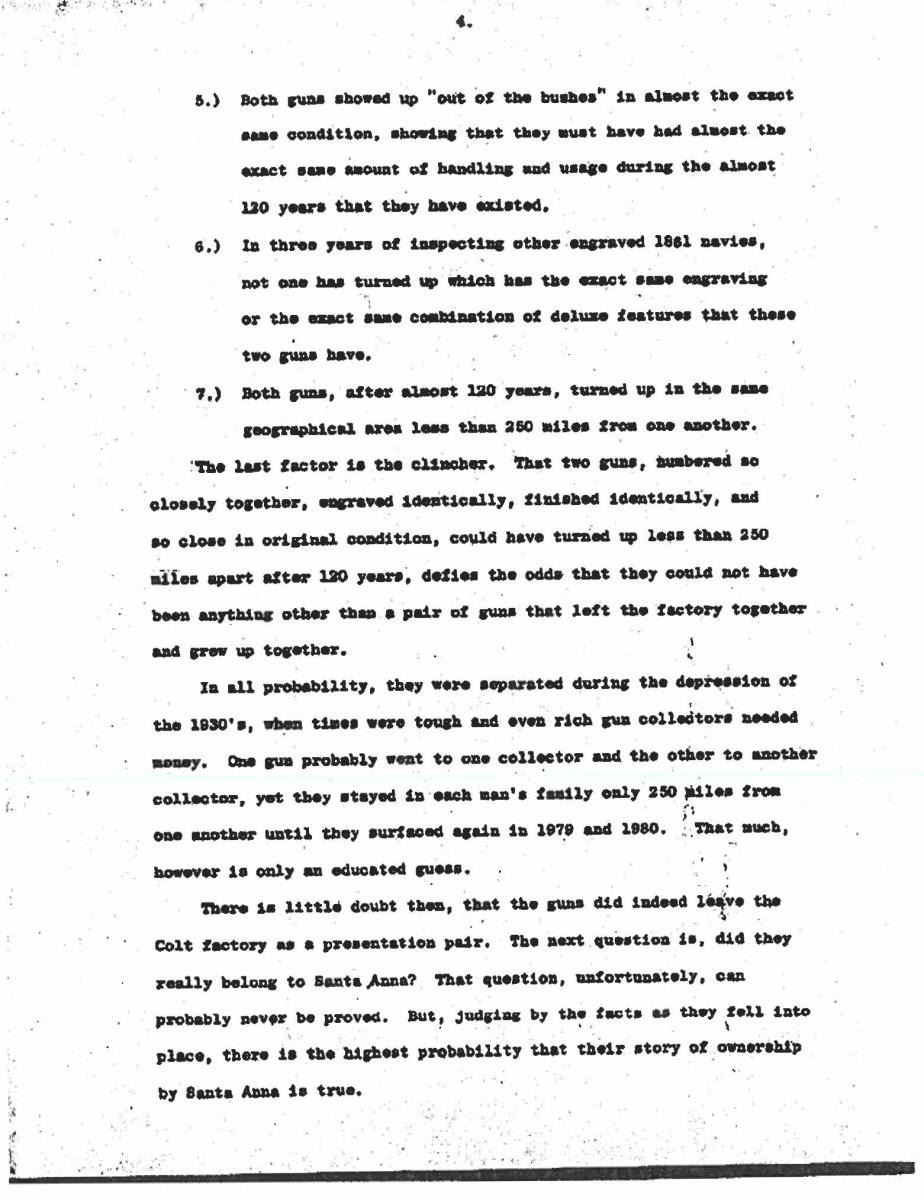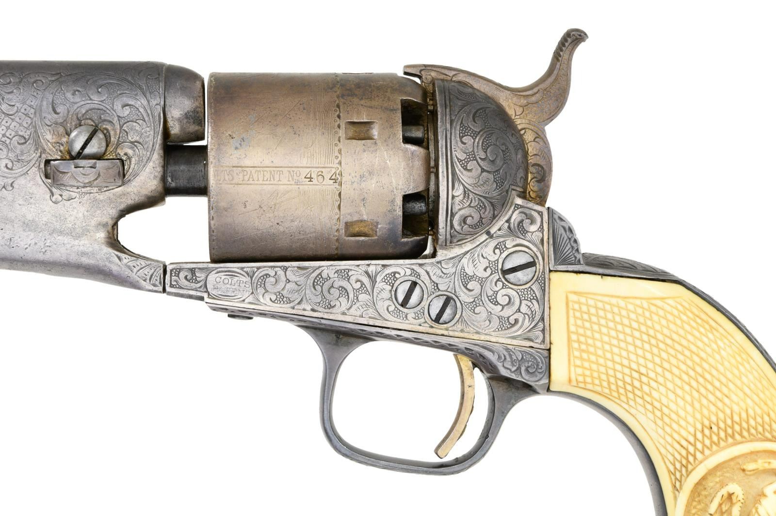UNATTACHED ACCESSORIES: several copies of correspondence copy concerning provenance including one from Colt Collectors Association historian Don Jones & 4-page letter by Lee A. Silva faxed to John Gangle in 1999 concerning Santa Anna attribution of this revolver. CONDITION very good overall, engraving & markings all discernible, traces of silver wash, gold has been touched up, cylinder scene mostly discernible, grips are well fit with aged ivory patina. Mechanically fine, crisp rifled bore with pitting. Accompanying casing is fine, relined, accessories are very good. PROVENANCE: Bobby Smith 1999, Collection of Horst Kreiner. (01-24001/JS). $10,000-15,000.