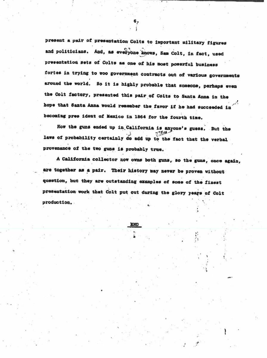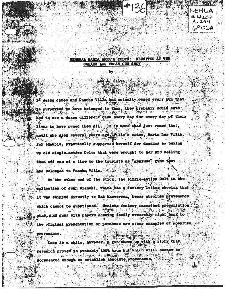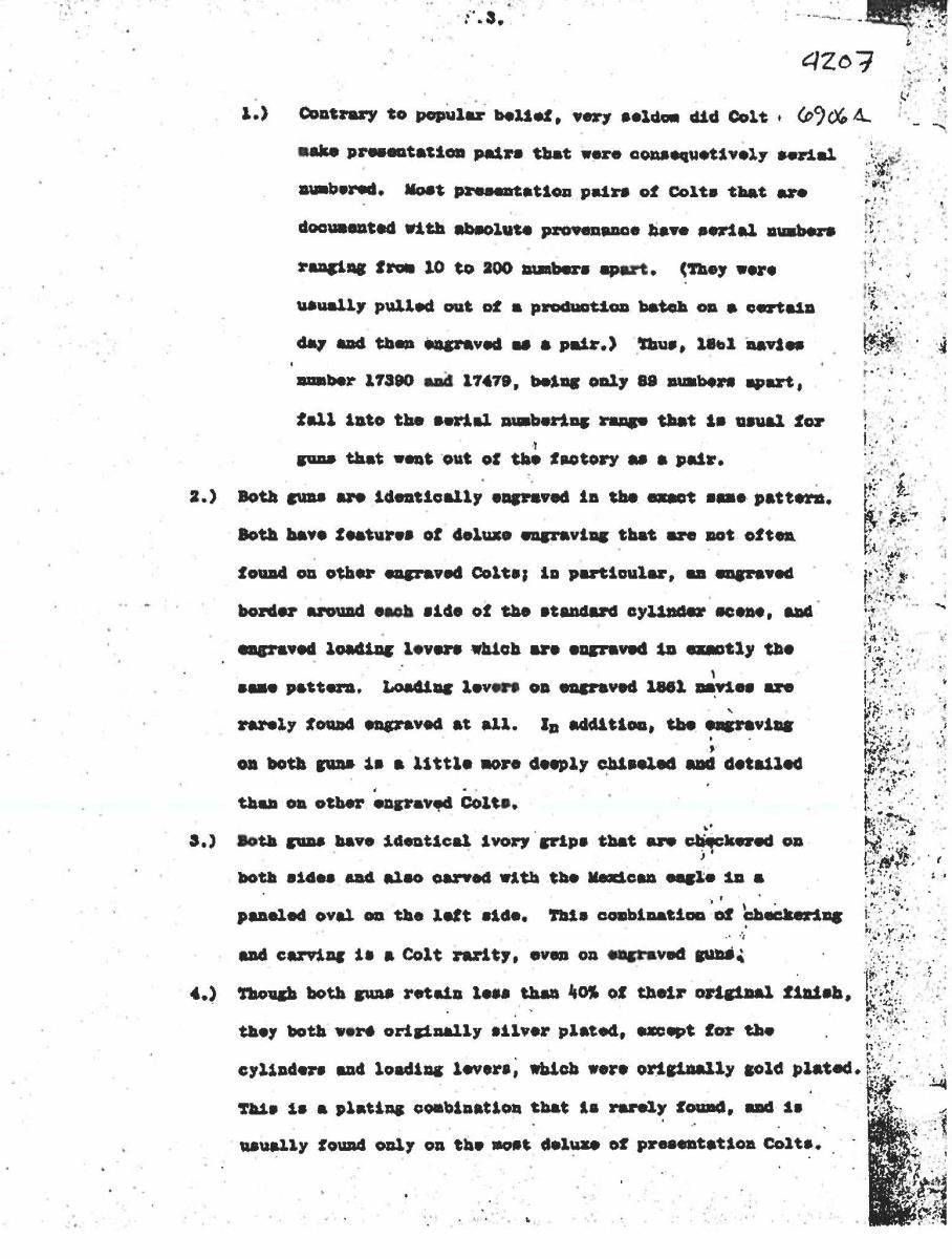 UNATTACHED ACCESSORIES: several copies of correspondence copy concerning provenance including one from Colt Collectors Association historian Don Jones & 4-page letter by Lee A. Silva faxed to John Gangle in 1999 concerning Santa Anna attribution of this revolver. CONDITION very good overall, engraving & markings all discernible, traces of silver wash, gold has been touched up, cylinder scene mostly discernible, grips are well fit with aged ivory patina. Mechanically fine, crisp rifled bore with pitting. Accompanying casing is fine, relined, accessories are very good. PROVENANCE: Bobby Smith 1999, Collection of Horst Kreiner. (01-24001/JS). $10,000-15,000.