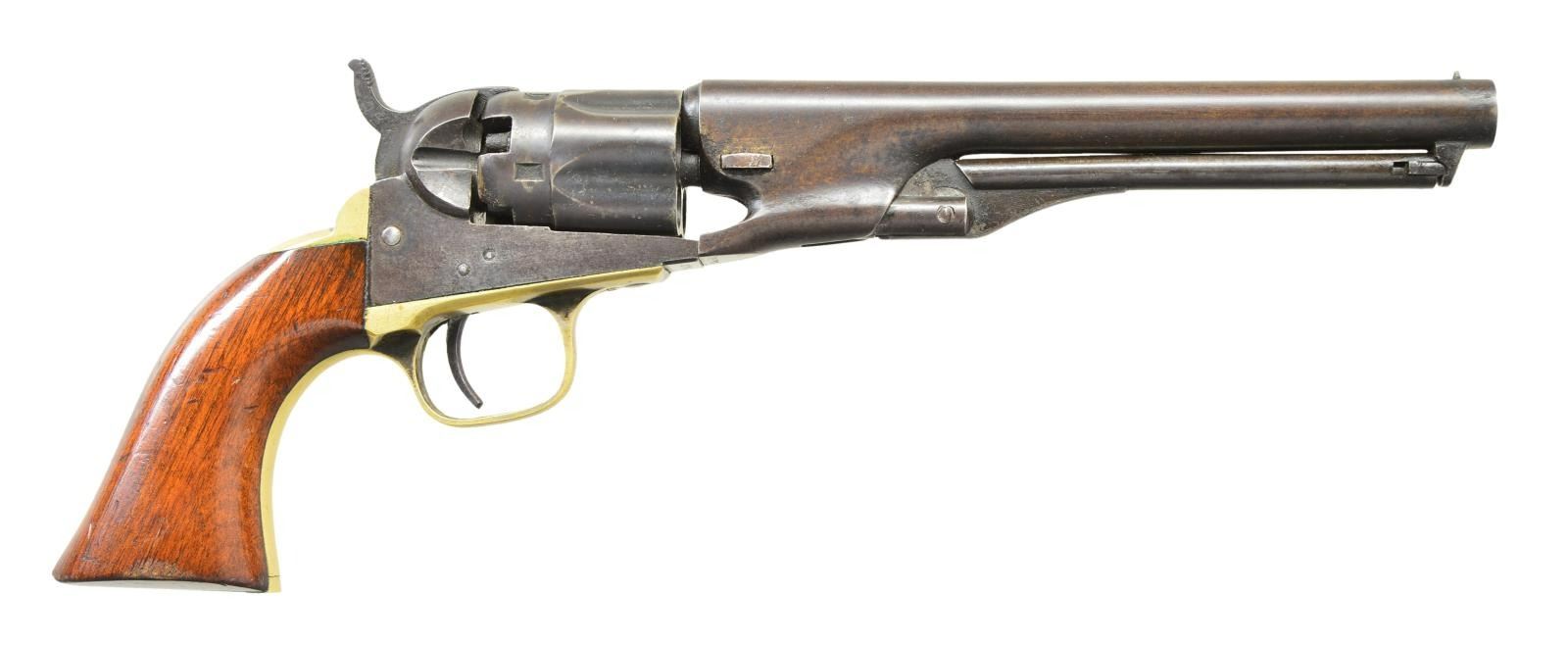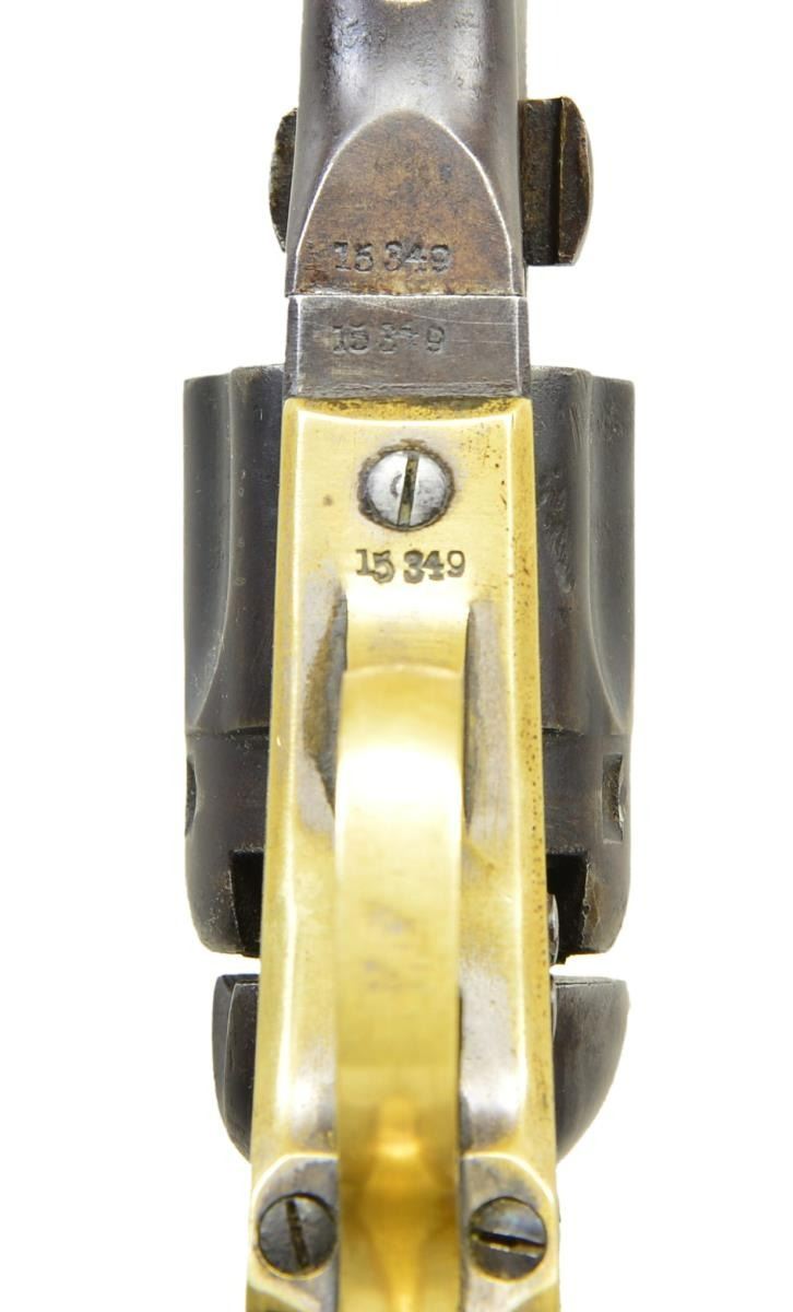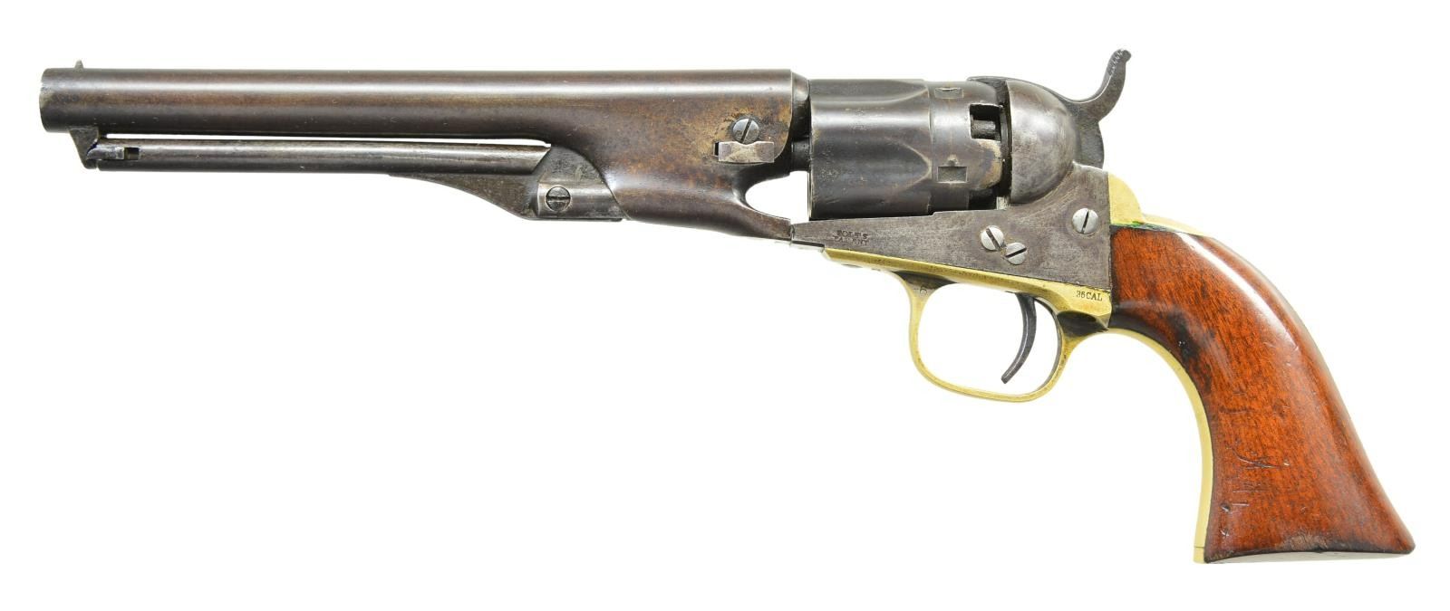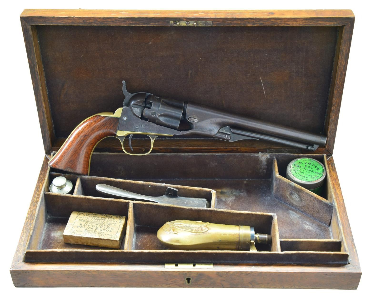 Cal. 36. S# 15349. Bbl. 6 1/2" round w/ New York address & bead sight. Six shot fluted & rebated cyl. Original finish w/ blue & case colored w/ silver finished grip straps. 1 Piece walnut grip. Bbl., frame & grip straps have matching numbers. Wedge has non matching number "2098". Mfg. 1863 during the American Civil War. UNATTACHED ACCESSORIES: period style wood presentation box w/ vacant brass shield on lid. Purple baize lined interior showing wear & fading. Case contains small eagle flask, 2 cavity iron mold, oil bottle & cap tin. Also included is 1 wrapped package of five combustible envelope cartridges. CONDITION: metal finish has faded to a smooth plum/brown patina. Grip straps have traces of silver in protected areas. Grips retain most of their original varnish w/ edge wear. Sound action. Bore retains strong rifling showing small spots of very light pitting. (01-22865/JSB). ANTIQUE. $2,500-4,000.