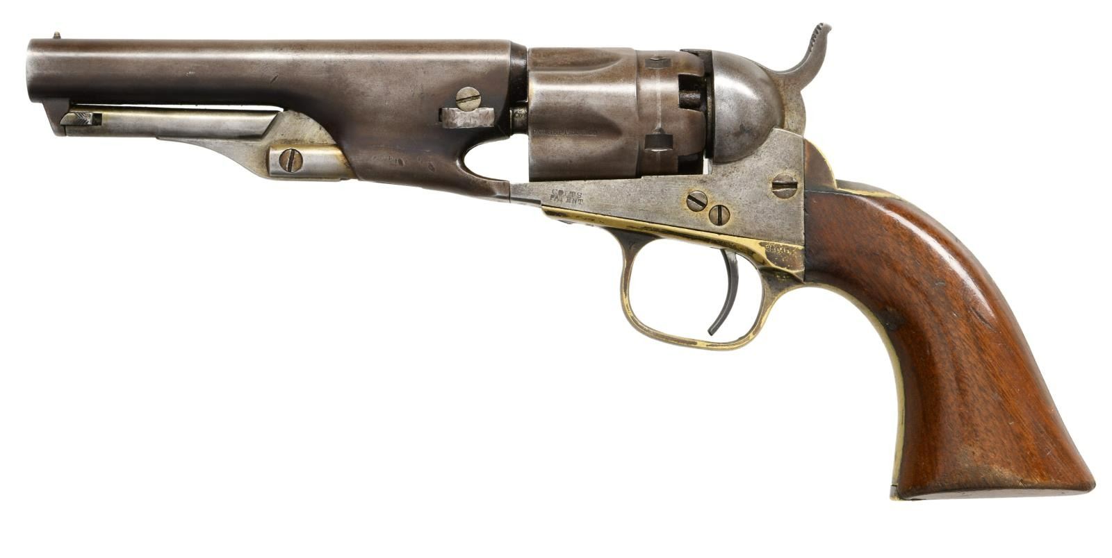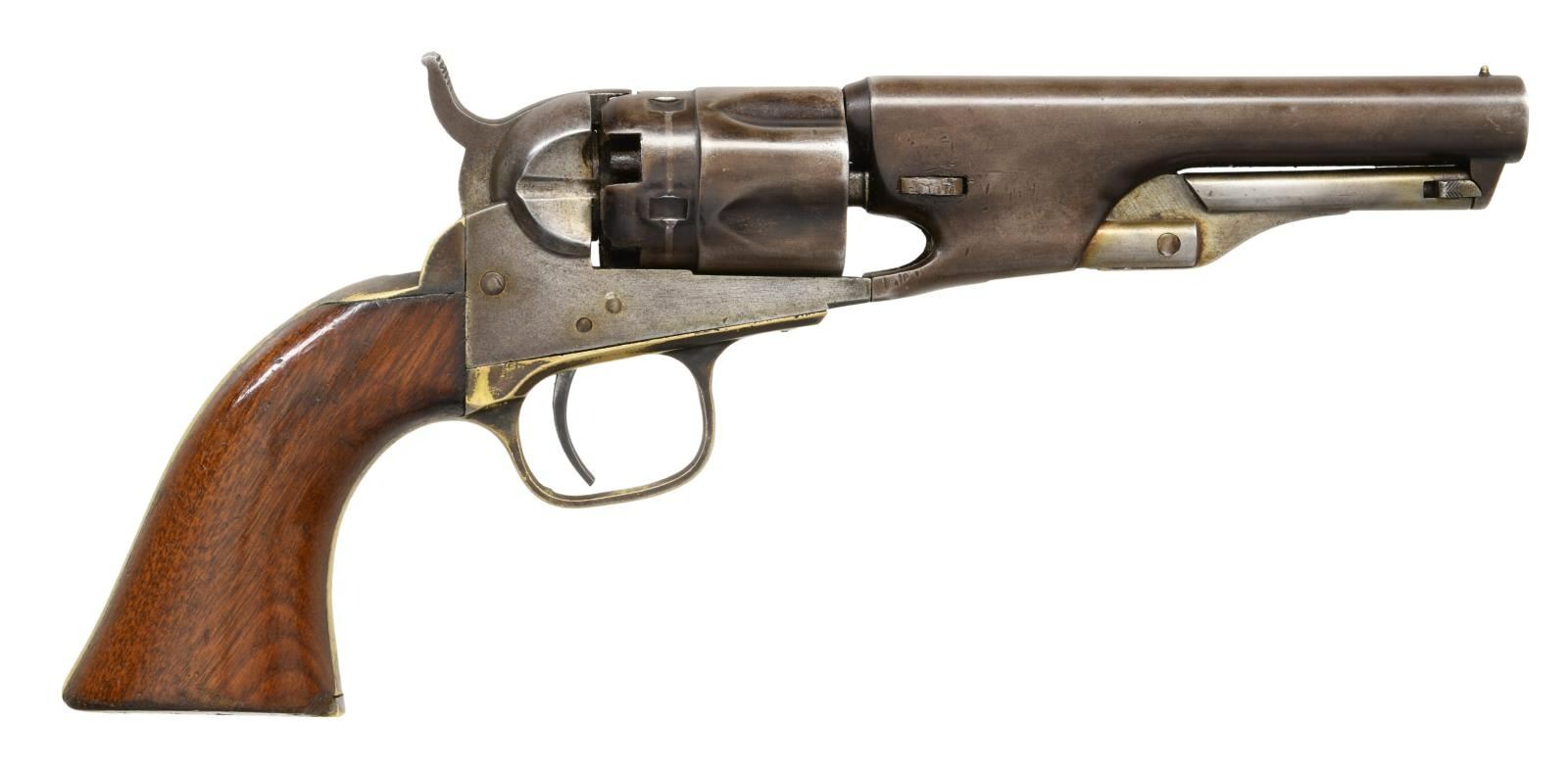 Cal. 36. S#. 21248. Bbl.4 1/2" round with bead sight & New York address. Rebated & fluted 5 shot cyl. Creeping style loading lever. Blue & case colored finish with silver finished brass backstrap & trigger guard. 1 piece walnut grip. Bbl., frame, grip straps & wedge have matching S#. The letter "L" is marked above or below the S# on major parts. 1863 mfg. CONDITION: Metal finish has faded to a mottled patina. Brass grip straps retain 20% silver having a dark tarnish. Grips have added finish over wear, small dents and handling marks with small chip at the toe of the right panel. Action has weak spring tension. Pitted bore retains largely intact rifling. PROVENANCE: Marshall "Brook" Davis Collection. (01-23537/DS). ANTIQUE. $1500-2500.
