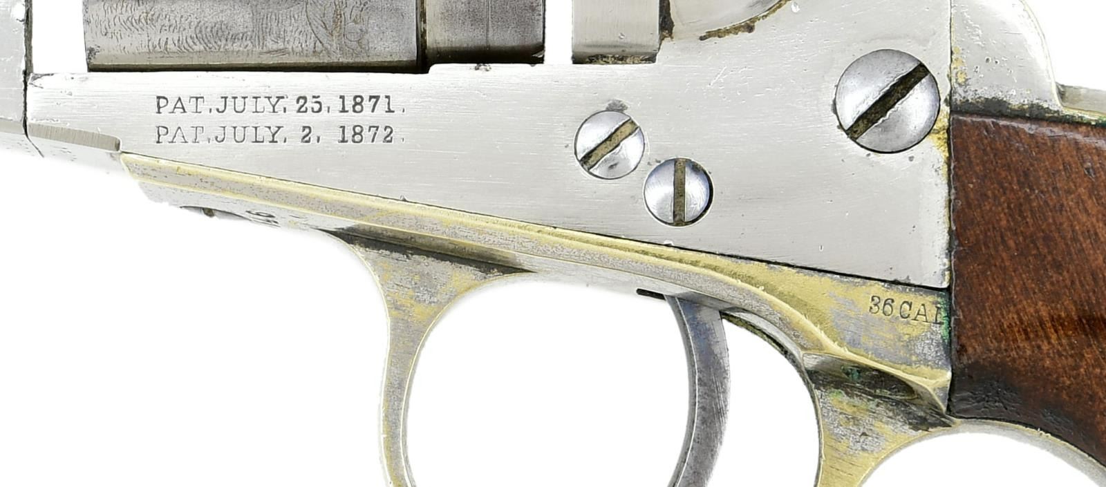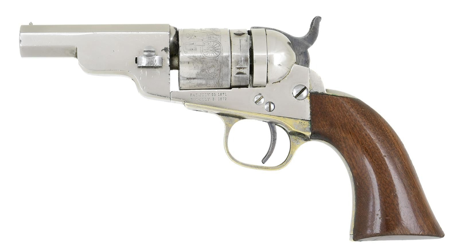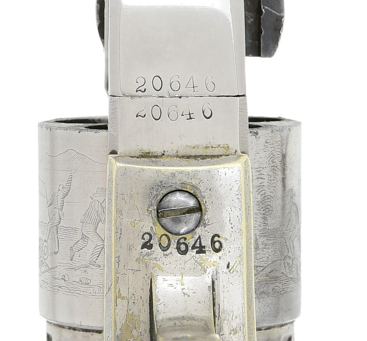 Cal. 38RF. S# 20646. Bbl 3". Nickel plated frame, bbl and cylinder. 5-shot rebated cylinder with battle scene. 2 Piece hardwood grips. CONDITION: metal overall retains 85% original finish with notable thinning to grip frame along with scattered light dents and scratches. Grips show finish wear at edges with scattered light handling marks. Bore retains intact rifling with dark appearance. (01-24255/BH). ANTIQUE. $900-1,300.