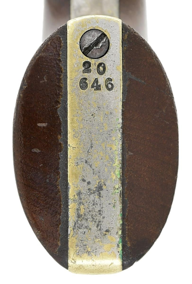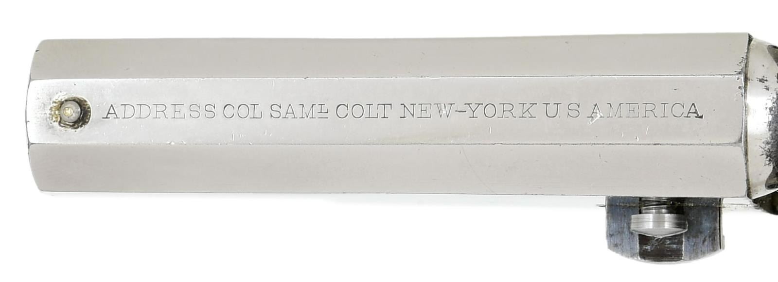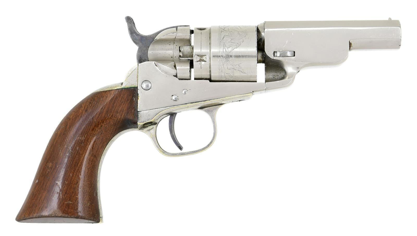 Cal. 38RF. S# 20646. Bbl 3". Nickel plated frame, bbl and cylinder. 5-shot rebated cylinder with battle scene. 2 Piece hardwood grips. CONDITION: metal overall retains 85% original finish with notable thinning to grip frame along with scattered light dents and scratches. Grips show finish wear at edges with scattered light handling marks. Bore retains intact rifling with dark appearance. (01-24255/BH). ANTIQUE. $900-1,300.