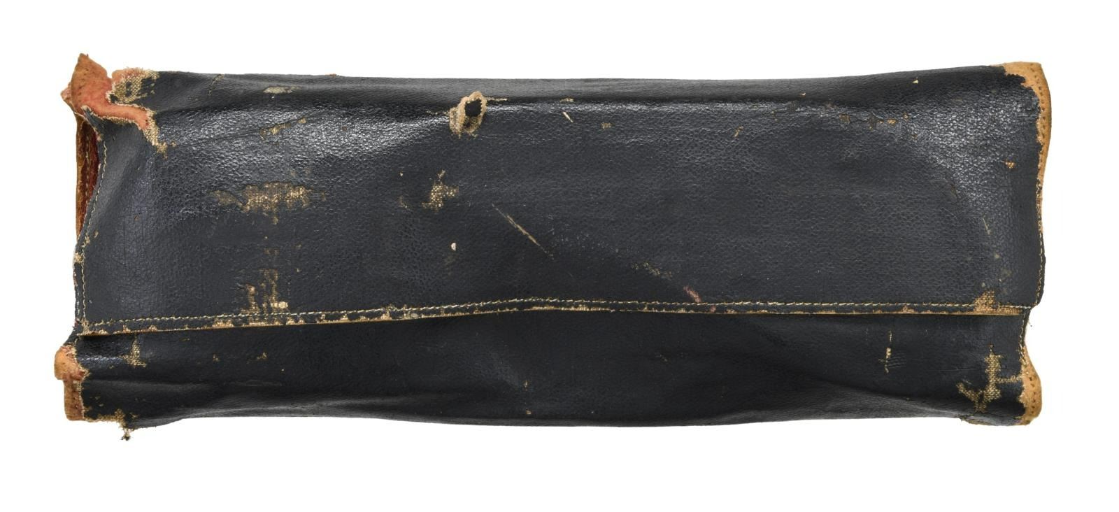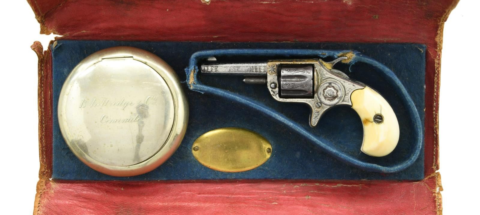 GRIPS IN KITTREDGE & CO LEATHER TRAVEL CASE. Cal. 22. S# 21077. Nickel plated revolver with 2-1/8" flat side barrel has Colt info on top. Left side is etched "COLT NEW 22". Cylinder is of long fluted 2nd model type. Solid frame single action with circular boss on left side has gold plated hammer with spur trigger. Grips are plain ivory. Pistol is engraved with near full coverage sprays of scroll within geometric and line borders. Pistol is housed in three fold black Morocco leather wallet lined in red Morocco which surrounds central blue cloth lined platform with compartment for revolver offset by 3-1/2" diameter German silver container with hinged top embossed "B. Kittredge & Co" "Cincinnati" (arms dealer 1845-91). A vacant brass oval is also tacked on to base. CONDITION: good. Revolver retaining 60-70% nickel finish with some bubbling and loss mostly on top strap. Cylinder shows some pitting and is gray patina. Some gold plate remains on hammer. Grips show considerable cleaning and old cracks. Bore is good. Mechanically good. Leather shows some losses on edges along with some minor tears. Interior cloth shows some rubbing and wear mostly from contact with hammer spur. (01-23954/MGM). ANTIQUE. $2,500-3,500.
