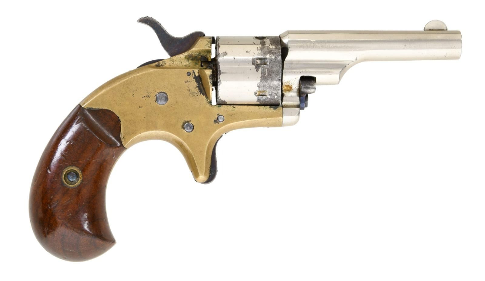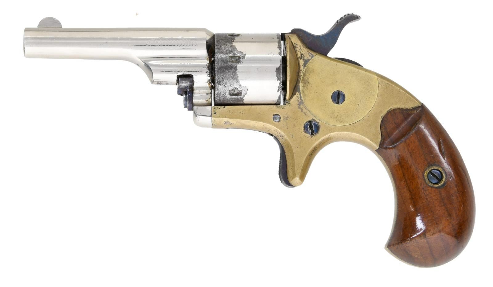 Cal. 22 Short. S# 81975. Bbl 2 3/8". Open Top Pocket revolver manufactured by Colt in 1876. The top of the barrel is stamped with Colt's 2 line address, with "22 CAL" on the left side of the frame. Brass frame, with 2 piece smooth wood grips. Nitre blued hammer and trigger, with nickel plated cylinder and barrel. Matching numbers are present on the frame and barrel. Grips are matching via a handwritten number in pencil on the interior of the panels. CONDITION: frame exhibits a pleasing patina, with some darker spots of discoloration. Cylinder exhibits flaking, with pitting on the front and rear faces. Barrel retains bountiful amounts of its nickel plated finish. Bright bore, exhibiting good rifling throughout. Grips show some scattered marks from handling and storage, but are otherwise good overall. (01-23427/MLW). ANTIQUE. $250-400.