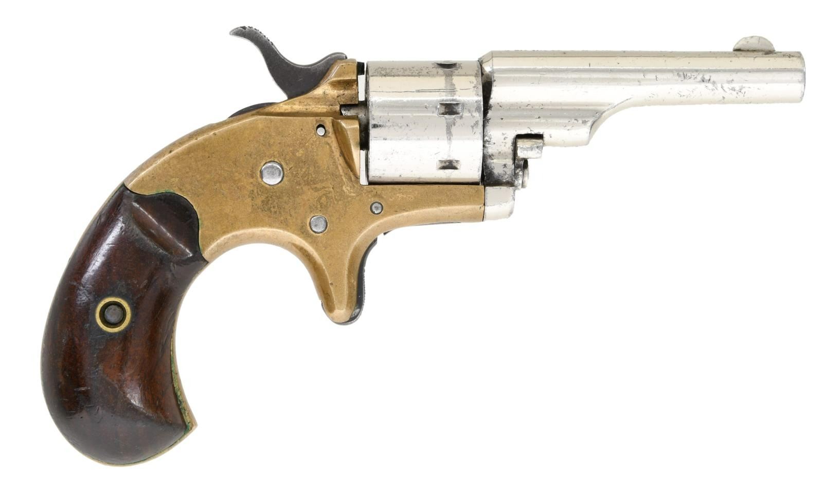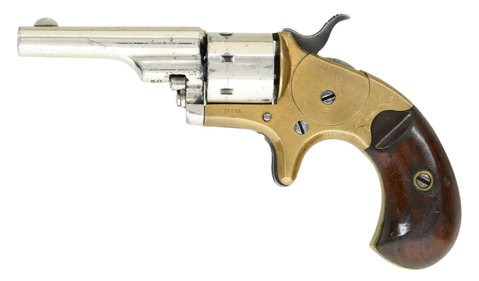 Cal. 22 Short. S# 50733. Bbl 2 3/8". Open Top Pocket revolver manufactured by Colt in 1875. The top of the barrel is stamped with Colt's 2 line address, with "22 CAL" on the left side of the frame. Brass frame, with a blued trigger and hammer, as well as a nickel plated barrel and cylinder. Frame is mounted with 2 piece smooth wood grips. Matching numbers are present on the frame and barrel. CONDITION: brass frame exhibits a pleasing mellow patina. Cylinder and barrel retain the vast majority of their nickel plated finish, exhibiting some spots of light pitting and dark discoloration. Dark bore, exhibiting pitting and good rifling throughout. Grips exhibit scattered marks and impressions from handling and storage, and some wear to the varnish, but otherwise remain sturdy and serviceable. (01-23437/MLW). ANTIQUE. $250-400.