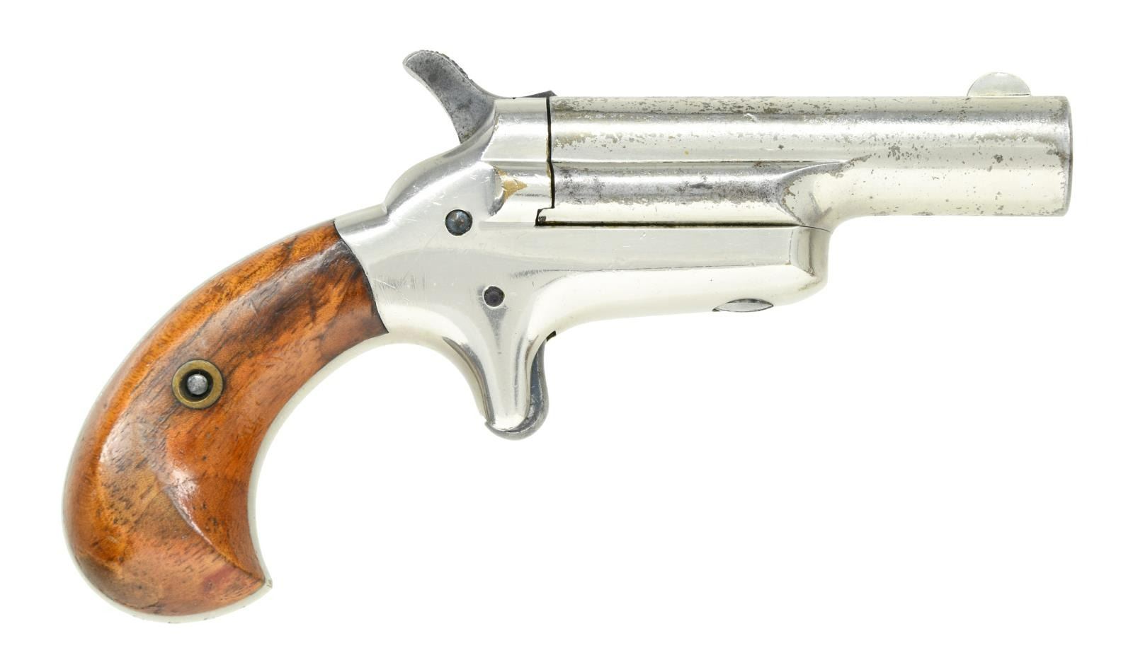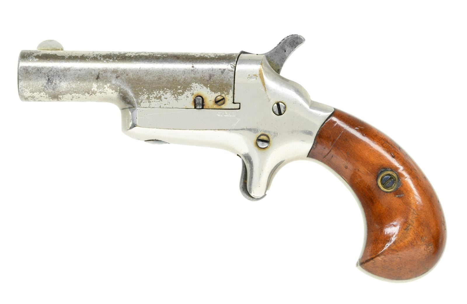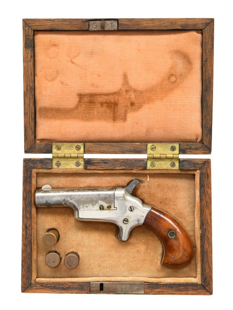 VARIATION DERRINGER. Cal. 41. S# 1528. Standard configuration, 2.5" barrel, nickel plated, large slanted block letters "COLT", spur trigger, 2 piece varnished walnut birds head grips. Housed in old French fitted case which appears contemporary to manufacture in late Victorian era. CONDITION: very good overall, frame retains most of its original nickel finish and barrel retains about 70%. Small British proofs found on frame and barrel. Grips retain most of their original factory varnish. Casing is very good overall, red lining is heavily faded. PROVENANCE: Little John's Auction 1998, Exemplary Colt collection of Horst Kreiner. (23-5000/JS). CURIO. $600-800.