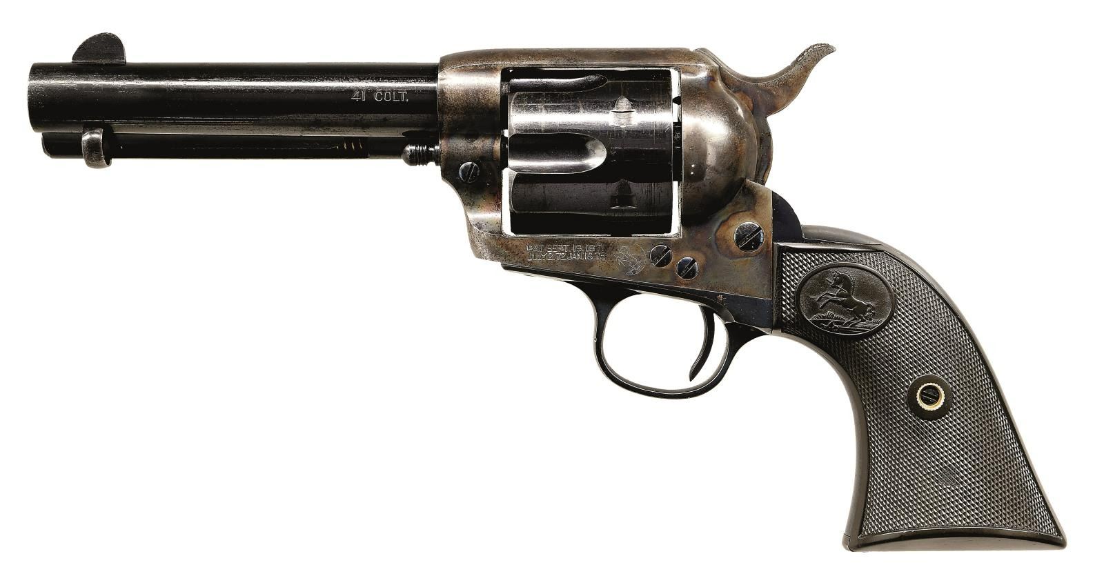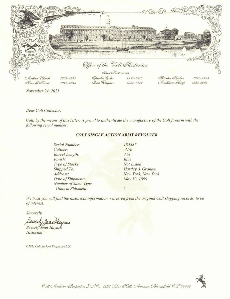 MODEL REVOLVER CHAMBERED IN SCARCE 41 COLT. Cal. 41 Colt. S# 185887. Manufactured in the late 1890s, this superb condition Single Action revolver has survived in almost new condition with exceptional bright blue finish and little, if any, signs of wear. Shipped to Hartley & Graham Co in New York City in 1899. It is one of the last black powder revolvers made and is known as a "transition" model to Colt collectors. This revolver still retains the small, original black powder front sight and narrow land rifling appropriate for accuracy with black powder loads, is not guaranteed for smokeless powder and has no verified "VP" mark on the trigger guard. It is 100% factory original with a sharp, bright bore and mechanics are as new. This revolver is chambered for the original 41 Colt cartridge, the supposed favorite of Billy "the kid" Bonney, and is very difficult to find today in this exceptional condition (a mere 5% of SAAs were chambered in this caliber). It would be very difficult to duplicate the condition of this fine gun. UNATTACHED ACCESSORIES: Colt Archive letter confirms specifications of the gun and further stating date of shipment: May 10, 1899. Number of same type guns in shipment: 5. CONDITION: very fine. Bbl. and cyl. retain over 90% blue showing scattered dull spotting and edge wear. Frame and hammer retain over 85% lightly muted case colors showing spots of freckling and darkened appearance. Grips are very good showing some flattened checkering diamonds. Crisp mechanics. Bore retains sound rifling showing some light pitting. (23-1814). CURIO. $14,000-18,000.