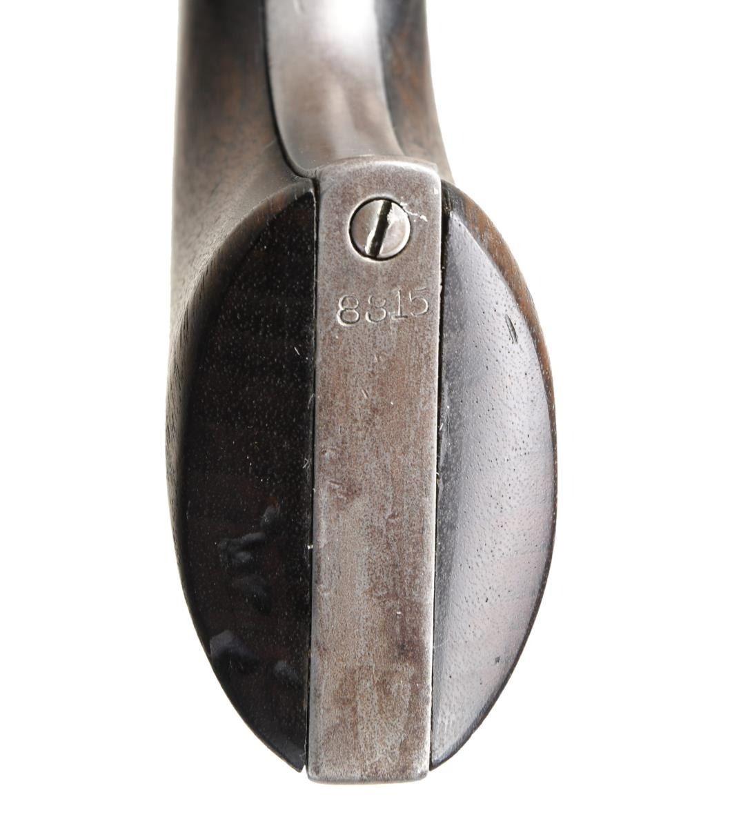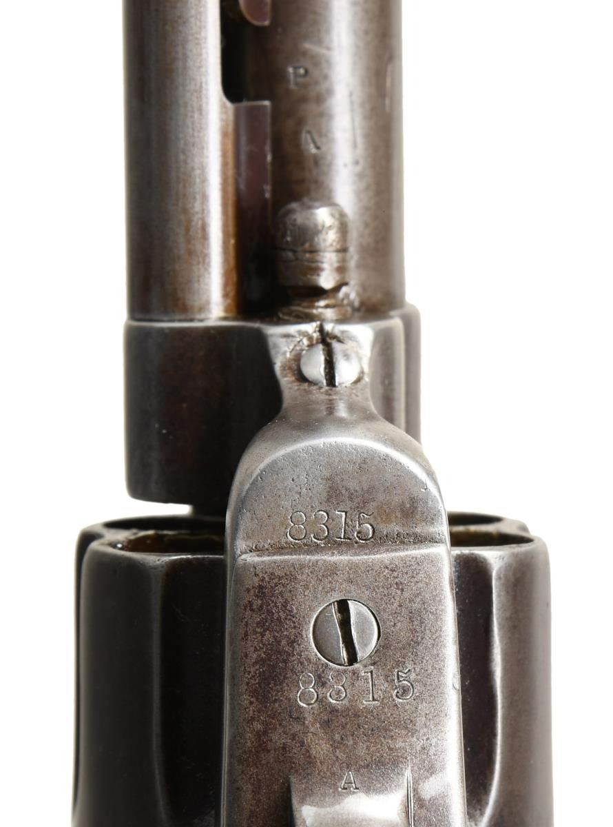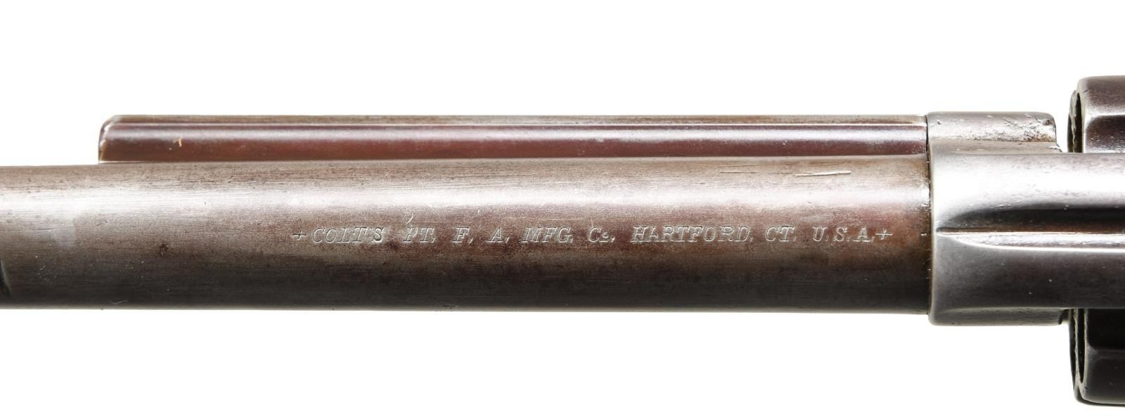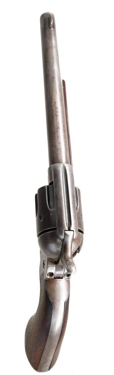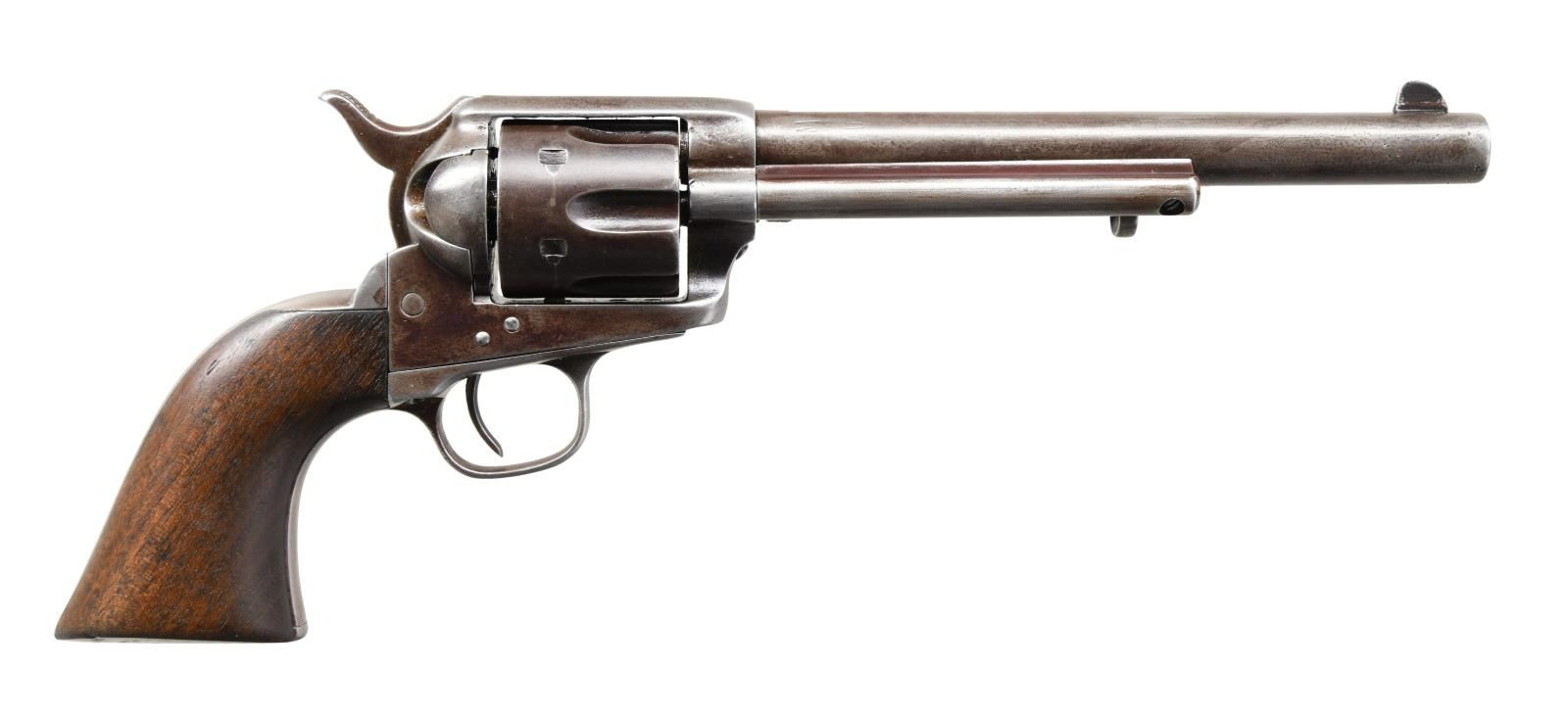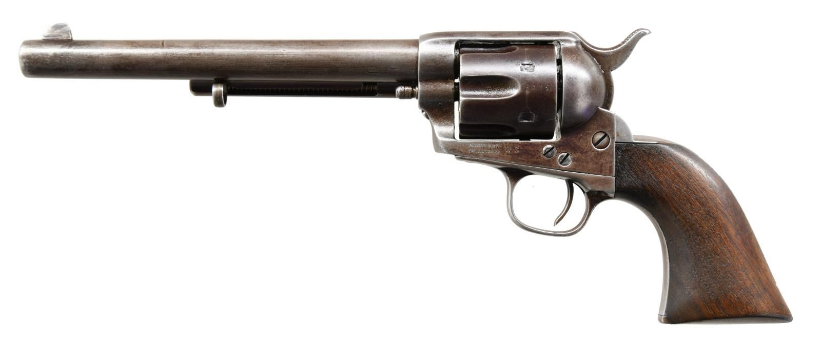 REVOLVER. Cal. 45. S# 8315. This revolver was manufactured in 1874 is in the standard configuration of cavalry issued revolvers of the Indian War era, 7.5" barrel with one line slanted Hartford address with daggers. Frame is stamped along with two line patent dates with small "U.S.". Small "A" inspection marks found on barrel, trigger guard, back strap, and cylinder. UNATTACHED ACCESSORIES: 1999 letter from Colt archives stating that there was no information on this gun. CONDITION: good to very good overall, appears all matching & original, gray patina, markings all discernible, groups have hand worn patina and no hint of remaining inspectors cartouche with heavy edge wear. Mechanics are very good, good rifled bore. PROVENANCE: John Kopek 1998, Collection of Horst Kreiner. (01-24008/JS). ANTIQUE. $8,000-12,000.