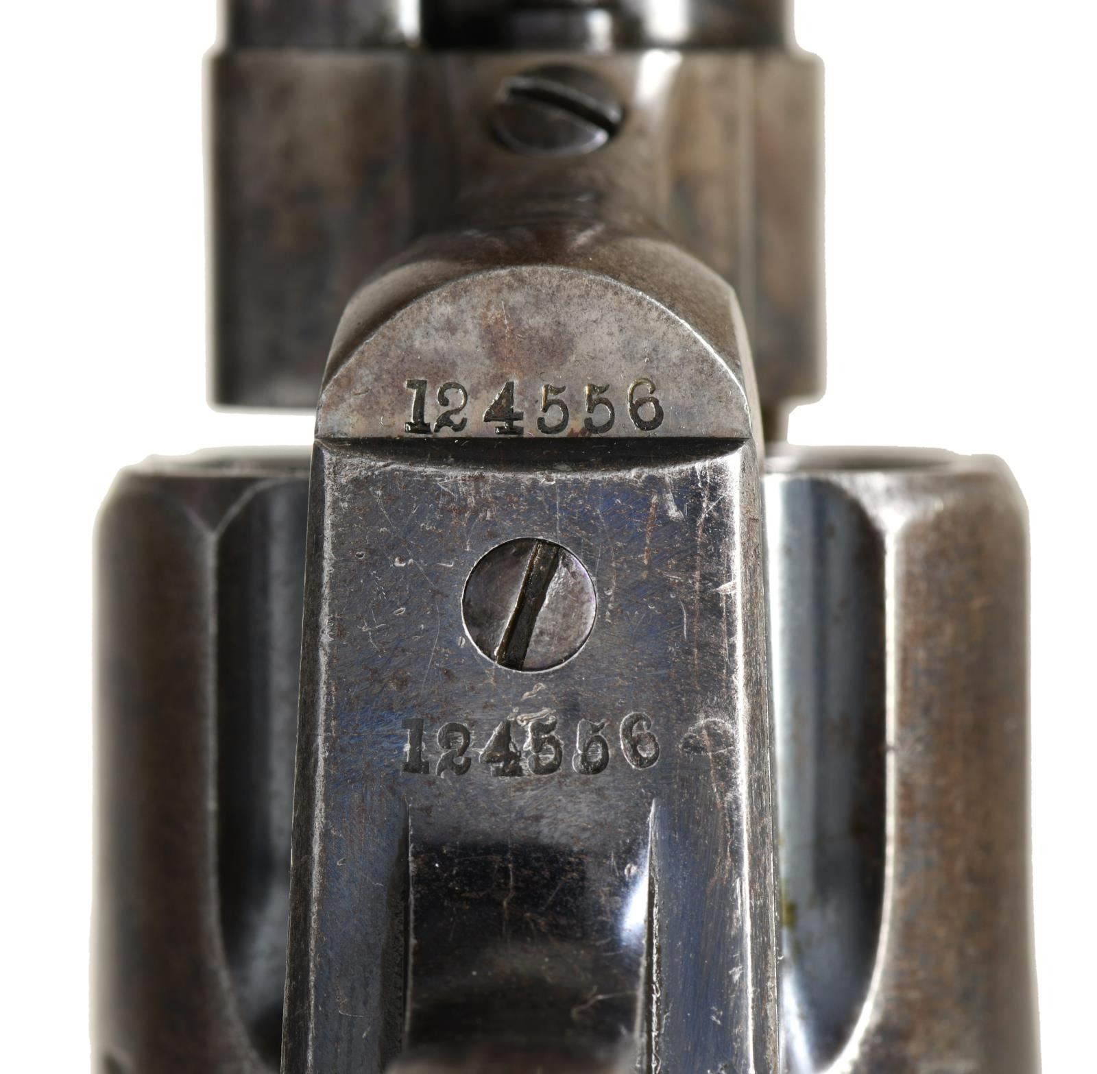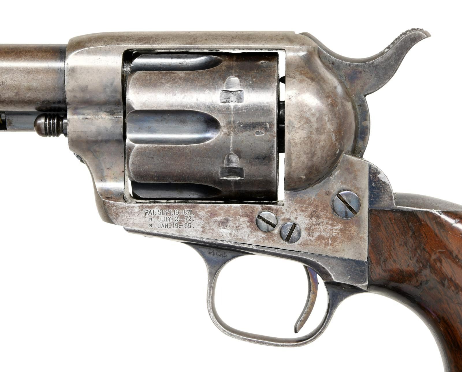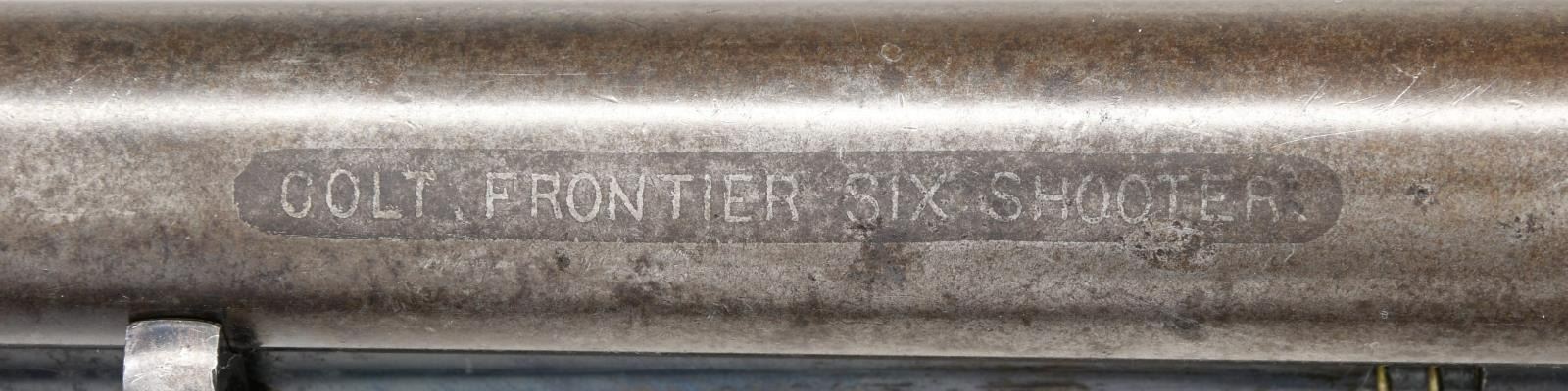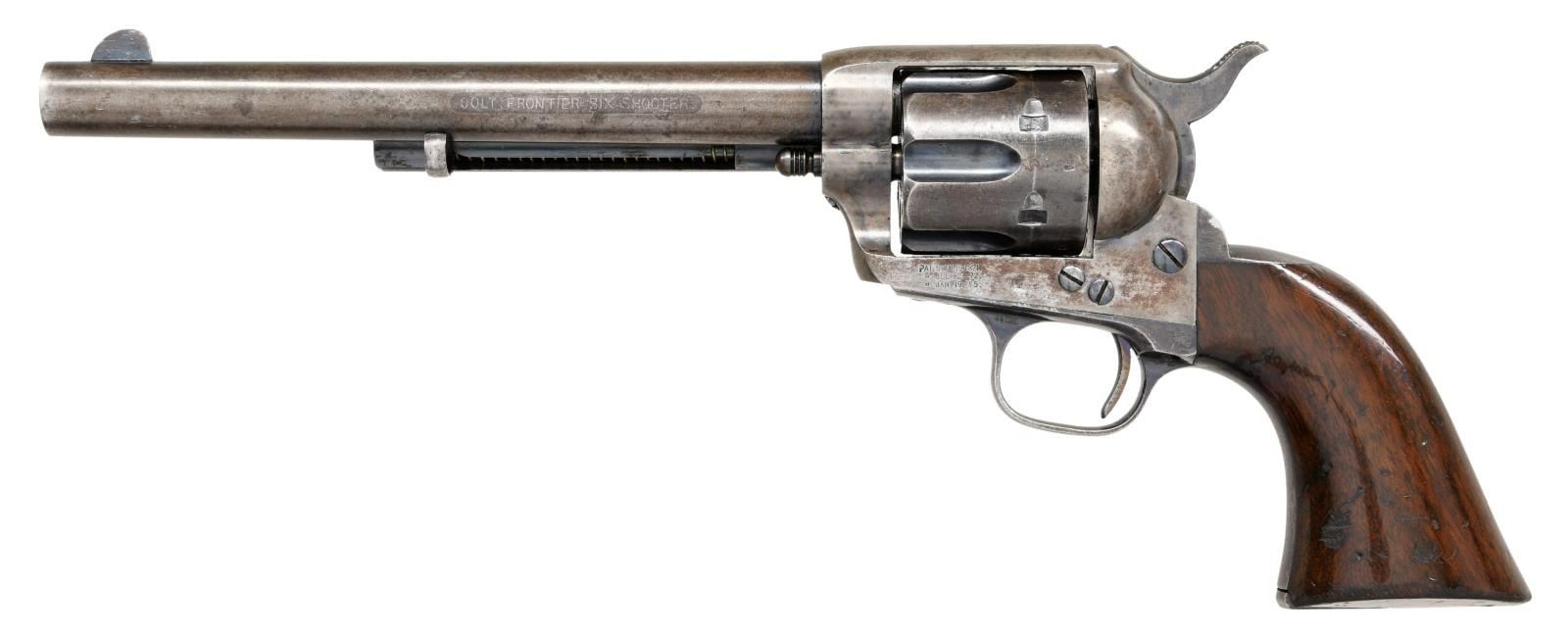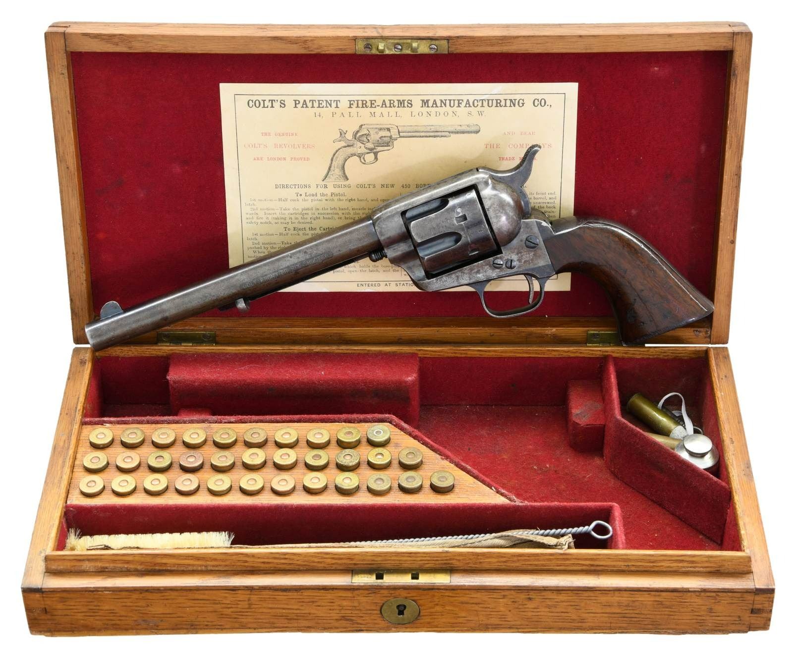 SHOOTER" SINGLE ACTION ARMY REVOLVER. Cal. 44-40. S# 124556. Standard configuration, 7.5" barrel, full round front sight, one-line Hartford address, "COLT FRONTIER SIX SHOOTER" etched panel on left side, crisp "44" and small London proofs forward of the base pin. "44CAL" stamped on left front web of trigger bow. Frame stamped on left side with three-line patent marks, right side stamped P9503 in large font upside down dies, mounted with high polish varnished grips. This revolver was one of 110 Frontier Six Shooters shipped to the London agency in 1887. The accompanying red baize lined English oak case has illustrated directions paste inside lid. Case is fitted for a Dixon pewter oiler, cleaning brush and three piece slotted rod. CONDITION: fine overall, revolver retains about 20% bright factory blue especially in protected areas, traces of case colors, balance of metal is smooth gray patina, markings are crisp. Mechanics are fine, crisp rifled bore. Grips retain about 90% of their original factory varnish with moderate edgewear and scattered dents and scratches. Casing very good with expected wear and soiling to lining, pasted direction label is fine. PROVENANCE: revolver Little John's Auction 2000. Case & accessories Mel Torme, Collection of Horst Kreiner. (01-24011/JS). $8,000-12,000.