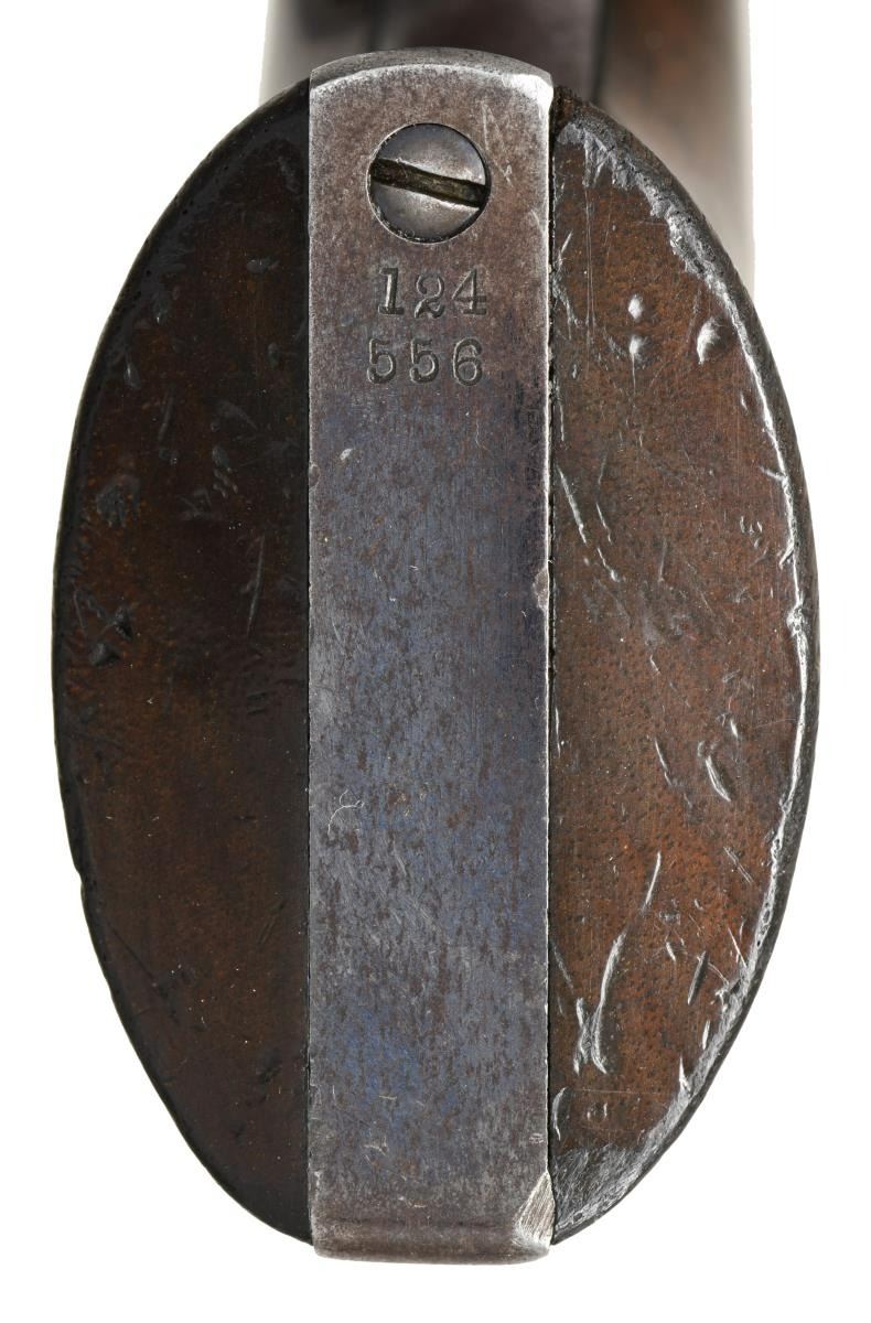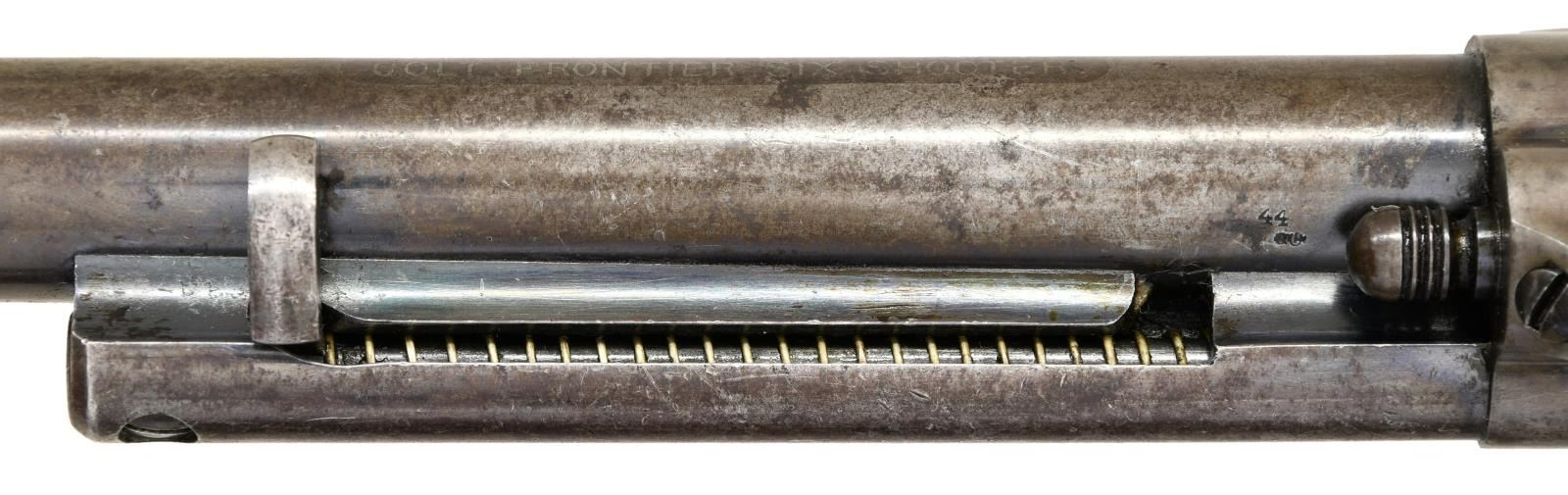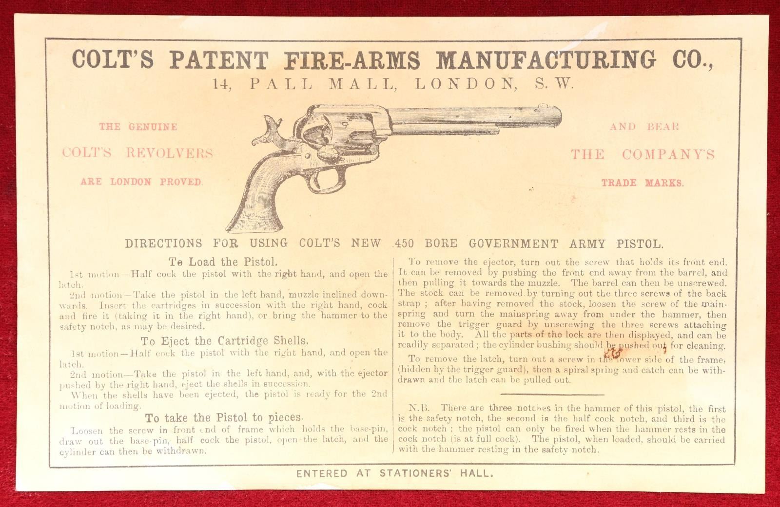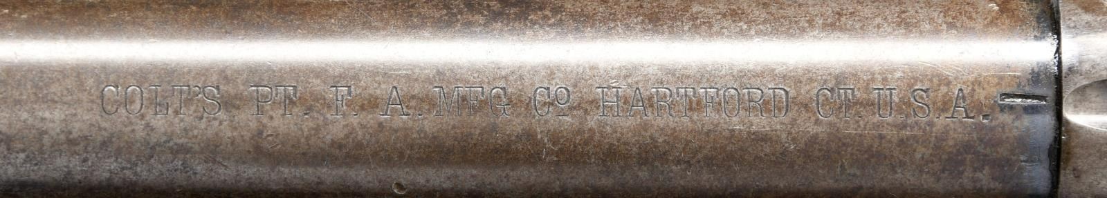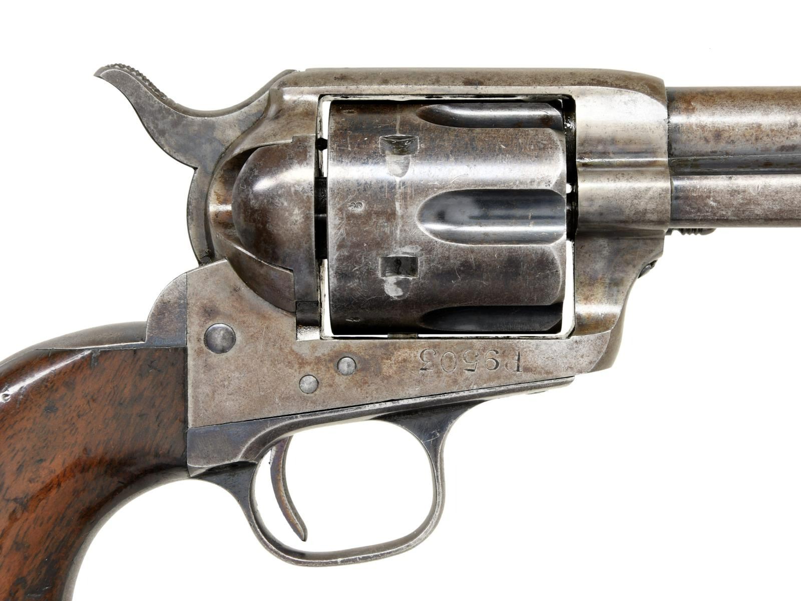 SHOOTER" SINGLE ACTION ARMY REVOLVER. Cal. 44-40. S# 124556. Standard configuration, 7.5" barrel, full round front sight, one-line Hartford address, "COLT FRONTIER SIX SHOOTER" etched panel on left side, crisp "44" and small London proofs forward of the base pin. "44CAL" stamped on left front web of trigger bow. Frame stamped on left side with three-line patent marks, right side stamped P9503 in large font upside down dies, mounted with high polish varnished grips. This revolver was one of 110 Frontier Six Shooters shipped to the London agency in 1887. The accompanying red baize lined English oak case has illustrated directions paste inside lid. Case is fitted for a Dixon pewter oiler, cleaning brush and three piece slotted rod. CONDITION: fine overall, revolver retains about 20% bright factory blue especially in protected areas, traces of case colors, balance of metal is smooth gray patina, markings are crisp. Mechanics are fine, crisp rifled bore. Grips retain about 90% of their original factory varnish with moderate edgewear and scattered dents and scratches. Casing very good with expected wear and soiling to lining, pasted direction label is fine. PROVENANCE: revolver Little John's Auction 2000. Case & accessories Mel Torme, Collection of Horst Kreiner. (01-24011/JS). $8,000-12,000.