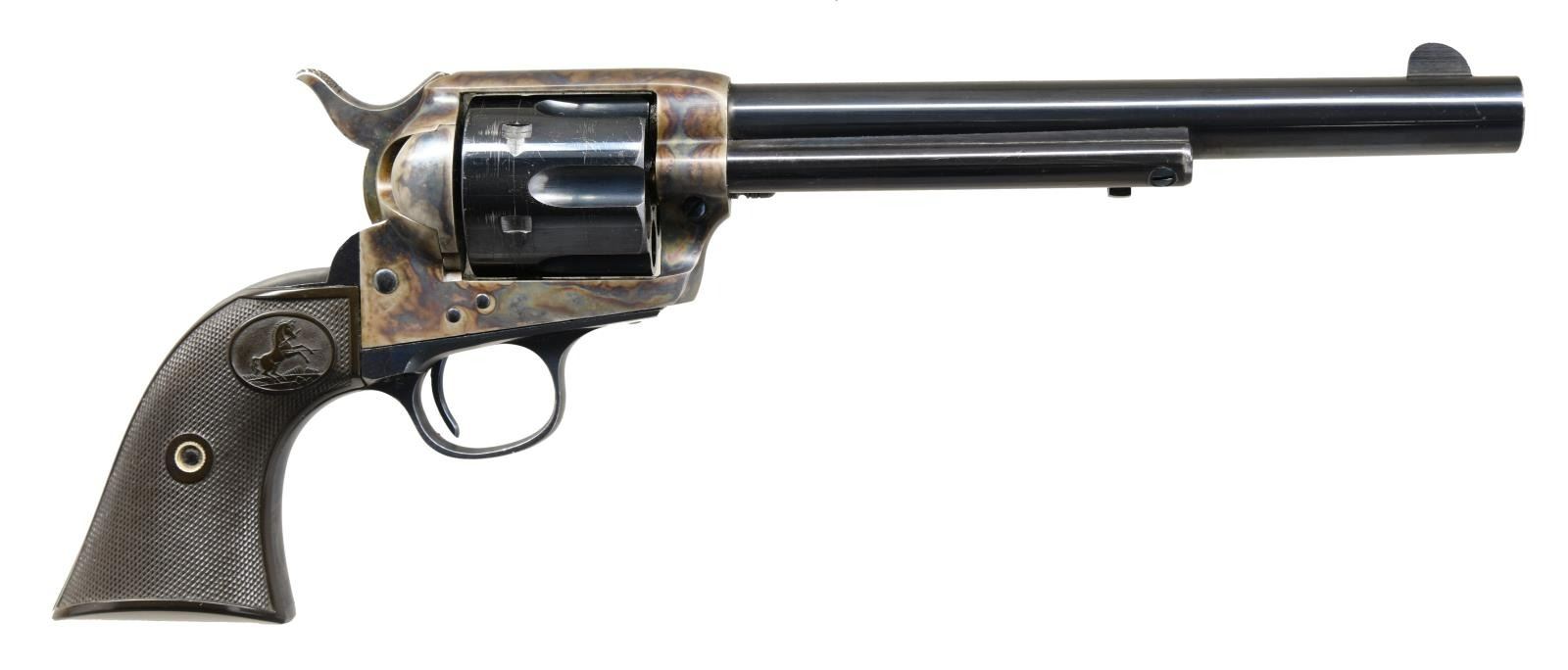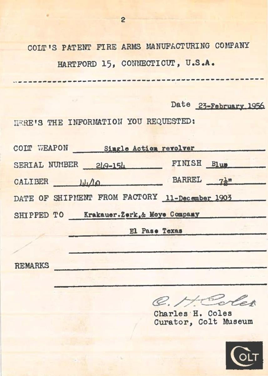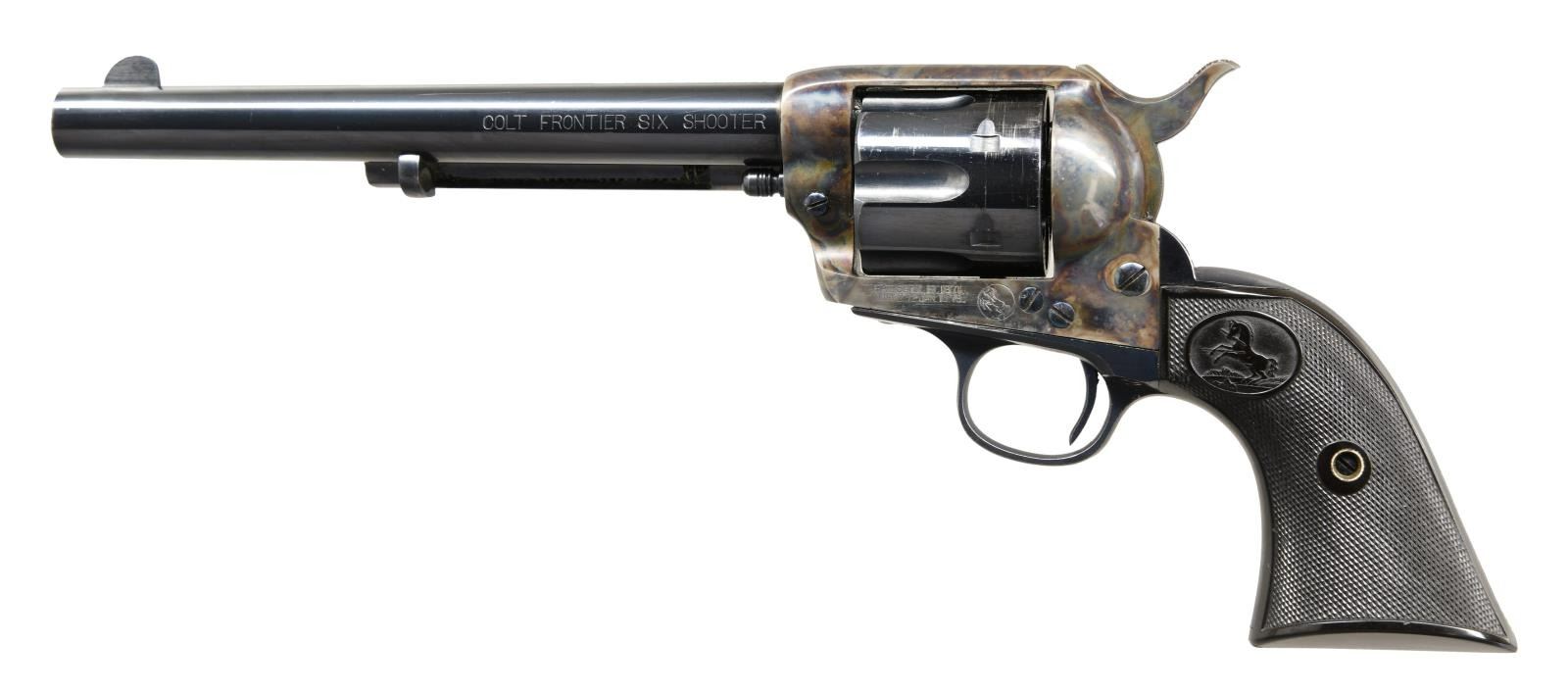 FRONTIER SIX SHOOTER SHOOTER SAA REVOLVER. Cal. 44-40. S# 249154. The introduction of the Colt Frontier Six shooter met with great success amongst Westerners due to the fact that its ammunition was interchangeable with Winchester's popular 1873 model thus eliminating the need to carry multiple calibers. Bbl. 7 1/2" with blade front sight and marked on left side "COLT FRONTIER SIX SHOOTER". 2 Line, 3 patent date on left side of frame. Case hardened frame & hammer. Blued bbl., 6 shot fluted cyl. & grip frame with fire blued screws & trigger. Checkered black hard rubber grips with Rampant Colt in oval. Mfg. 1903. UNATTCHED ACCESSORIES: Colt Firearms research letter stating the following: "COLT WEAPON Single Action Revolver / SERIAL NUMBER 249-154 FINISH Blue / CALIBER 44/40 BARREL 7 1/2" / DATE OF SHIPMENT FROM FACTORY 11-December 1903 / SHIPPED TO Krakauer. Zerk, & Moye Company / El Paso Texas". CONDITION: overall very fine. Frame & hammer retain 97% of their original bright and vivid case colors. Bbl., grip frame & cyl. retain 95% original blue with light high edge wear. Cyl. exhibits light uniform finish scratches. Fire blued components retain better than 90% of their delicate but attractive finish. Near excellent grips. Very good bore with sharp rifling. (23-5041/BH). CURIO. $7,000-12,000.