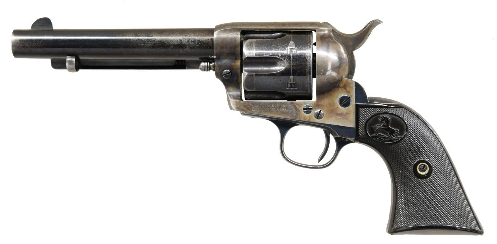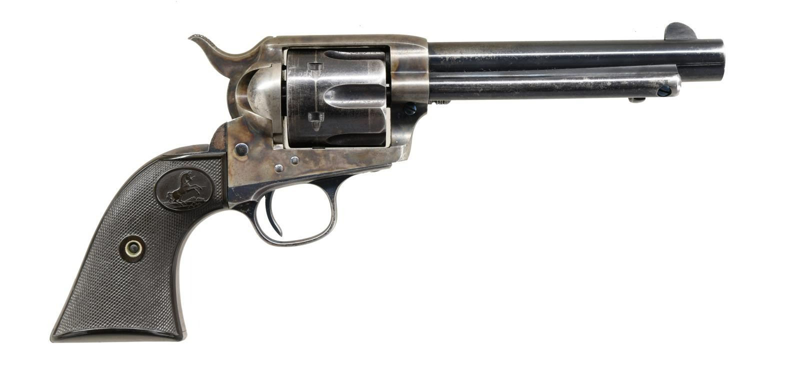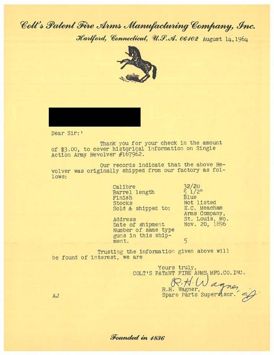 FACTORY LETTER. Cal. 32 WCF. S# 167962. Bbl. 5 1/2". Marked on top "COLT'S PT. F. A. MFG Co HARTFORD CT. U.S.A.". Left side of frame marked w/ 2 line 3 date patent. Case hardened frame & hammer. Blued steel bbl., grip frame & six shot fluted cyl. Fire blued screws & trigger. Black checkered hard rubber grips w/ rampant colt in ovals. UNATTACHED ACCESSORIES: Colt factory letter stating the following "Calibre 32/20 / Barrel length 5 1/2" / Finish Blue / Stocks Not listed / Sold & shipped to E.C. Meacham Arms Company / Address St. Louis, Mo. / Date of shipment Nov. 20, 1896 / Number of same type guns in shipment. 5". CONDITION: grip straps have thinned to gray w/ brown patina. Bbl. & cyl. retain 60% original blue w/ thinning finish, scattered scratches & peppery oxidation. Ejector rod head & corresponding area at underside of bbl. display marrs from improper cyl. rod removal. Frame retains 50% lightly muted case colors; stronger in protected areas w/ scattered peppery oxidation. Mechanically fine. Good bore shows light oxidation w/ strong rifling. (01-24251/BH). ANTIQUE. $3,250-5,500.
