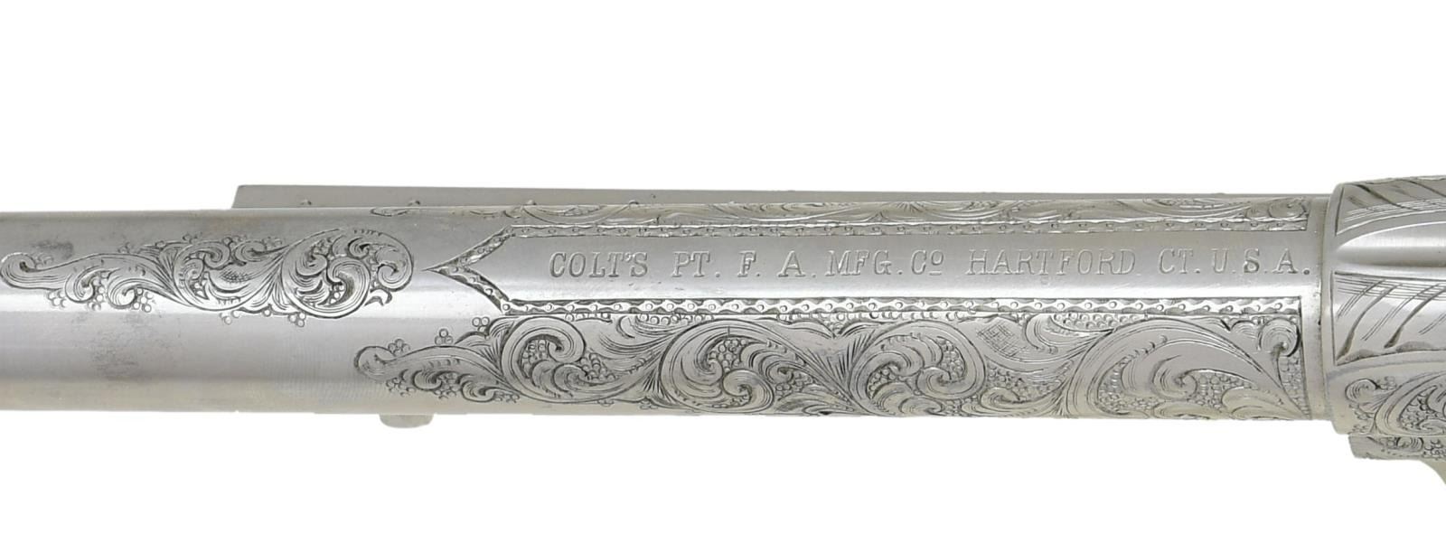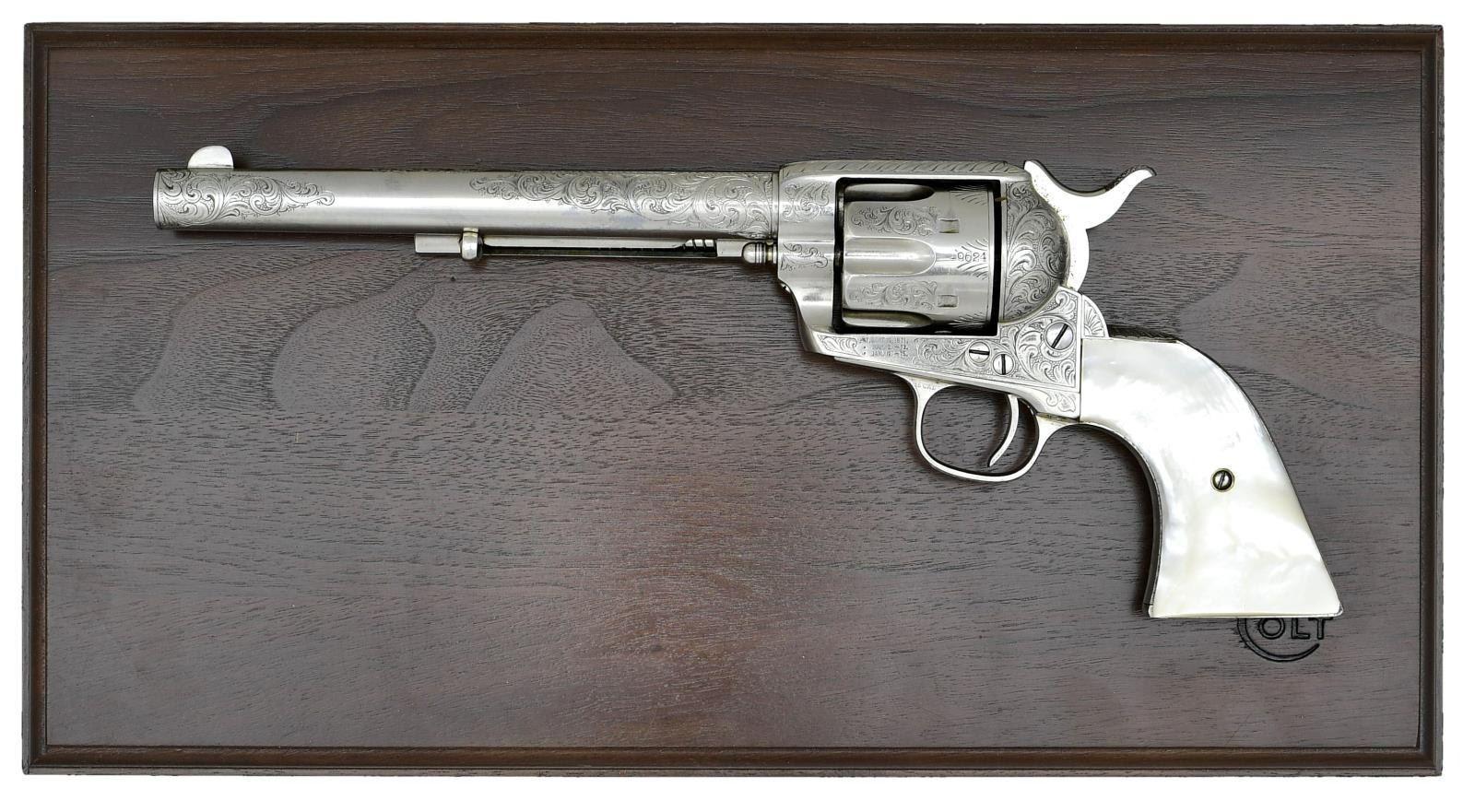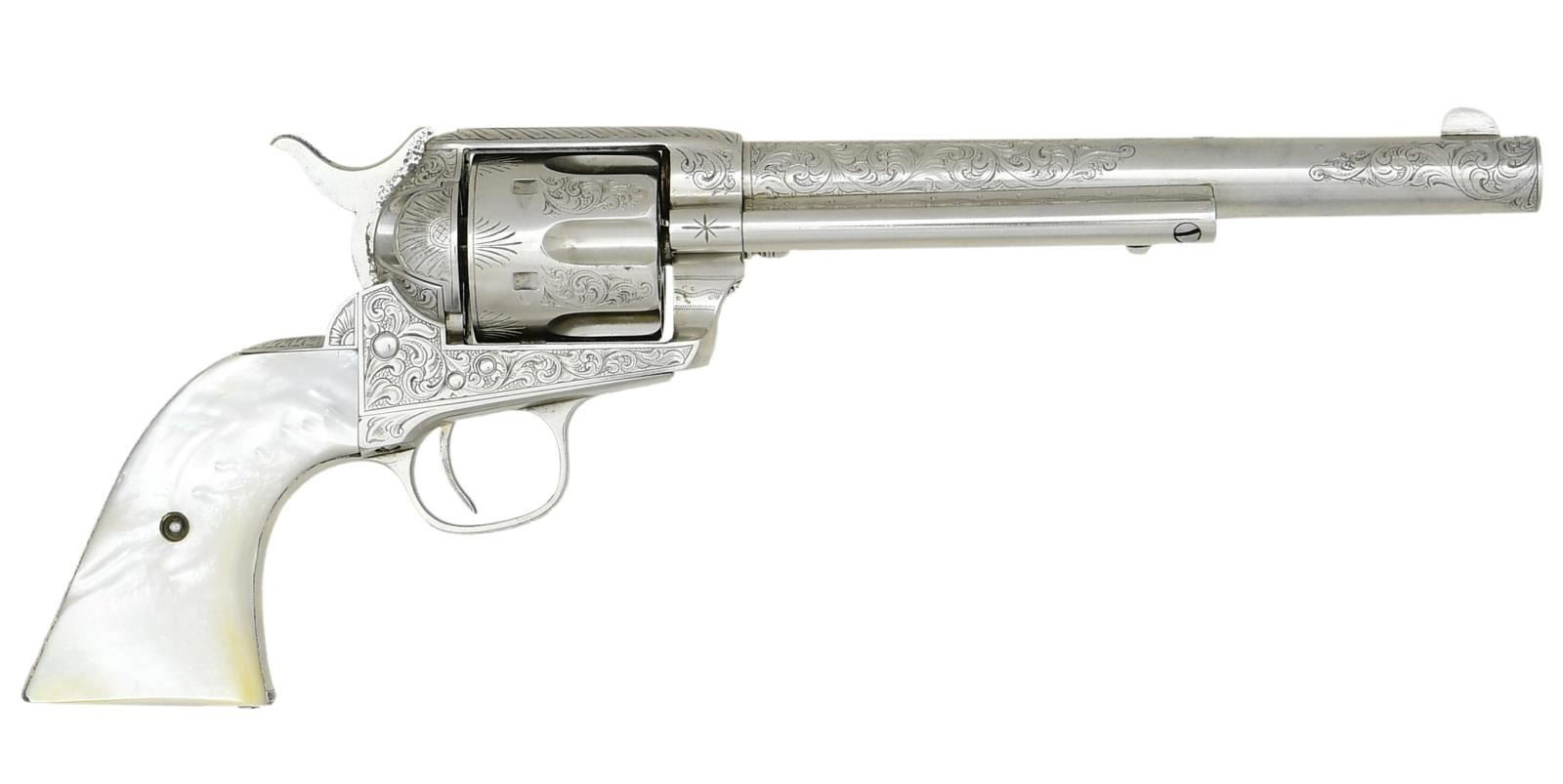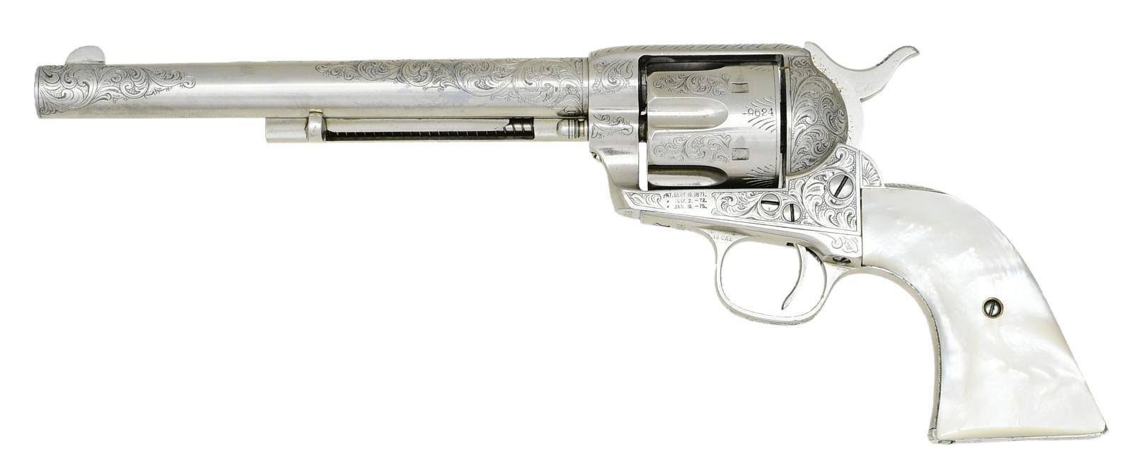 Cal. 45. S# 29624. Standard configuration, 7.5" barrel with Hartford address. Small "45CAL" stamped on left trigger bow, three-line patents stamped on left frame. Colt factory letter shows gun shipped to JP Moore, NYC November 1876 in a shipment of 50 guns. JP Moore customized original plain blue gun with engraving & nickel plating, often associated with Nimschke. Mounted with two-piece mother of pearl grips. UNATTACHED ACCESSORIES: "Colt Factory letter". Modern Colt logoed box, French fitted purple velvet for display. CONDITION: fine overall retains virtually all of its nickel finish & well discerned engraving and markings. Matching serial numbers found on barrel, prime, trigger guard, backstrap, and cylinder. Mechanically fine, good discernible rifled bore. PROVENANCE: E. M. Morgan collection 1994, Collection of Horst Kreiner. (01-24009/JS). $5,000-8,000.