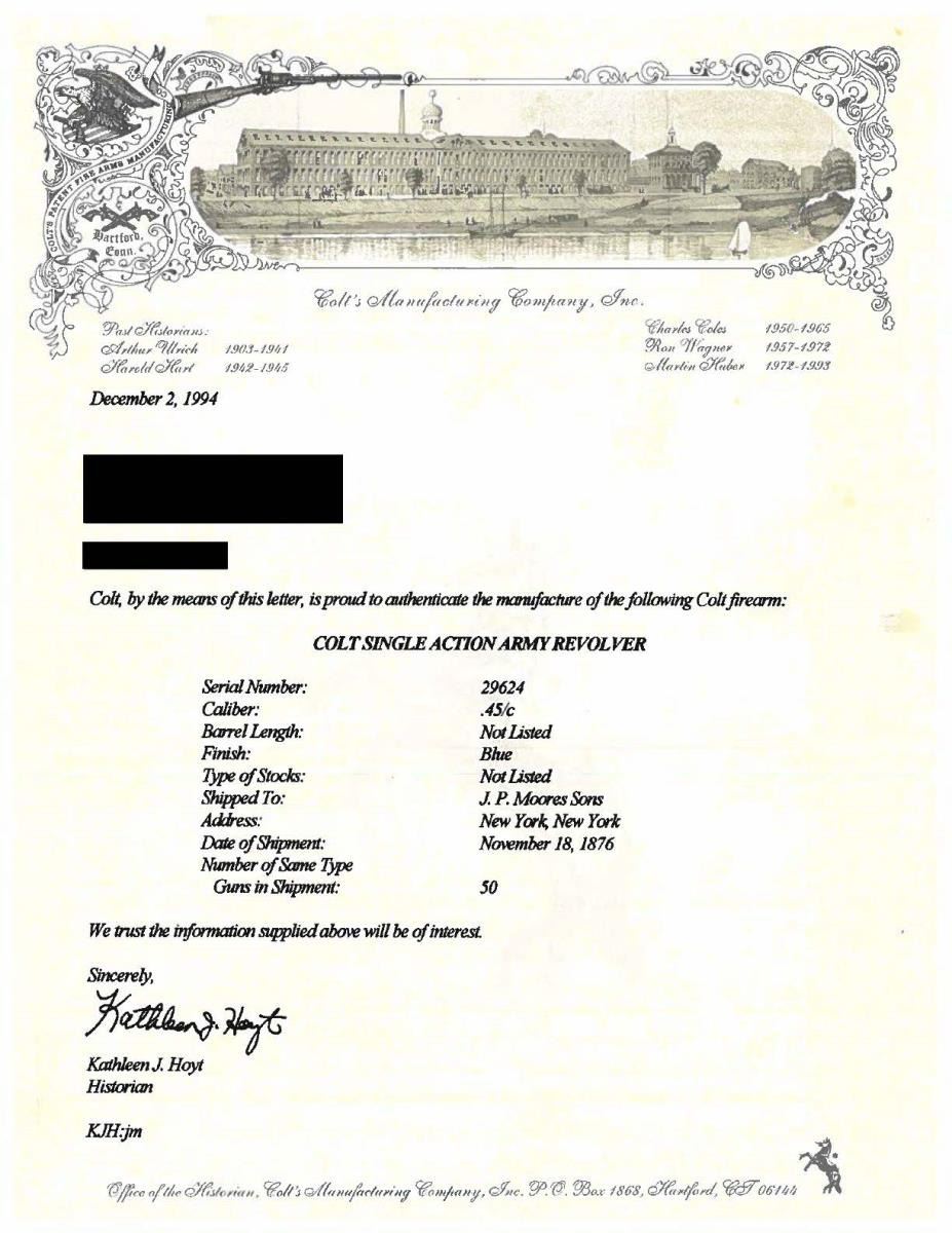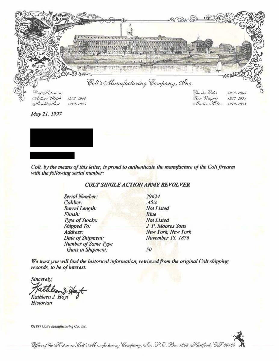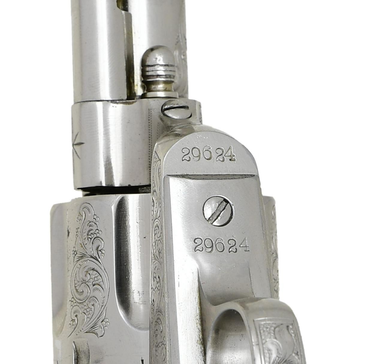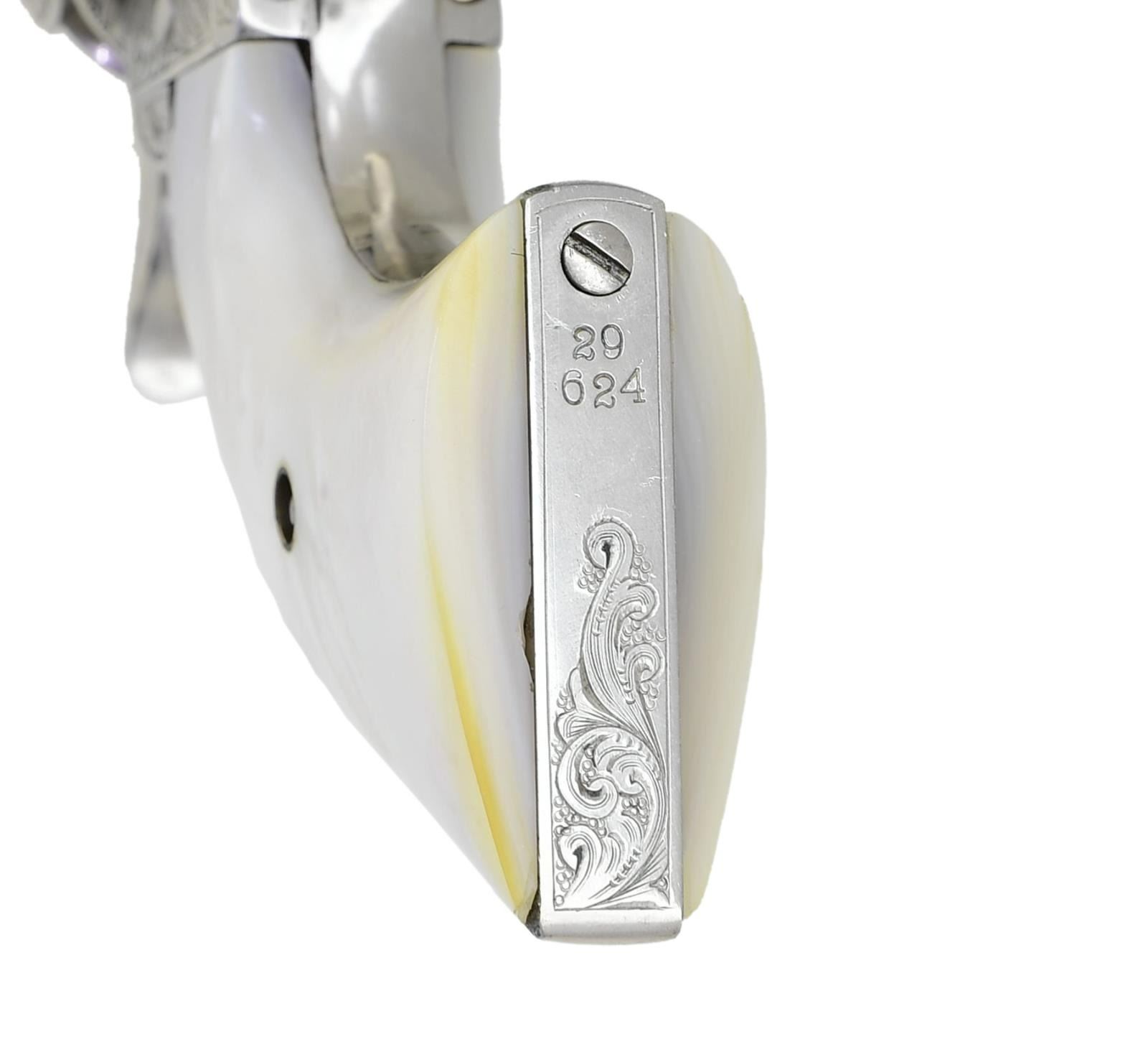 Cal. 45. S# 29624. Standard configuration, 7.5" barrel with Hartford address. Small "45CAL" stamped on left trigger bow, three-line patents stamped on left frame. Colt factory letter shows gun shipped to JP Moore, NYC November 1876 in a shipment of 50 guns. JP Moore customized original plain blue gun with engraving & nickel plating, often associated with Nimschke. Mounted with two-piece mother of pearl grips. UNATTACHED ACCESSORIES: "Colt Factory letter". Modern Colt logoed box, French fitted purple velvet for display. CONDITION: fine overall retains virtually all of its nickel finish & well discerned engraving and markings. Matching serial numbers found on barrel, prime, trigger guard, backstrap, and cylinder. Mechanically fine, good discernible rifled bore. PROVENANCE: E. M. Morgan collection 1994, Collection of Horst Kreiner. (01-24009/JS). $5,000-8,000.