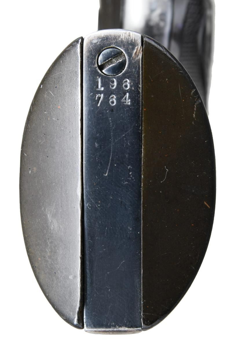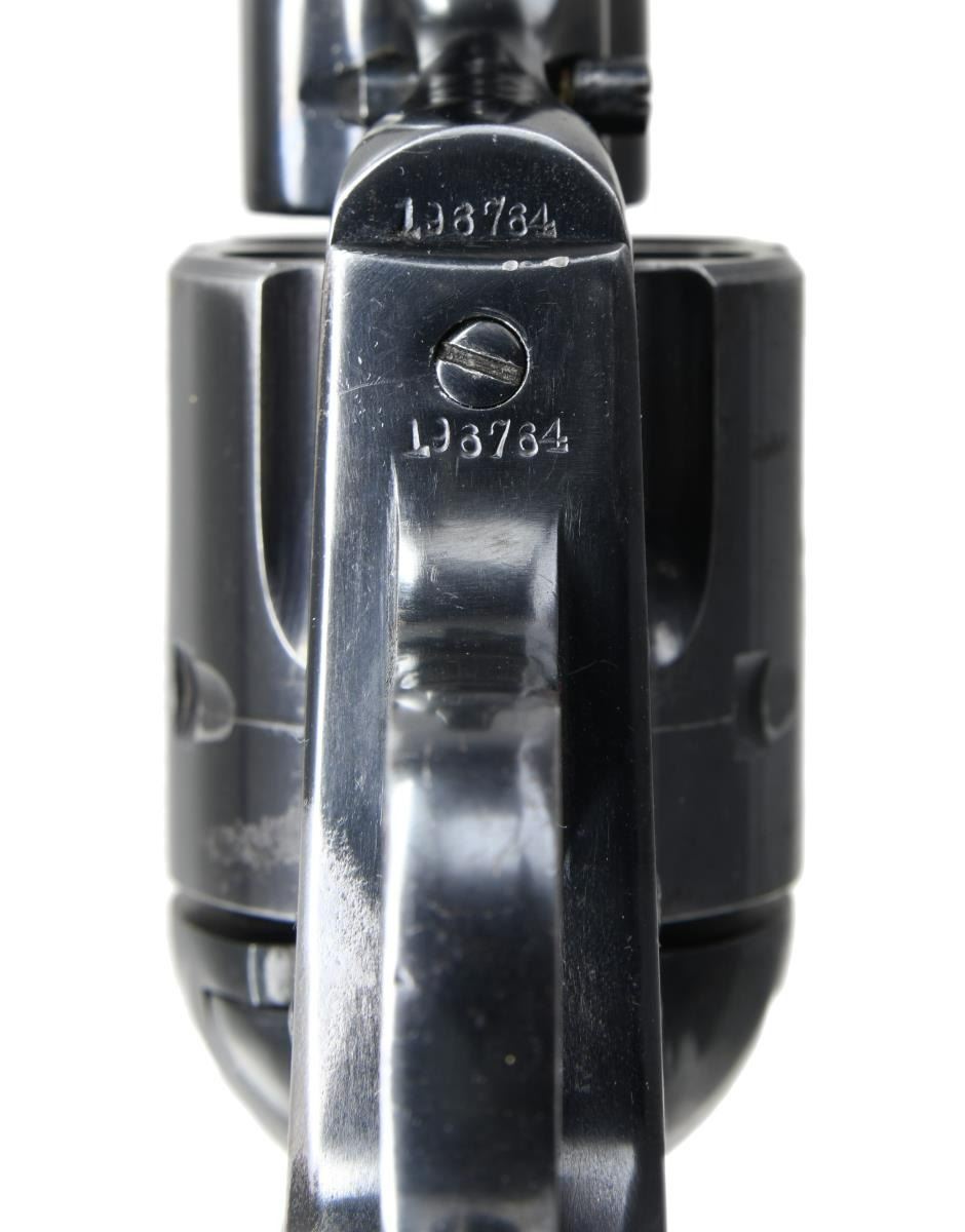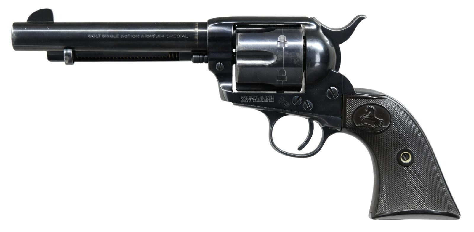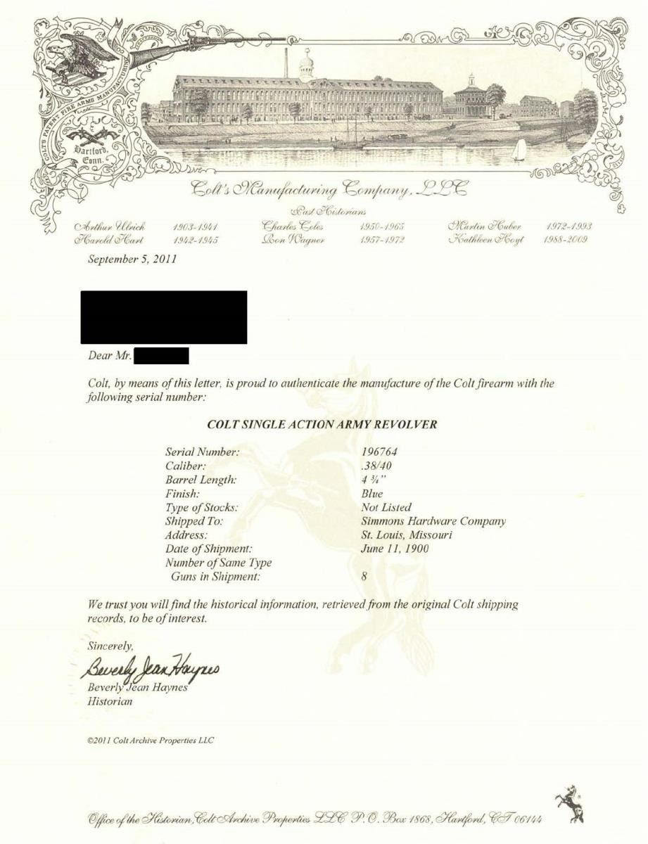 FACTORY LETTER. Cal. 44 SPCL. S# 196764. Bbl 5 3/8". Single Action Army revolver manufactured by Colt in 1900. The left side of the barrel is stamped "COLT SINGLE ACTION ARMY .44 SPECIAL", with Colt's single line address across the top. The left side of the frame is stamped with patent information followed by the encircled Rampant Colt logo. Metal components exhibit a reapplied dark blue finish. Frame is mounted with 2 piece black checkered plastic grips. Interior of left grip panel is inscribed "RUSTY/ JOHNSON". Cylinder and barrel are later production replacements. Revolver has been modified via the removal of the striker on the hammer and the addition of a free floating firing pin in the frame in the Christy’s conversion style. UNATTACHED ACCESSORIES: Colt factory letter indicating that this revolver was originally chambered in ".38/40" and was 1 of 8 revolvers shipped to Simmons Hardware Company in St. Louis, MO on June 11th of 1900. CONDITION: metal components retain the majority of their reapplied blue finish, exhibiting some areas of wear and thinning that show through to gray patina, as well as some spots of pitting that are present beneath the finish. Mirror bore, exhibiting strong rifling throughout. Grips show smoothing and some scattered marks from handling and storage, but are otherwise sturdy and serviceable. (23-1807/MLW). CURIO. $1,000-1,500.