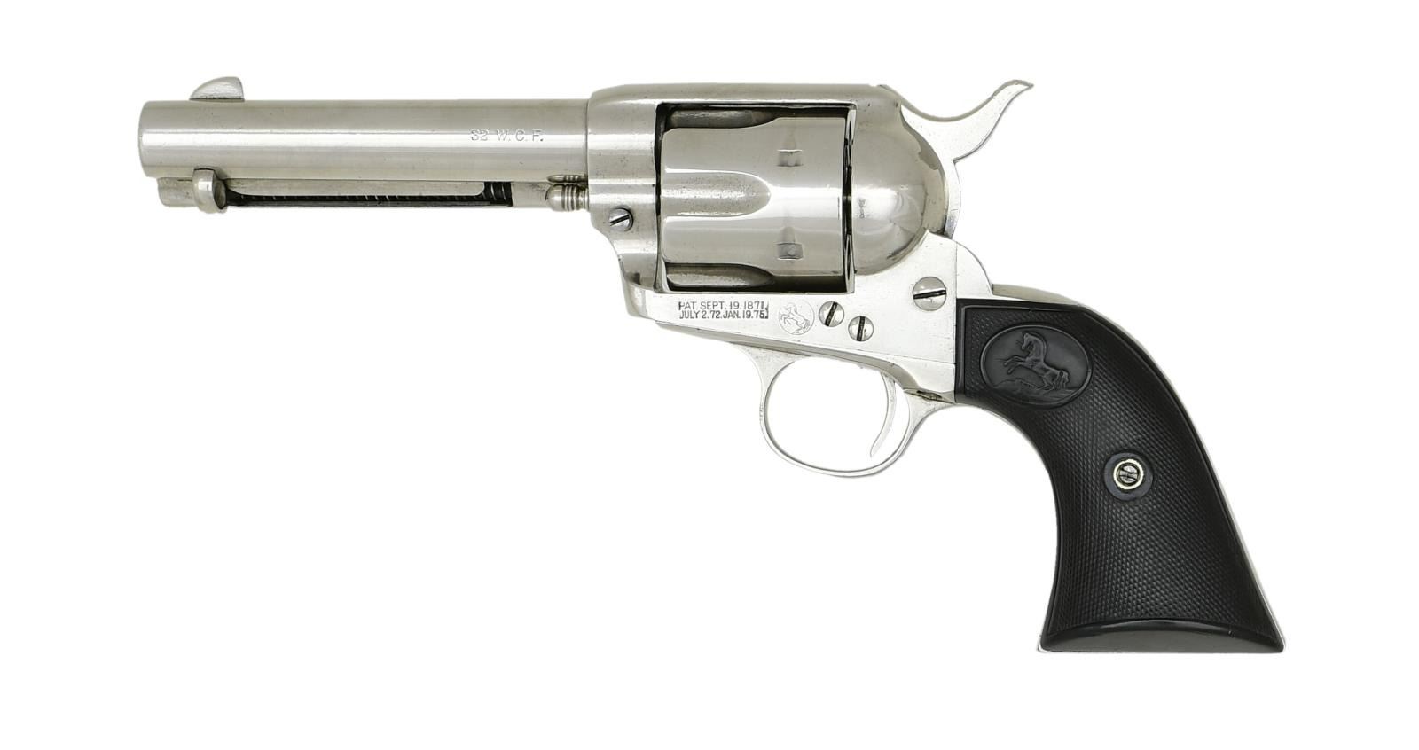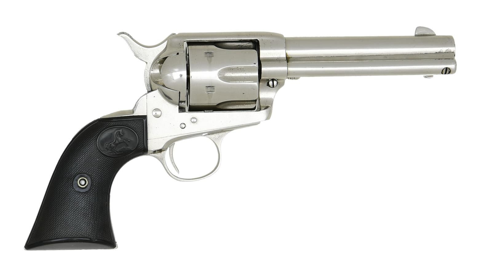 Cal. 32 W.C.F. S# 198893. Bbl 4 3/4". Single Action Army manufactured by Colt in 1900. Barrel is stamped with Colt's 2 line address across the top, with the caliber designation "32 W.C.F." on the left. Left side of frame bears patent information, followed by the encircled Rampant Colt logo. Metal components exhibit a reapplied nickel plated finish, with the frame being mounted with 2 piece Colt checkered hard rubber grips. Matching numbers are present on the frame, cylinder, trigger guard, and backstrap. CONDITION: metal components retain the vast majority of their reapplied nickel finish, exhibiting some flaking on the underside of the top strap, as well as on the sides of the grip straps, with areas of mild pitting present beneath the finish. Bore is bright, as refinished, exhibiting moderate pitting and fair rifling throughout. Grips show smoothing, with some scattered nicks and marks from handling and storage, but otherwise remain sturdy and serviceable. (23-1723/MLW). CURIO. $1,500-2,000.