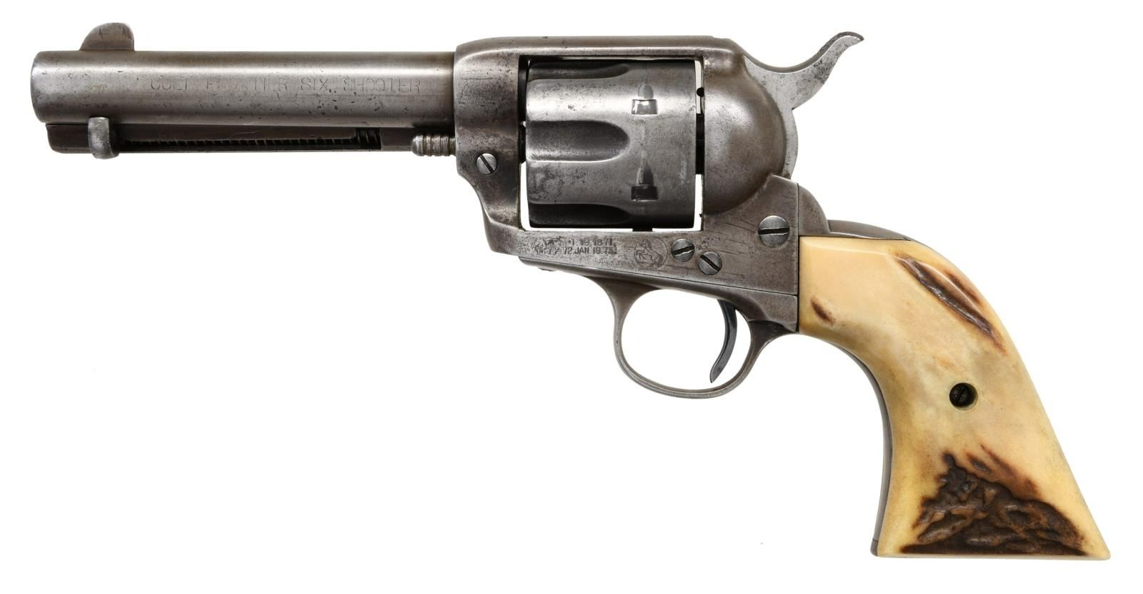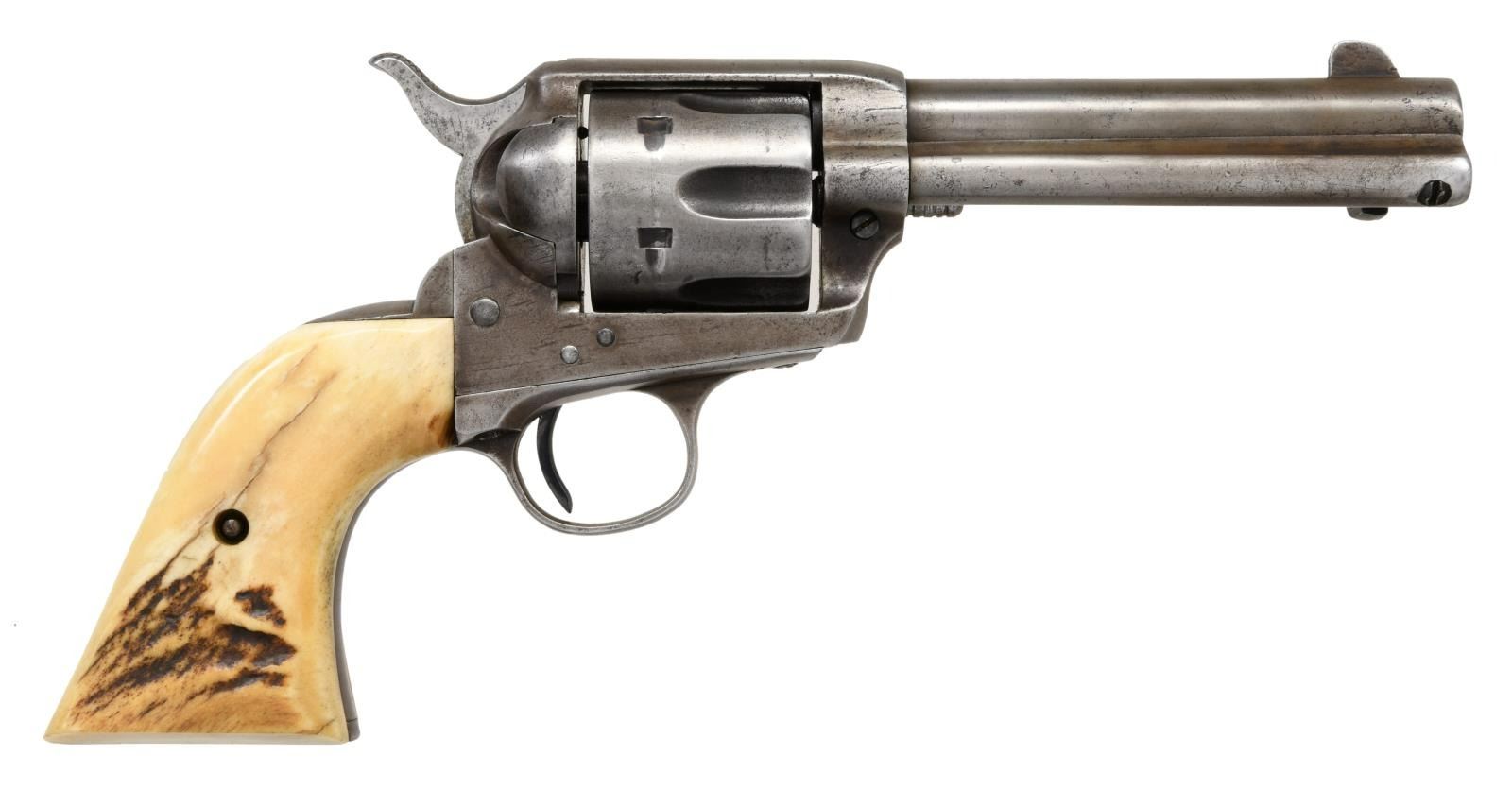 SINGLE ACTION REVOLVER. Cal. 44-40. S# 210900. Bbl 4 3/4". Single Action Army Frontier Six Shooter manufactured by Colt in 1901. The left side of the barrel bears a faint "COLT FRONTIER SIX SHOOTER" stamp, with Colt's 2 line address stamped over the top at the breech. Left side of frame is stamped with patent information, followed by the encircled Rampant Colt logo. Barrel has been shortened, appearing to have shortened during the period. Trigger is a replacement. Frame is mounted with 2 piece stag grips. Matching numbers are present on the frame, trigger guard, and rear grip strap. CONDITION: metal components exhibit a mottled gray patina, with some scattered areas of mild pitting. Fair bore, exhibiting consistent pitting and strong rifling throughout. Grips show a few scattered marks from handling and storage, but otherwise remain sturdy and serviceable. (23-3040/MLW). CURIO. $2,000-3,000.