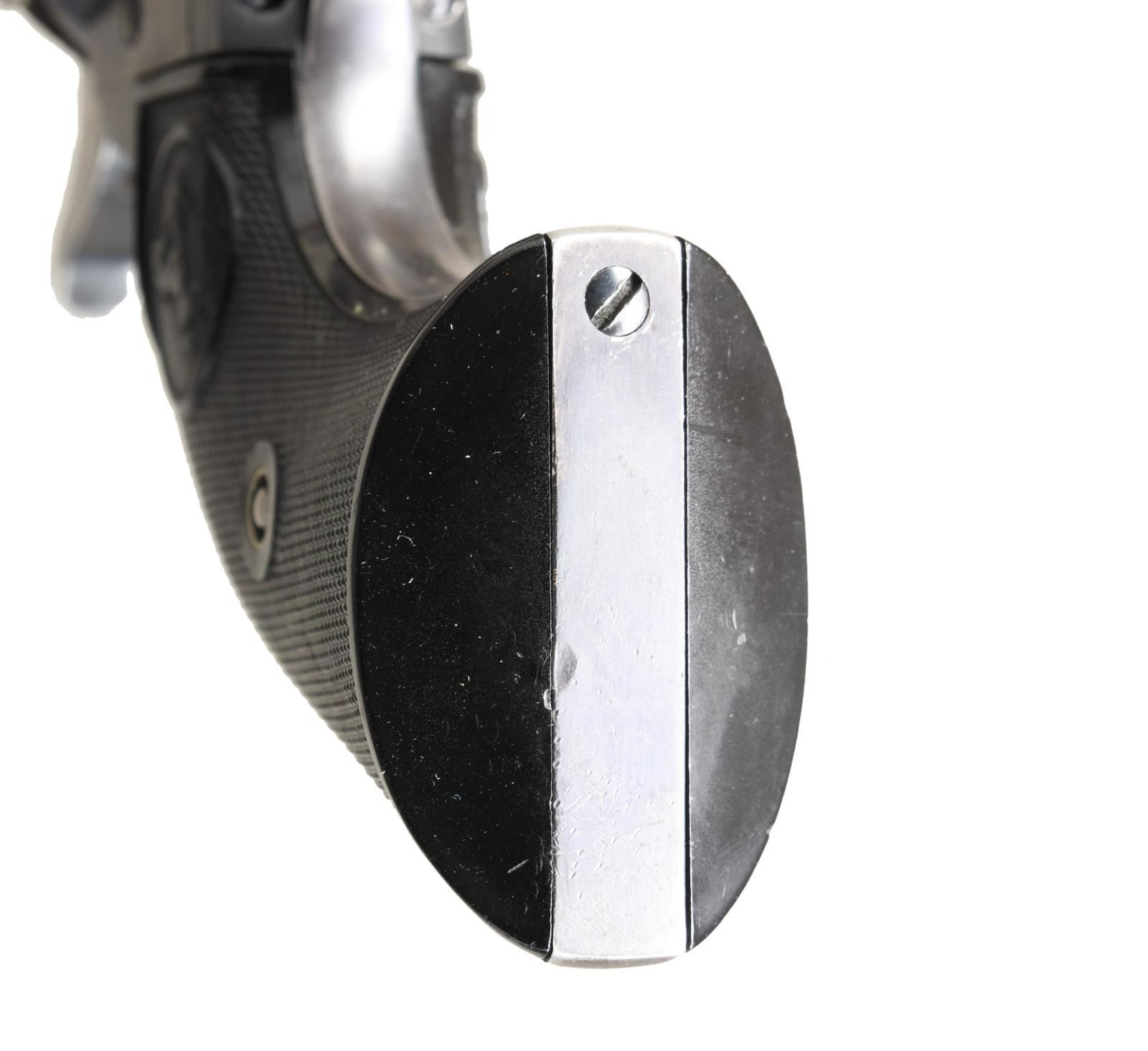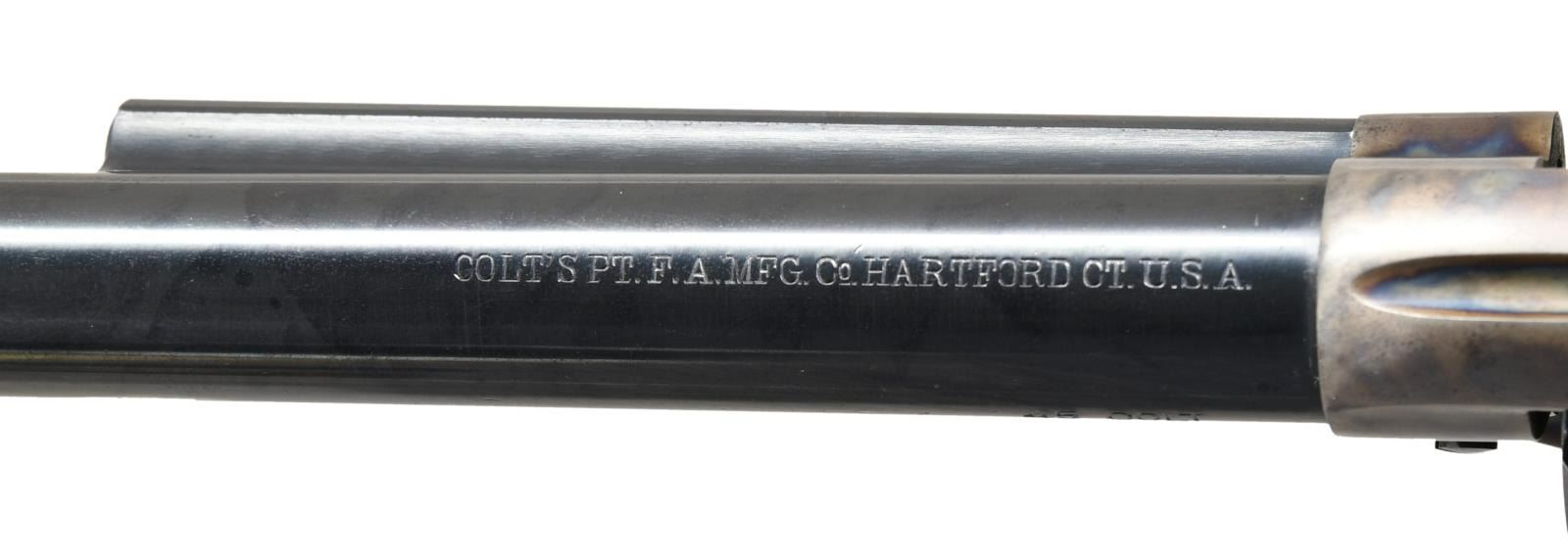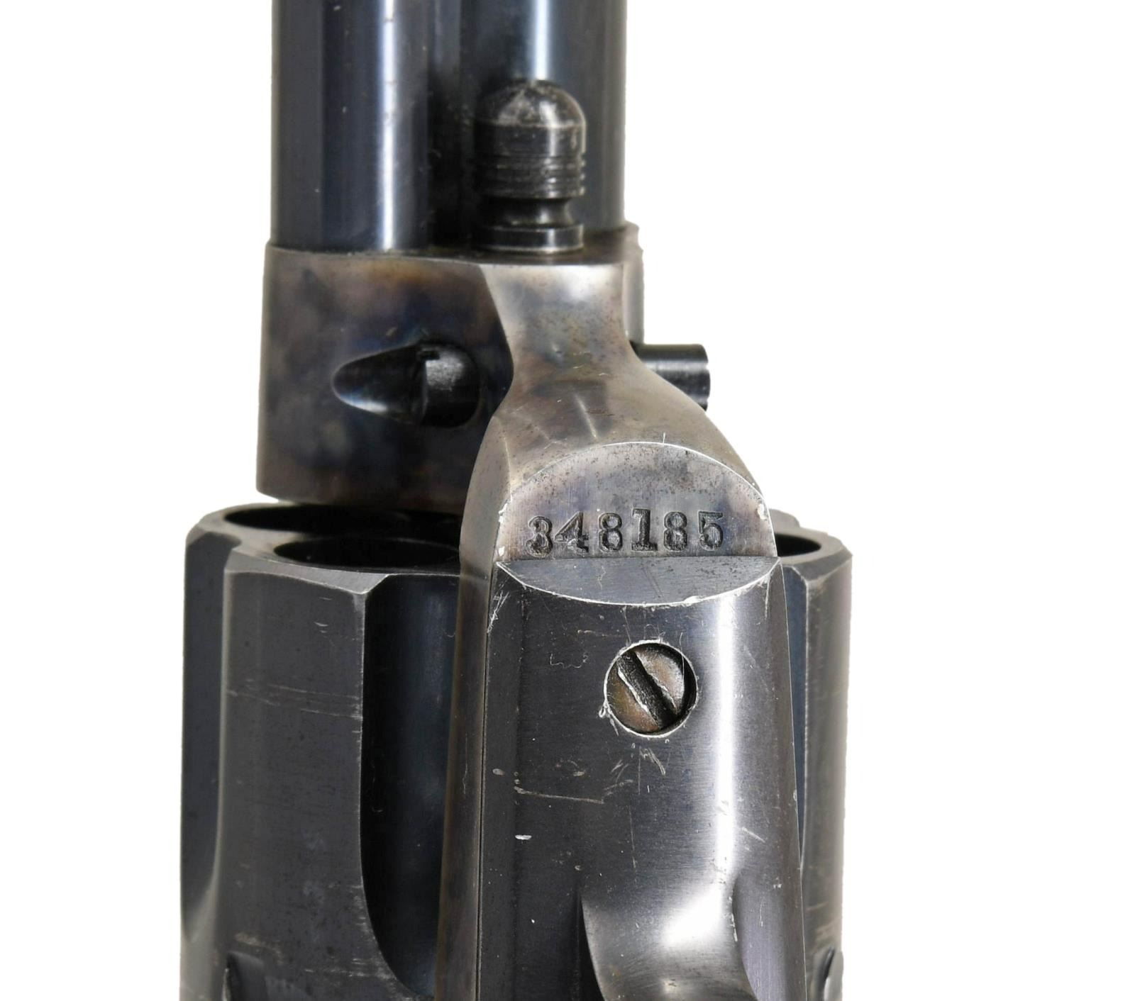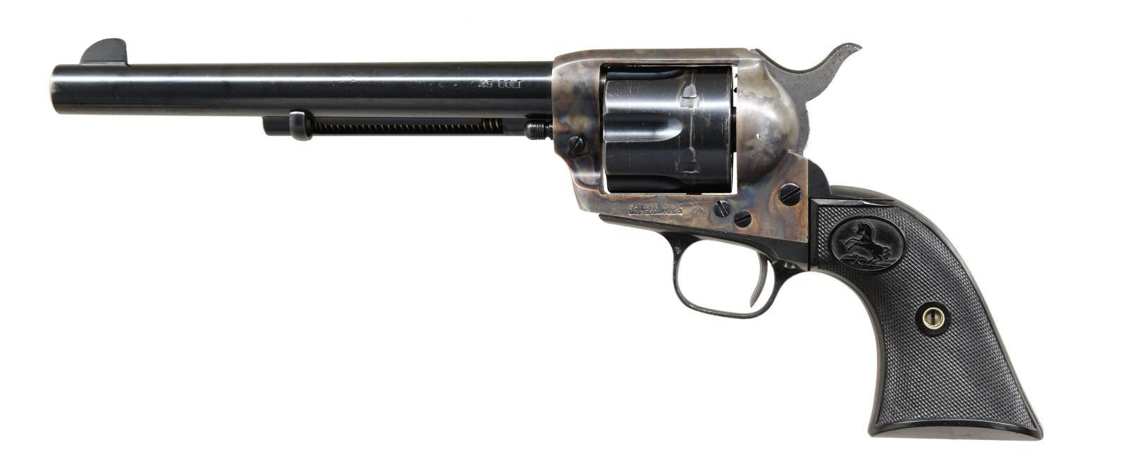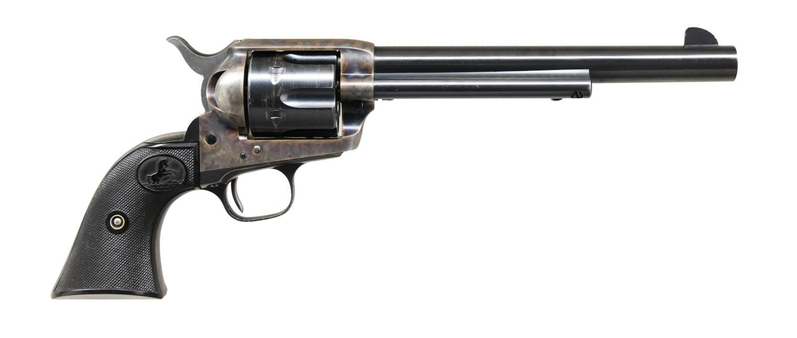 REVOLVER. Cal 45. S# 348185. Standard configuration, 7.5" barrel, full semicircular front sight,1-line Hartford address, blue and case color finish, hard rubber checkered "Rampant Colt" logo grips. Manufactured 1925. CONDITION: Excellent, barrel and cylinder retain about 95% original bright factory blue, grip frame retains about 90% blue thinning where held, frame retains about 95% bright & muted case colors with balance silver/gray patina. Mechanically fine, bright shiny rifled bore. (23-4861/JS). CURIO. $5,000-8,000.