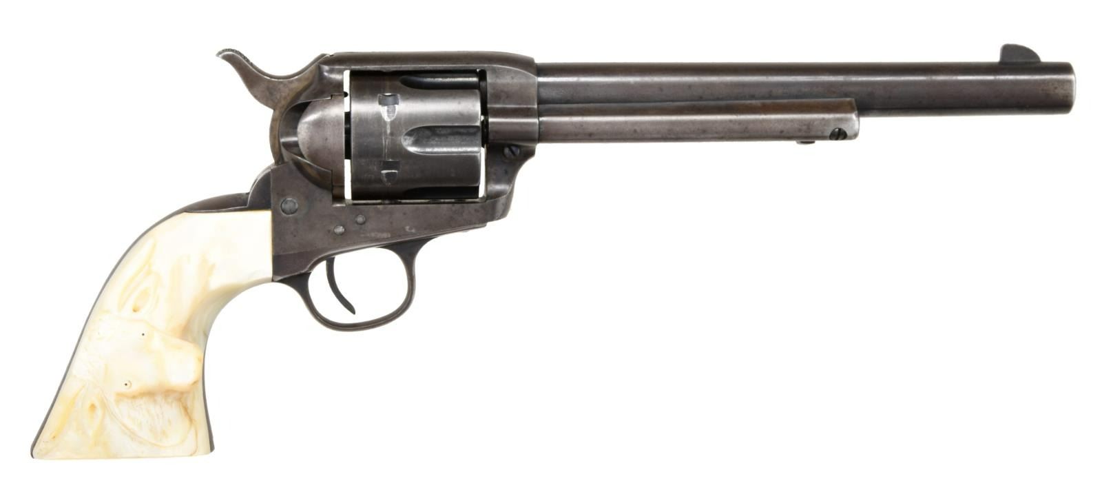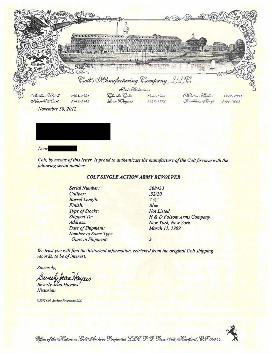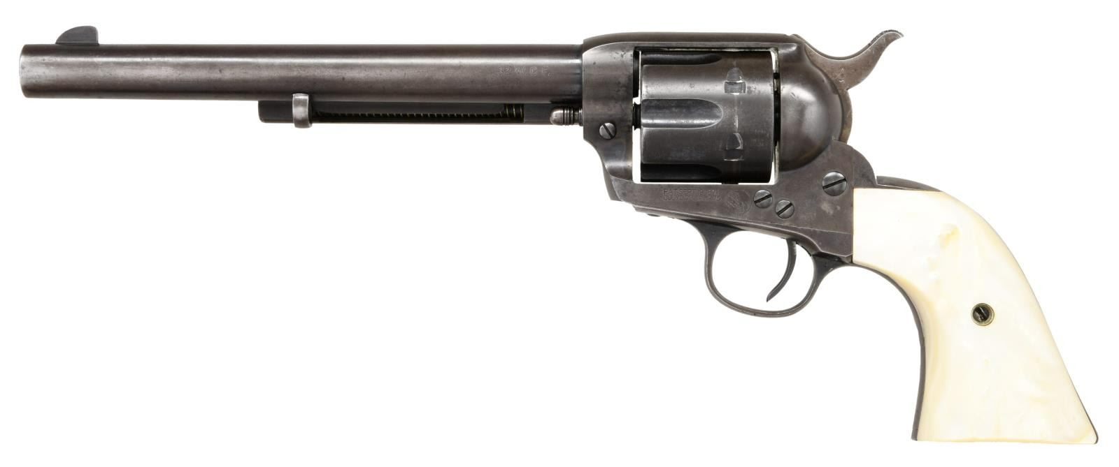 Cal. 32-20. S# 308433. Bbl. 7 1/2". Six shot fluted cyl. Blue & case colored finish. Custom aftermarket 2 piece pearl grips. Right panel has a raised Texas longhorn steer head. UNATTACHED ACCESSORIES: letter from the Colt Archive Properties detailing the following, "Serial Number: 308433. Caliber: .32/20. Barrel Length: 7 1/2. Finish: Blue. Type of Stocks: Not Listed. Shipped To: H & D Folsom Arms Company. Address: New York, New York. Date of Shipment: March 11, 1909. Number of Same Type Guns in Shipment: 2". CONDITION: metal finish has faded to an even gray. Right grip panel has small chips along backstrap & at toe. Action is sound retaining 4 clicks. Bore has a lightly frosted appearance w/ worn rifling, having slight bulge approx. 1 1/2" from the muzzle. (23-2724/DS). CURIO. $2000-3000.
