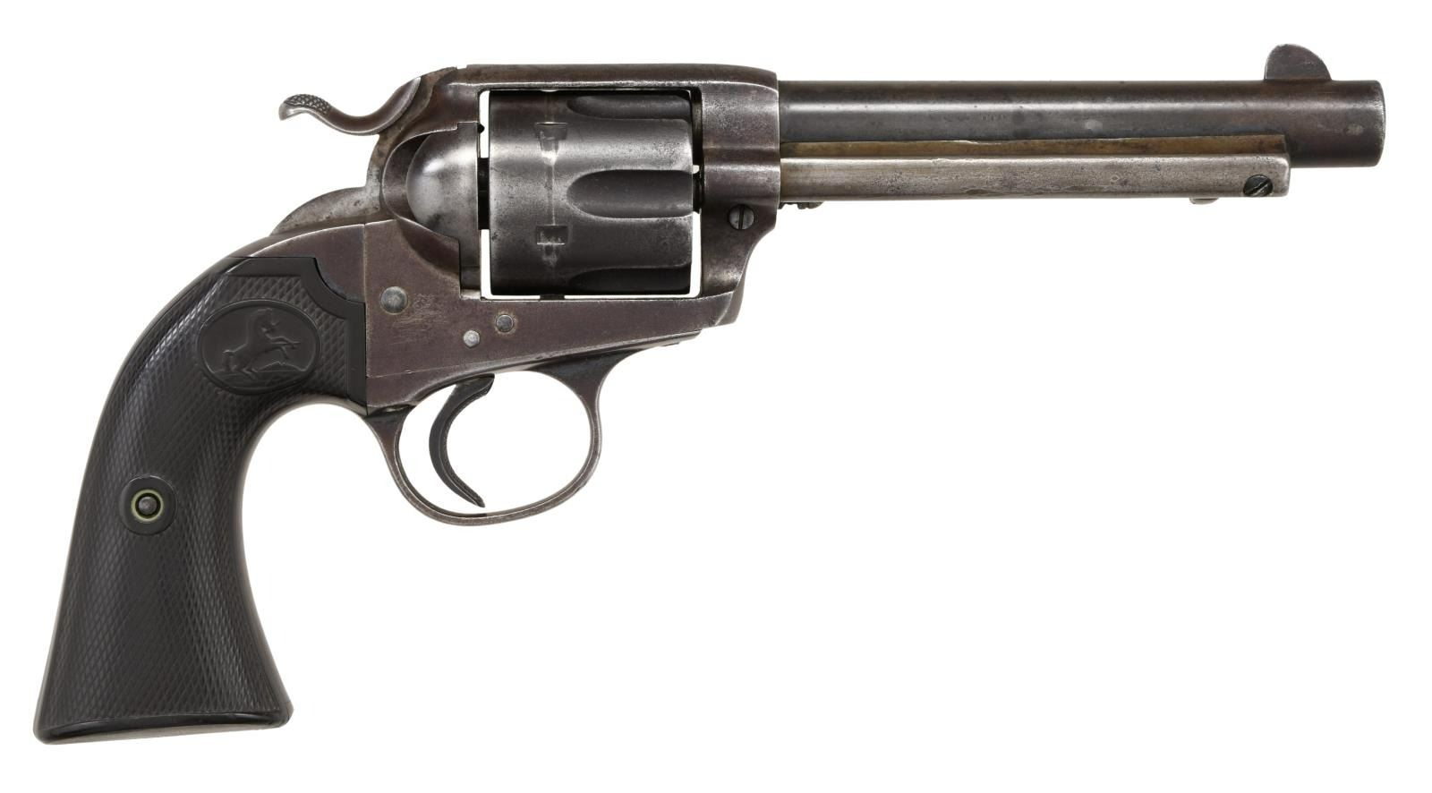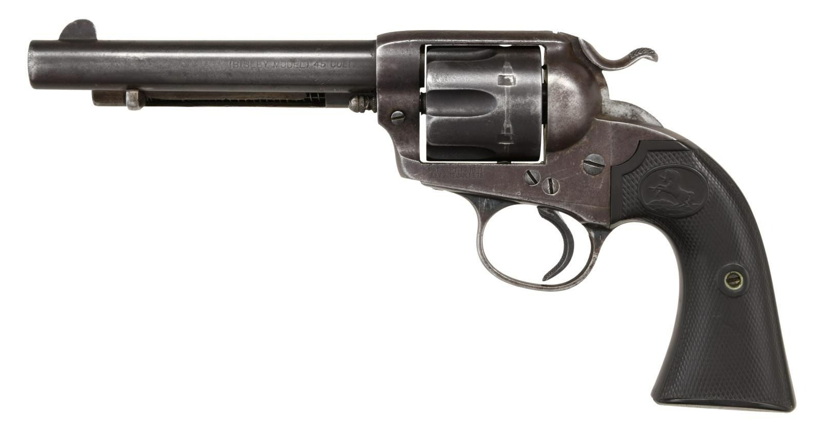 Cal. 45 Colt. S# 177919. Bbl 5 1/2". Bisley Model single action revolver manufactured by Colt in 1898. The left side of the barrel is stamped "(BISLEY MODEL) 45 COLT.", with Colt's single line address across the top. Left side of the frame bears patent information, followed by the encircled Rampant Colt logo. Frame is mounted with 2 piece Colt checkered brown hard rubber grips. Standard blade front sight with frame notched rear sight. Knurled trigger and cylinder base pin head. Matching numbers are present on the frame, trigger guard, and rear grip strap. CONDITION: metal components exhibit a dark gray patina overall, with some areas of mild to moderate pitting. Dark bore, exhibiting pitting and good rifling throughout. Grips exhibit smoothing, and some scattered marks from handling and storage, but otherwise remain sturdy and serviceable. (01-23440/MLW). ANTIQUE. $1,500-2,000.