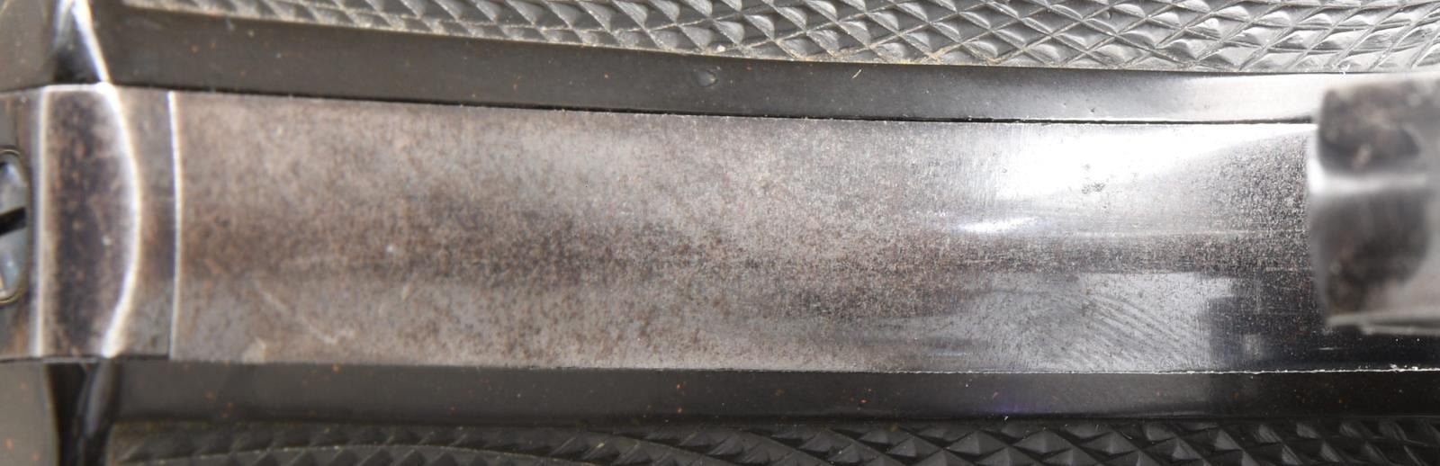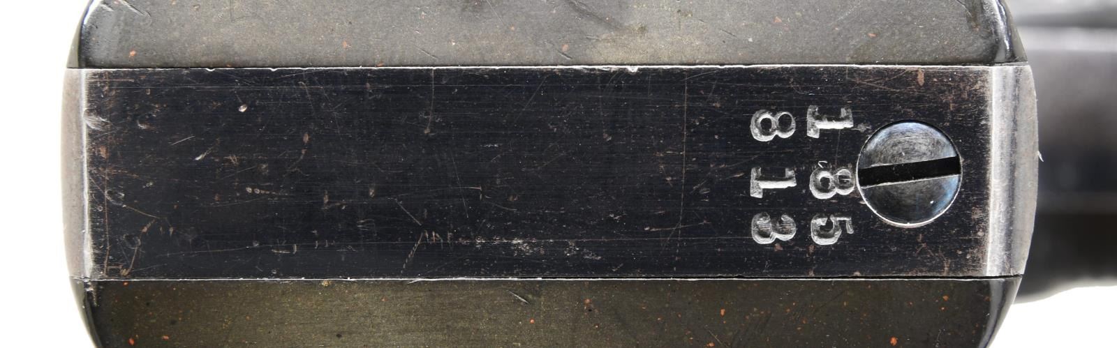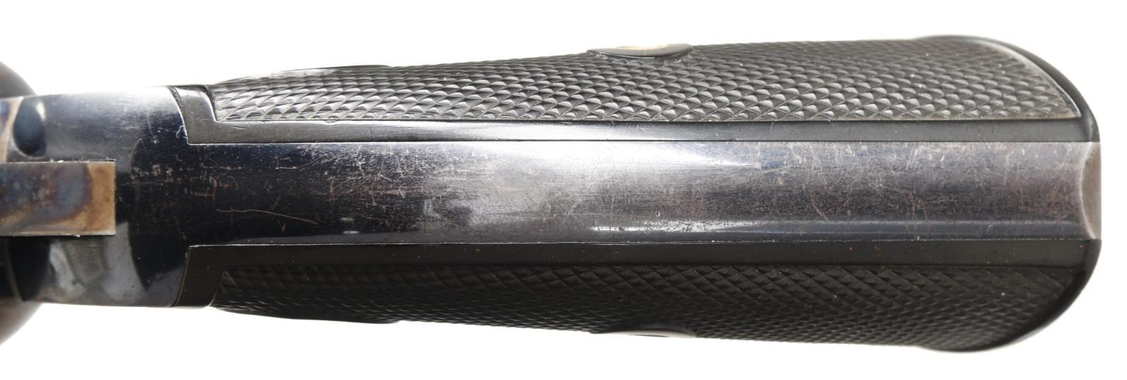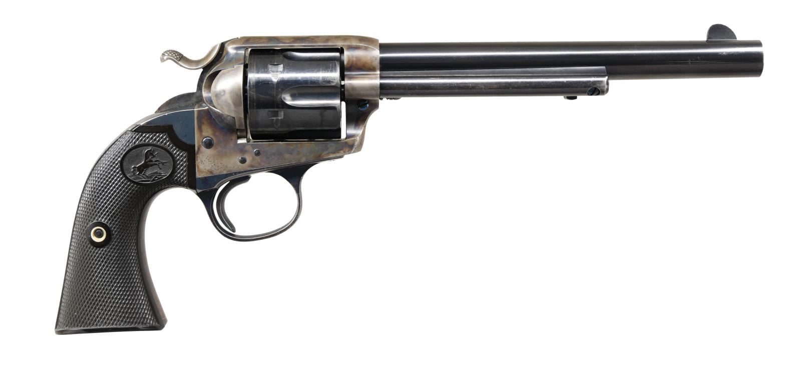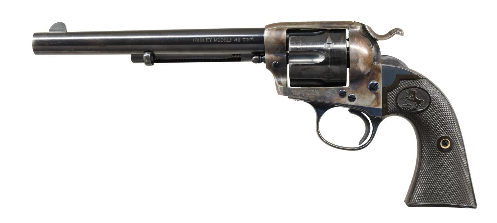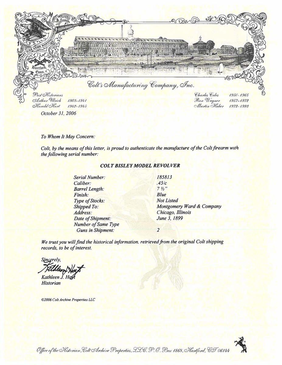 LETTER. Cal. 45 Colt. S# 185813. Bbl. 7 1/2". Marked on left side "(BISLEY MODEL) 45 COLT". Case hardened frame & wide spur hammer. Blue steel bbl., grip frame & six shot fluted cyl. Fire blue screws & wide target trigger. 2 piece checkered hard rubber grips w/ rampant colt in ovals. UNATTACHED ACCESSORIES: Colt Archive letter stating the following, "Serial Number: 185813 / Caliber: .45/C / Barrel Length: 7 1/2" / Finish: Blue / Type of Stocks: Not Listed / Shipped To: Montgomery Ward & Company. / Address: Chicago, Illinois / Date of Shipment: June 3rd, 1899. / Number of Same Type Guns in Shipment: 2". CONDITION: bbl., cyl. & frame retain 85% original blue; notable thinning on grip straps & trigger guard. Cyl. exhibits uniform turnline finish wear. Frame retains 85% original case colors w/ small area of freckling on right side. Very good grips retain sharp checkering & have faded only mildly. Mechanically fine. Very good shiny bore retains sharp rifling. (23-5044/BH). CURIO. $2,500-3,750.