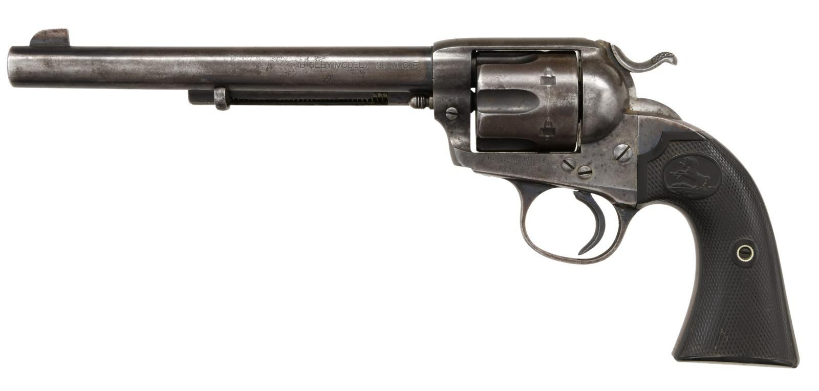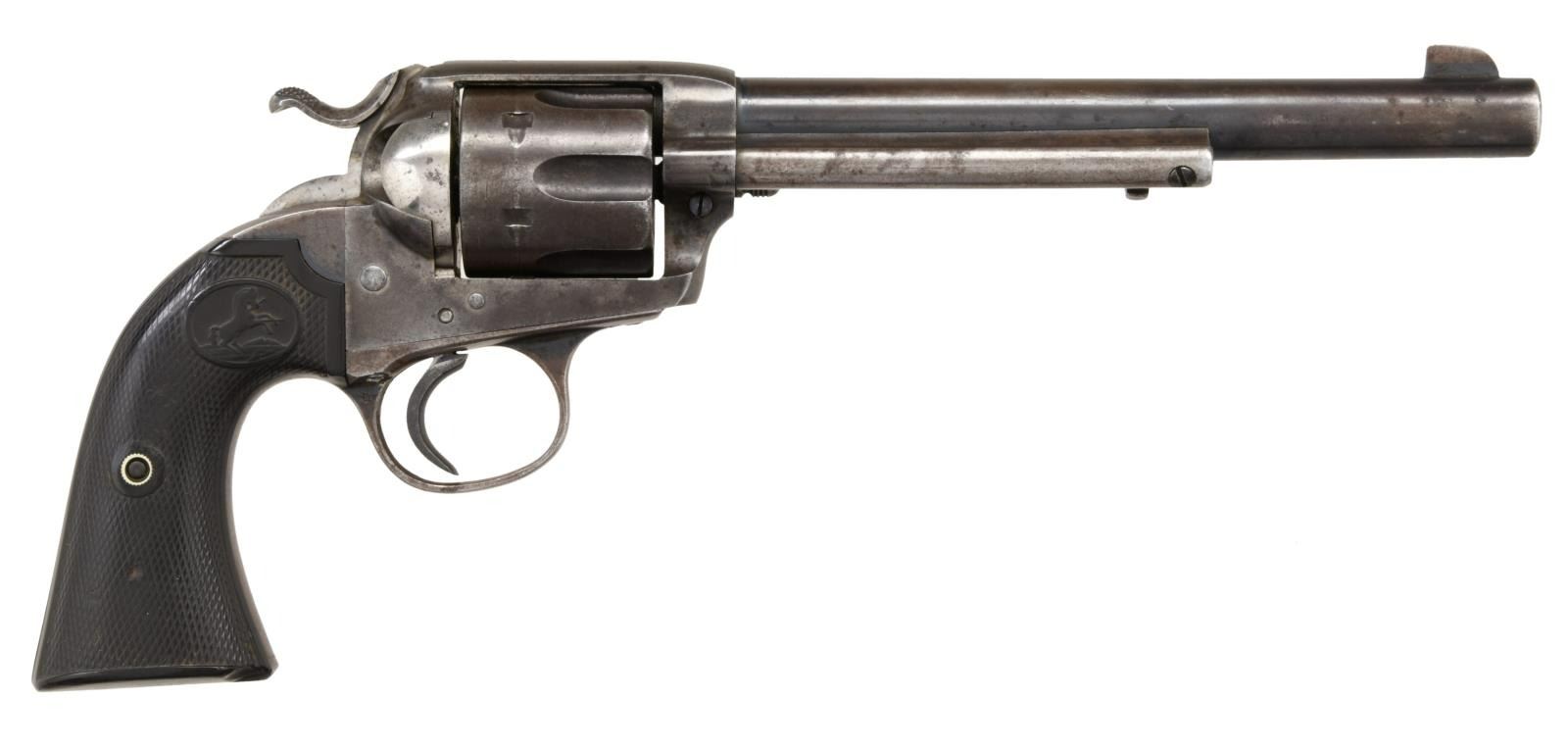Cal. 38 WCF. S# 196654. Bbl 7 1/2". Bisley Model single action revolver manufactured by Colt in 1900. The left side of the barrel is stamped "(BISLEY MODEL) 38 W.C.F", with Colt's single line address across the top. The left side of the frame is stamped with patent information, followed by the encircled Rampant Colt logo. Frame is mounted with 2 piece Colt checkered brown hard rubber grips. Flat top blade front sight with frame notched rear sight. Matching numbers are present on the frame, trigger guard, and rear grip strap. CONDITION: frame exhibits a mottled gray patina, with blued components retaining trace to fair amounts of their original factory blue finish, exhibiting wear and thinning that shows through to a matching gray patina overall, with some scattered areas of mild pitting. Bright bore, exhibiting light surface pitting and well defined rifling throughout. Grips show smoothing and some scattered nicks and marks from handling and storage, with a loss to the bottom right corner on the right grip, but otherwise remain sturdy and serviceable. (23-1414/MLW). CURIO. $1,200-1,800.
