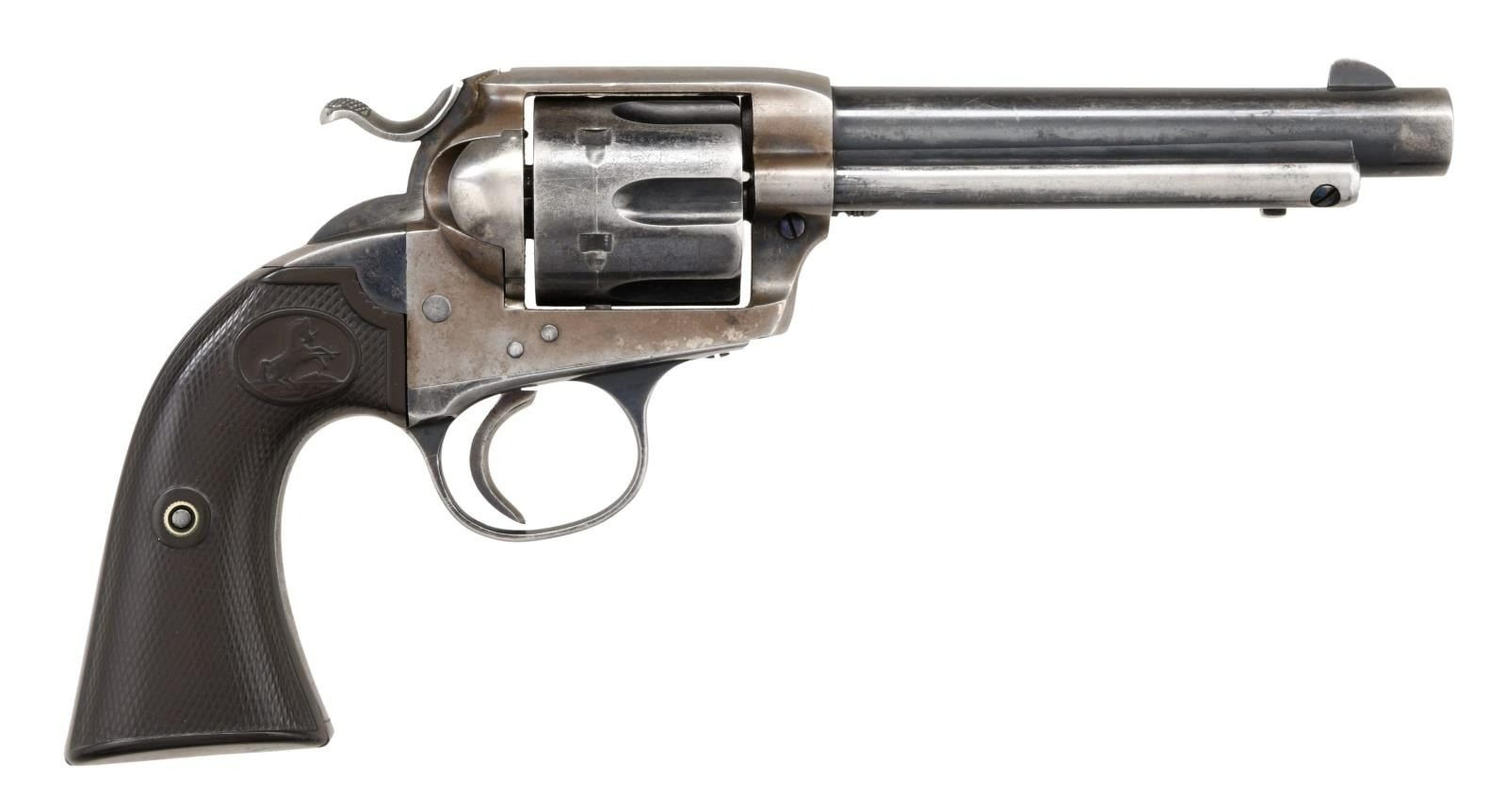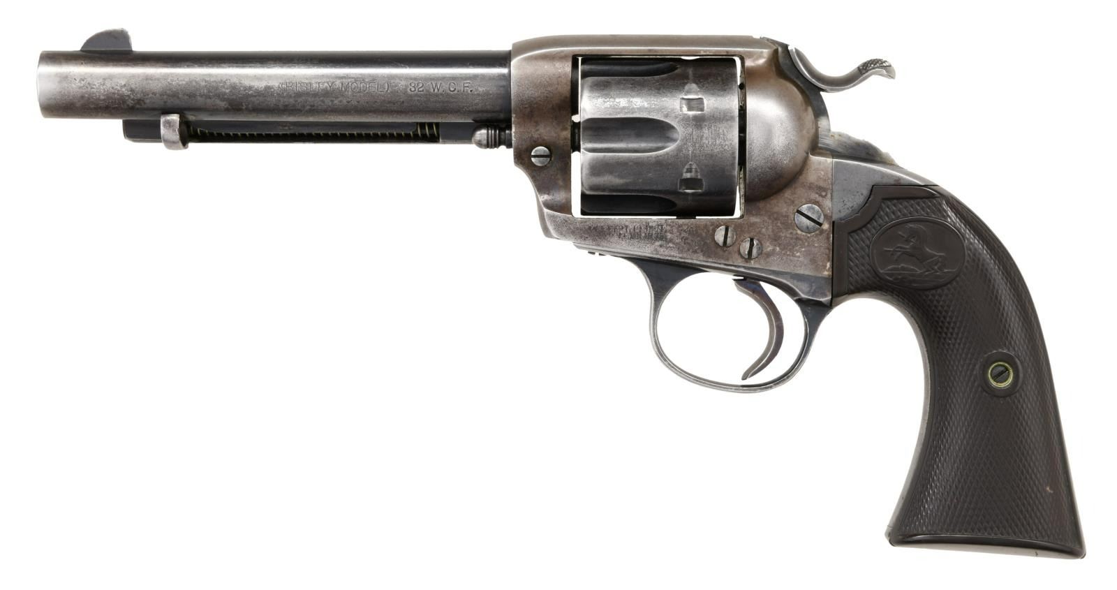 Cal. 32 WCF. S# 241964. Bbl 5 1/2". Bisley Model single action revolver manufactured by Colt in 1903. The left side of the barrel is stamped "(BISLEY MODEL) 32 W.C.F.", with Colt's single line address across the top. Left side of the frame exhibits faint patent information, followed by the encircled Rampant Colt logo. Frame exhibits a case color hardened finish, with remaining metal components being blued. Frame is mounted with 2 piece Colt checkered brown hard rubber grips. Right grip panel exhibits 5 small notches on the top right corner. Matching numbers are present on the frame, trigger guard, and rear grip strap. CONDITION: frame retains traces of its original factory case color hardened finish, exhibiting a gray patina overall, with mild pitting on the left side of the frame. Blued components retain fair amounts to of their original factory finish, exhibiting areas of wear and thinning overall that shows through to gray patina. Bore is bright, exhibiting consistent mild pitting and good rifling throughout. Grips show smoothing and some scattered marks from handling and storage, but otherwise remain sturdy and serviceable. (23-1416/MLW). CURIO. $1,200-1,800.