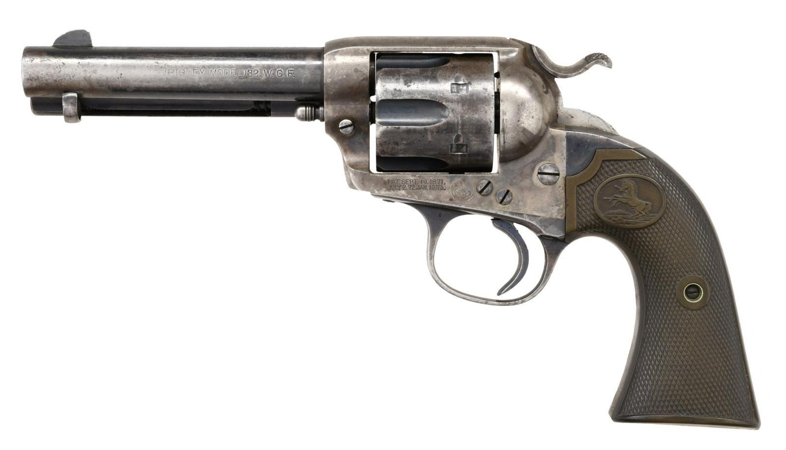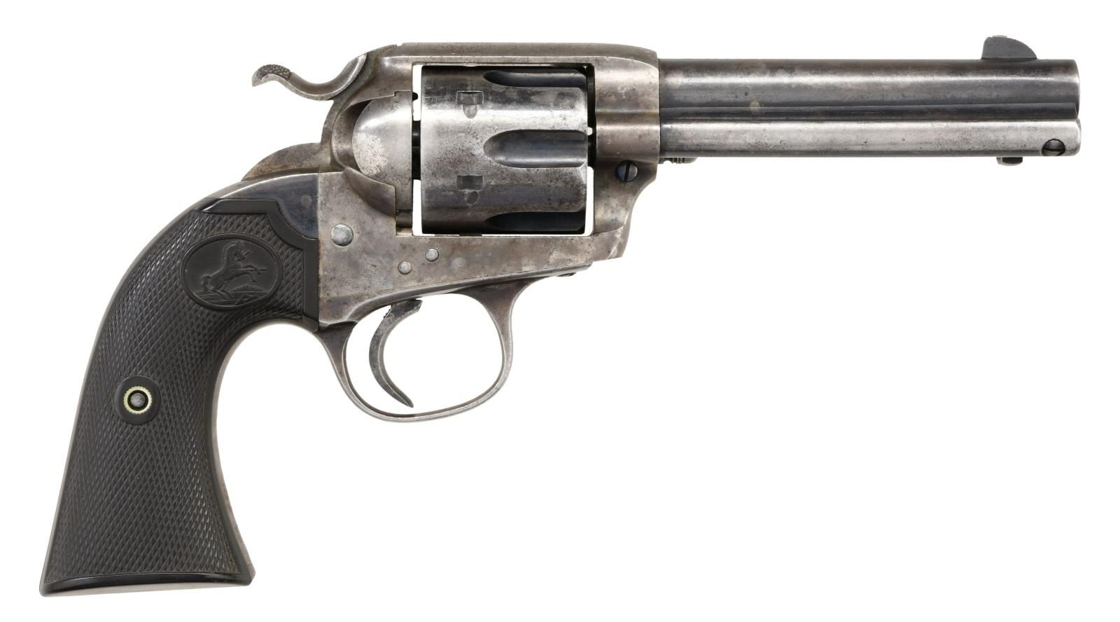 Cal. 32 WCF. S# 256832. Bbl 4 3/4". Bisley Model single action revolver manufactured by Colt in 1904. The left side of the barrel is stamped "(BISLEY MODEL) 32 W.C.F.", with Colt's 2 line address stamped over the top at the breech. Left side of the frame is stamped with patent information, followed by the encircled Rampant Colt logo. Frame exhibits a case color hardened finish, with remaining components being blued. Frame is mounted with 2 piece Colt checkered brown hard rubber grips. Matching numbers are present on the frame, trigger guard, and rear grip strap. CONDITION: frame retains traces of its original case color hardened finish, with the balance exhibiting a gray patina with some scattered spots of light pitting. Blued components retain fair amounts of their original factory finish, exhibiting wear and thinning overall that shows through to a matching gray patina. Bright bore, exhibiting scattered areas of pitting and retaining strong rifling throughout. Grips show some smoothing and some scattered marks from handling and storage, but otherwise remain sturdy and serviceable. (23-1417/MLW). CURIO. $1,200-1,800.