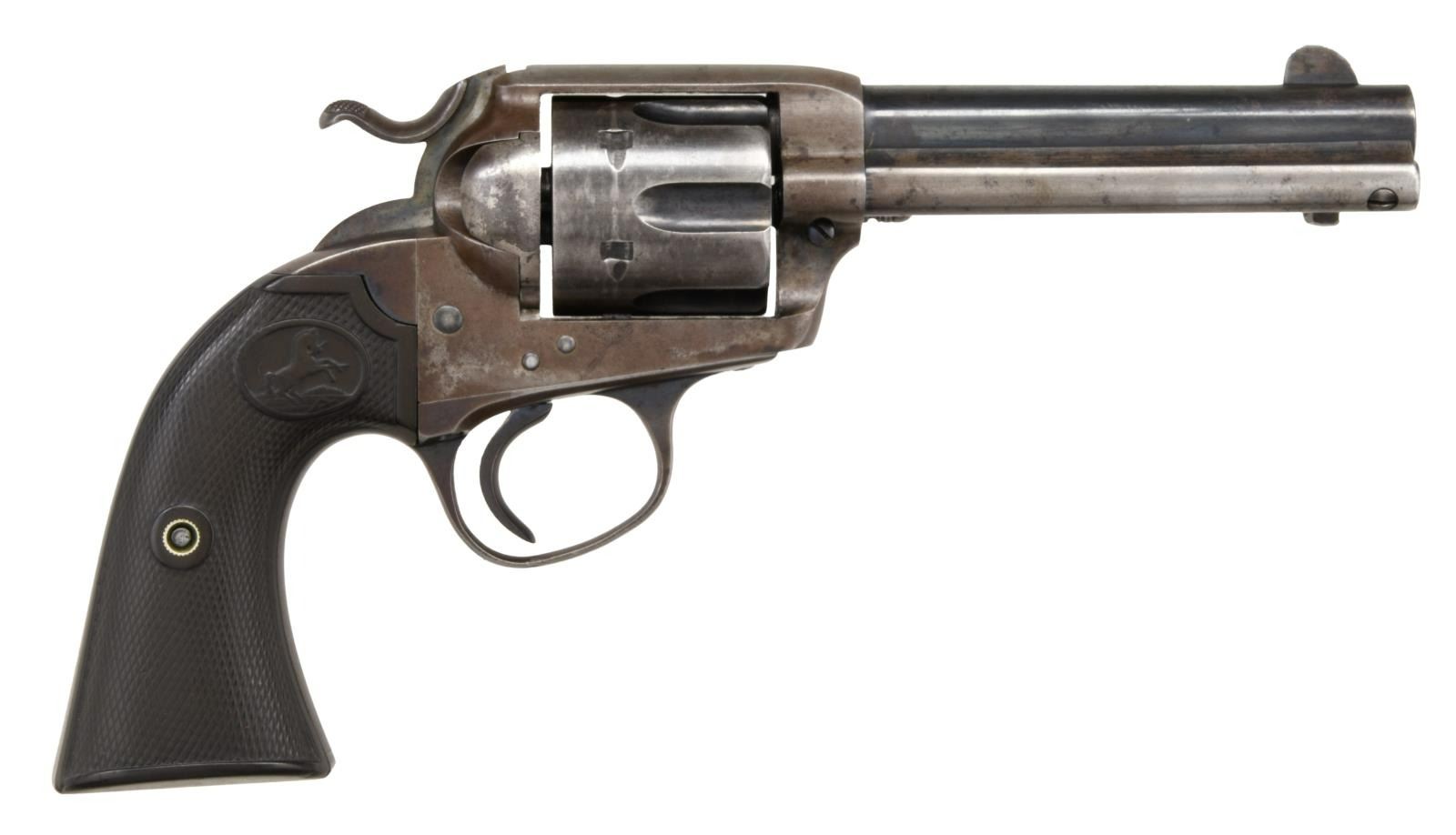 Cal. 38 WCF. S# 262228. Bbl 4 3/4". Bisley Model single action revolver manufactured by Colt in 1905. The left side of the barrel is stamped "(BISLEY MODEL) 38 W.C.F.", with Colt's 2 line address across the top of the barrel. Left side of the frame is stamped with patent information, followed by the encircled Rampant Colt logo. Frame exhibits a case color hardened frame, with the cylinder, barrel, ejector rod housing, trigger guard, and rear grip strap exhibiting a blued finish. Frame is mounted with 2 piece Colt checkered hard rubber grips. Standard blade front sight with frame notched rear sight. Matching numbers are present on the frame, trigger guard, and rear grip strap. CONDITION: frame retains scant traces of its original case color hardened finish, with the balance exhibiting a mottled brown patina, with some light spots of pitting. Barrel retains large amounts of its original blue finish, with remaining blue components exhibiting wear and thinning overall to gray and brown patinas. Bore exhibits consistent moderate pitting and retains fair rifling throughout. Grips show smoothing and some scattered marks from handling and storage, but otherwise remain sturdy and serviceable. (23-1413/MLW). CURIO. $1,200-1,800.
