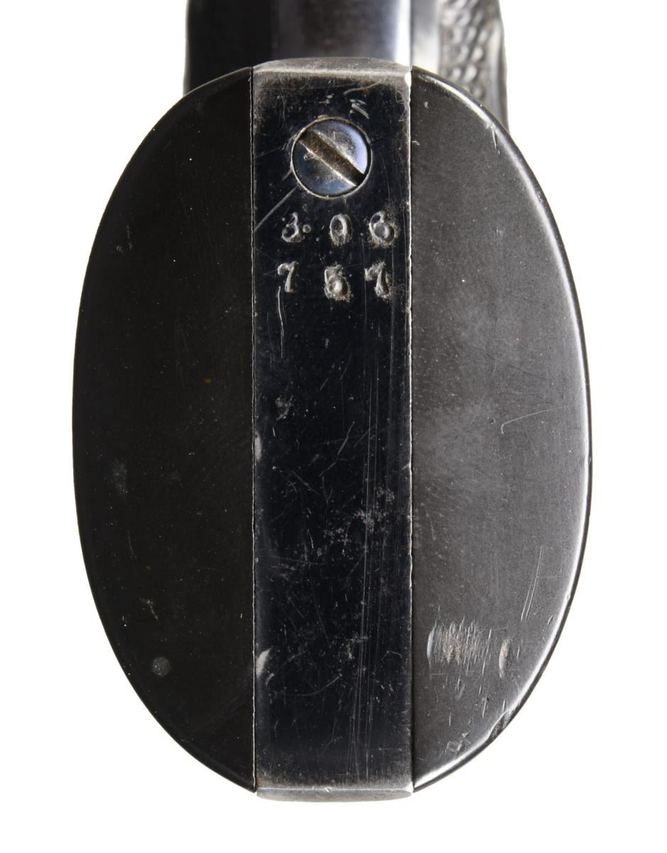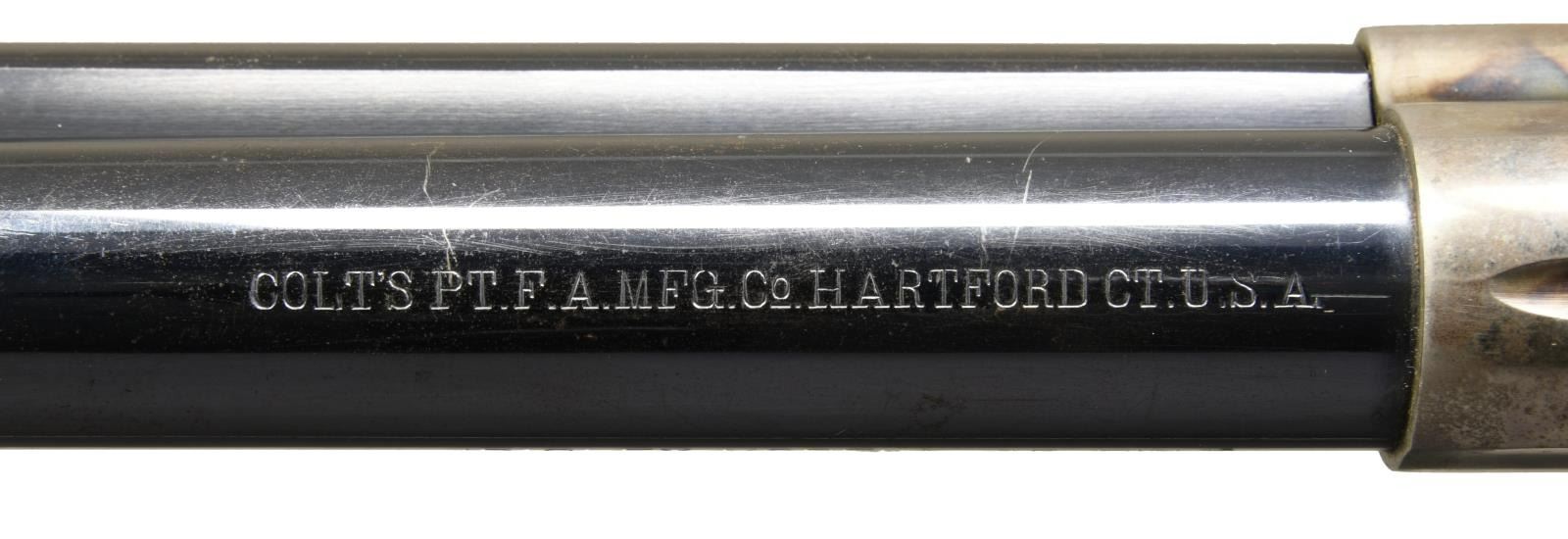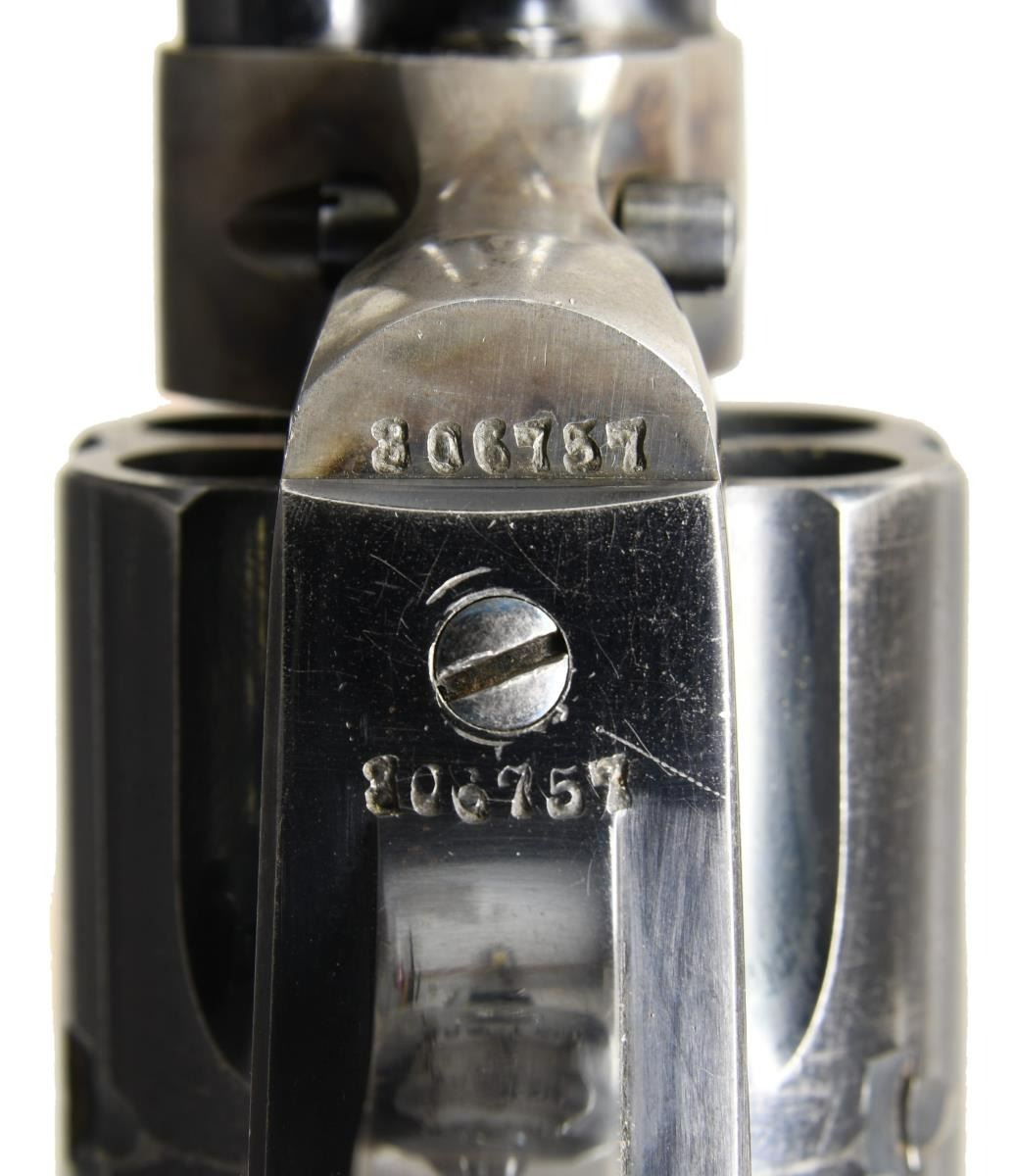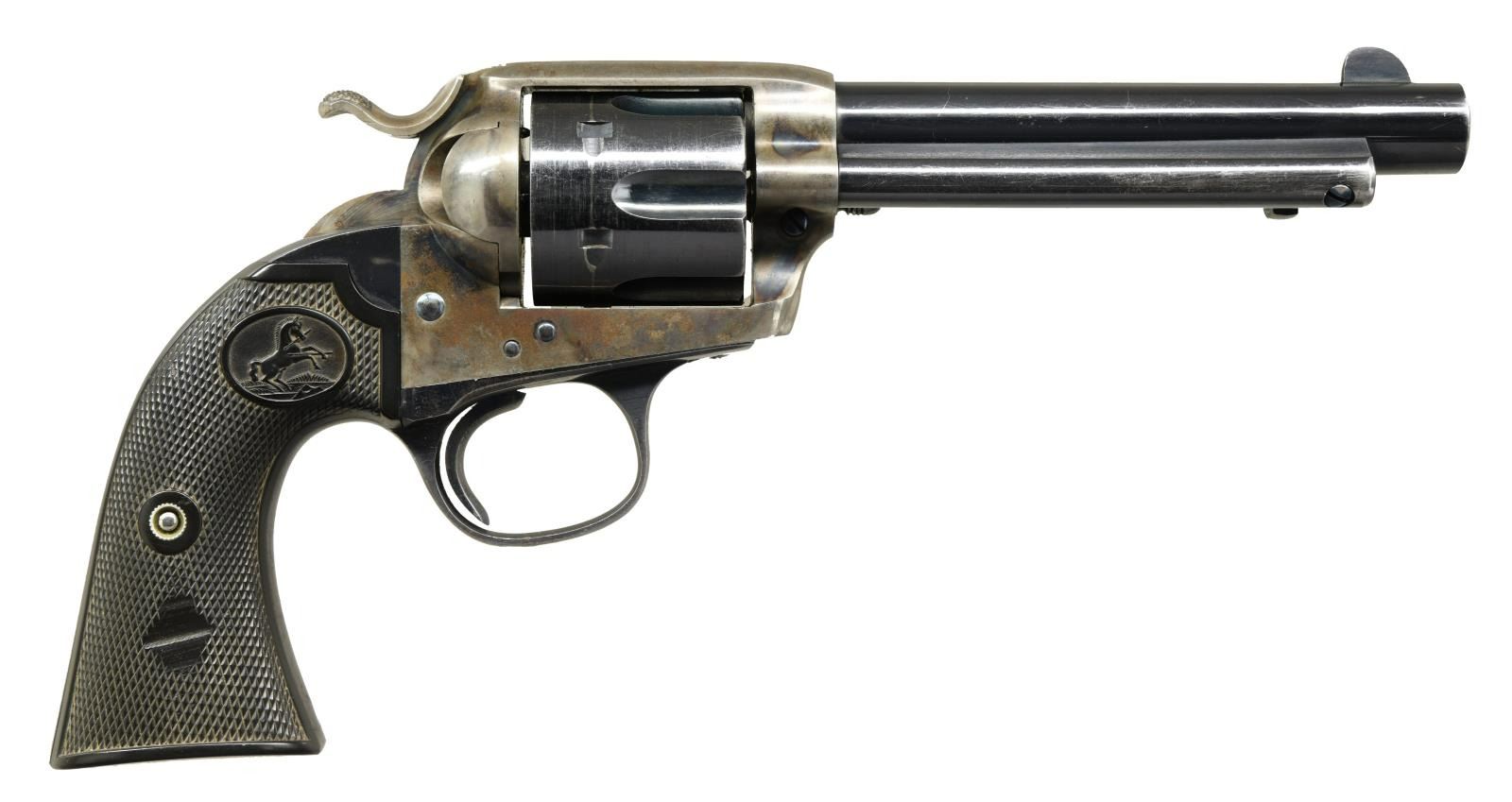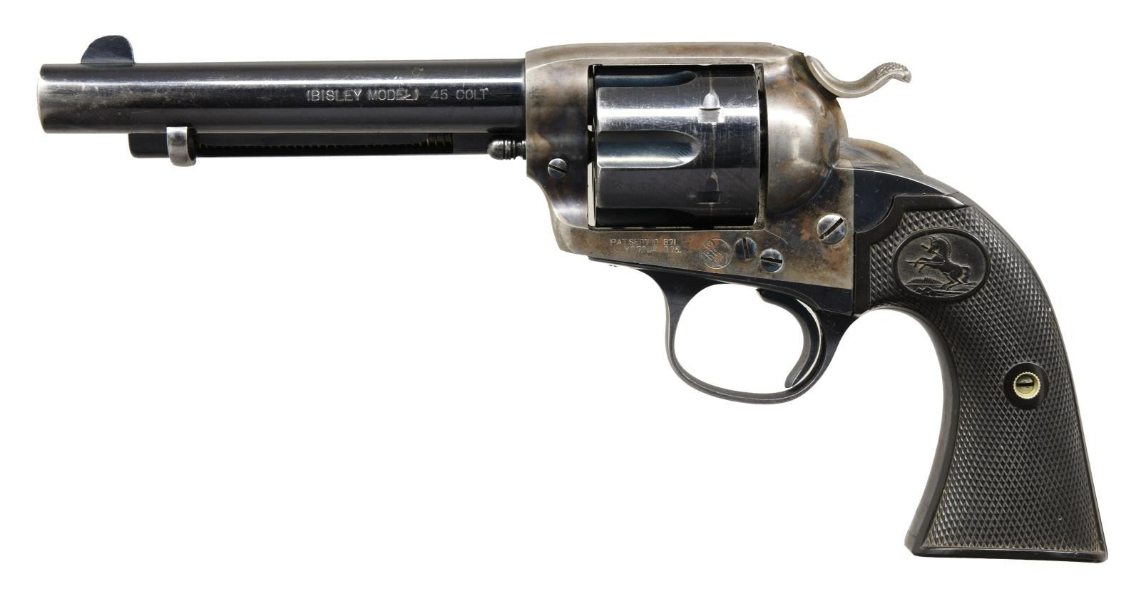 Cal. 45 Colt. S# 306757. Bbl 5 1/2". Bisley Model single action revolver manufactured by Colt in 1908. The left side of the barrel is stamped "(BISLEY MODEL) 45 COLT", with Colt's single line address across the top. Left side of the frame is stamped with patent information, followed by the encircled Rampant Colt logo. Frame and hammer exhibit a case color hardened finish, with the cylinder, barrel, ejector rod housing, trigger guard, and back strap being blued. Frame is mounted with Colt 2 piece checkered hard rubber grips. All numbers are matching and include the frame, trigger guard, and rear grip strap, with the grips matching via a hand-inscribed number on the interior of the panels. CONDITION: frame retains large amounts of its original factory case color hardened finish, exhibiting some fading and a couple areas of wear through to gray patina. Blued components retain the majority of their original factory finish, exhibiting some areas of wear and thinning that show through to pleasant brown and gray patina. Mirror bore, exhibiting well defined rifling throughout. Action timing is off and requires gunsmith attention. Grips show some mild smoothing and a couple scattered superficial marks from handling and storage, with the right panel exhibit a smooth loss to the checkering, appearing to be the result of a quick grind, but otherwise remains sturdy and serviceable. A nice 1908 vintage Colt Bisley Model revolver. (23-1411/MLW). CURIO. $2,000-3,000.