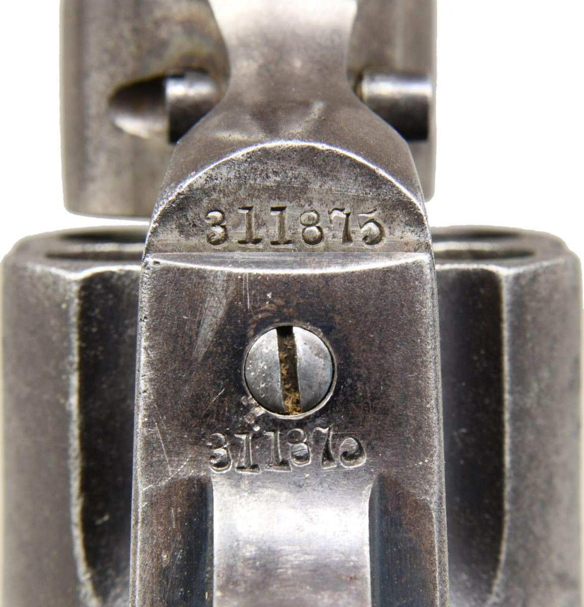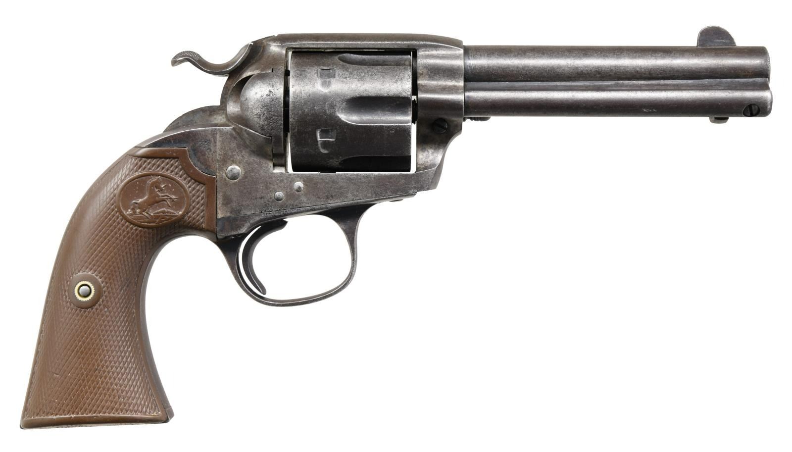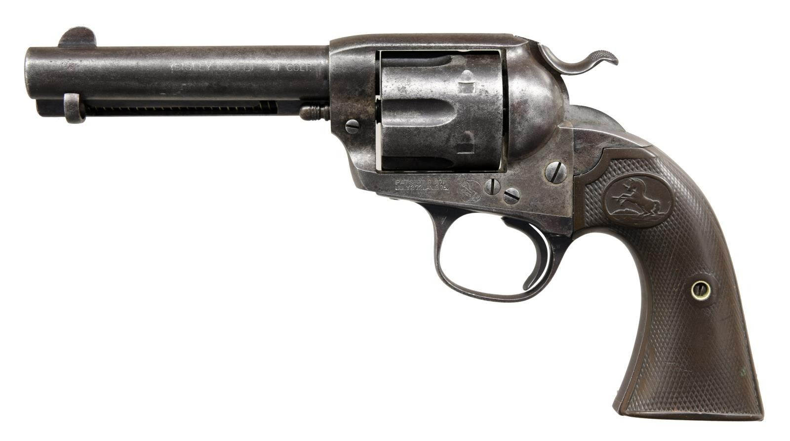 Cal. 41 Colt. S# 311875. Bbl 4 3/4". Bisley Model single action revolver manufactured by Colt in 1908. The left side of the barrel is stamped "(BISLEY MODEL) 41 COLT.", with Colt's 2 line address stamped over the top of the breech. The left side of the frame is stamped with patent information, followed by the encircled Rampant Colt logo. Frame is mounted with 2 piece Colt checkered brown hard rubber grips. Matching numbers are present on the frame, trigger guard, and rear grip strap. CONDITION: metal components retain traces of their original factory blue finish, with the balance retaining a dark gray patina, with scattered areas of pitting overall. Bore is bright, exhibiting scattered pitting and strong rifling throughout. Grips show heavy smoothing and scattered marks from handling and storage, but otherwise remain sturdy and serviceable. (23-1421/MLW). CURIO. $1,500-2,000.