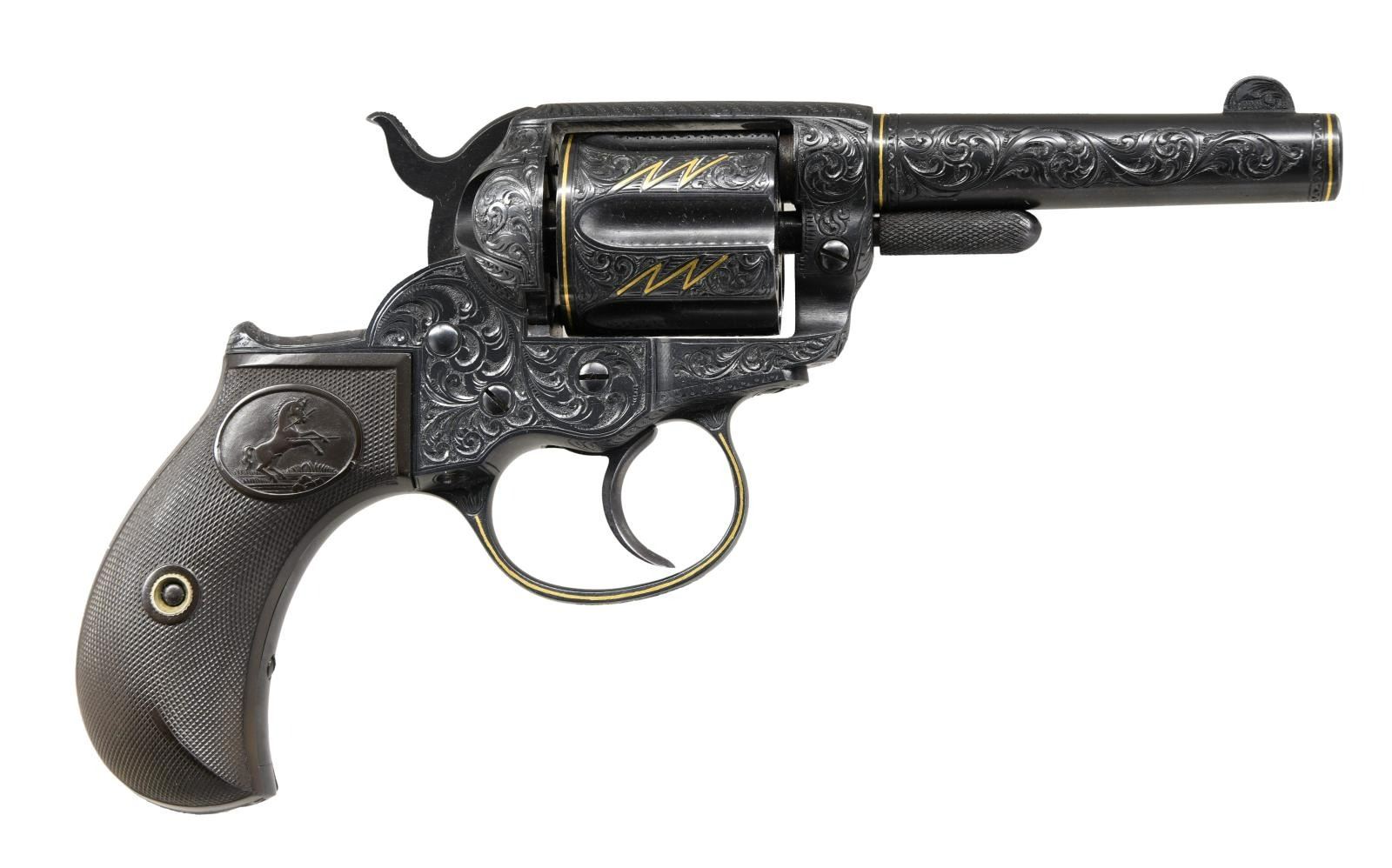 MODEL 1877 "LIGHTNING" DOUBLE ACTION REVOLVER. Cal. 38 Colt. S# 67015. Bbl 3 1/2". Model 1877 "Lightning" double action revolver originally manufactured by Colt in 1888 and later professionally restored and engraved by Floyd E. Warren in 1982.The left side of the barrel exhibits a faux "etched panel" with "COLT D.A. 38" relief engraved on a stippled background, with the top of the barrel exhibiting a hand engraved version of Colt's 2 line address within an oval. Frame, barrel, and rear grip strap feature finely executed scroll engraving on a punch dot background with single and double line borders. Cylinder features ensuite engraving with a single lightning bolt between each flute and a gold band at the rear, which is also present on the barrel at the muzzle and breech. Left and sight sides of trigger guard are highlighted in a single gold line that runs from web to web. Left side of frame is engraved "ENGRVD. BY F.E. WARREN 1982" under the left grip panel, with "FOR JOHN E. MORRIS" engraved beneath the right grip. Metal components exhibit a reapplied blue finish, with the frame being mounted with 2 piece Colt checkered brown hard rubber grips. CONDITION: extremely fine, with metal components retaining bountiful amounts of their reapplied blue finish, exhibiting some light wear on the underside of the barrel from removal of the cylinder base pin, with a couple scattered spots of light pitting present beneath the finish. Bore is bright as refinished, exhibiting pitting and strong rifling throughout. Grips show smoothing and a few scattered marks from handling and storage, but are otherwise sturdy and serviceable. An extremely attractive professionally restored Colt Model 1877 Lightning double action revolver. (01-23820/MLW). ANTIQUE. $2,250-3,500.