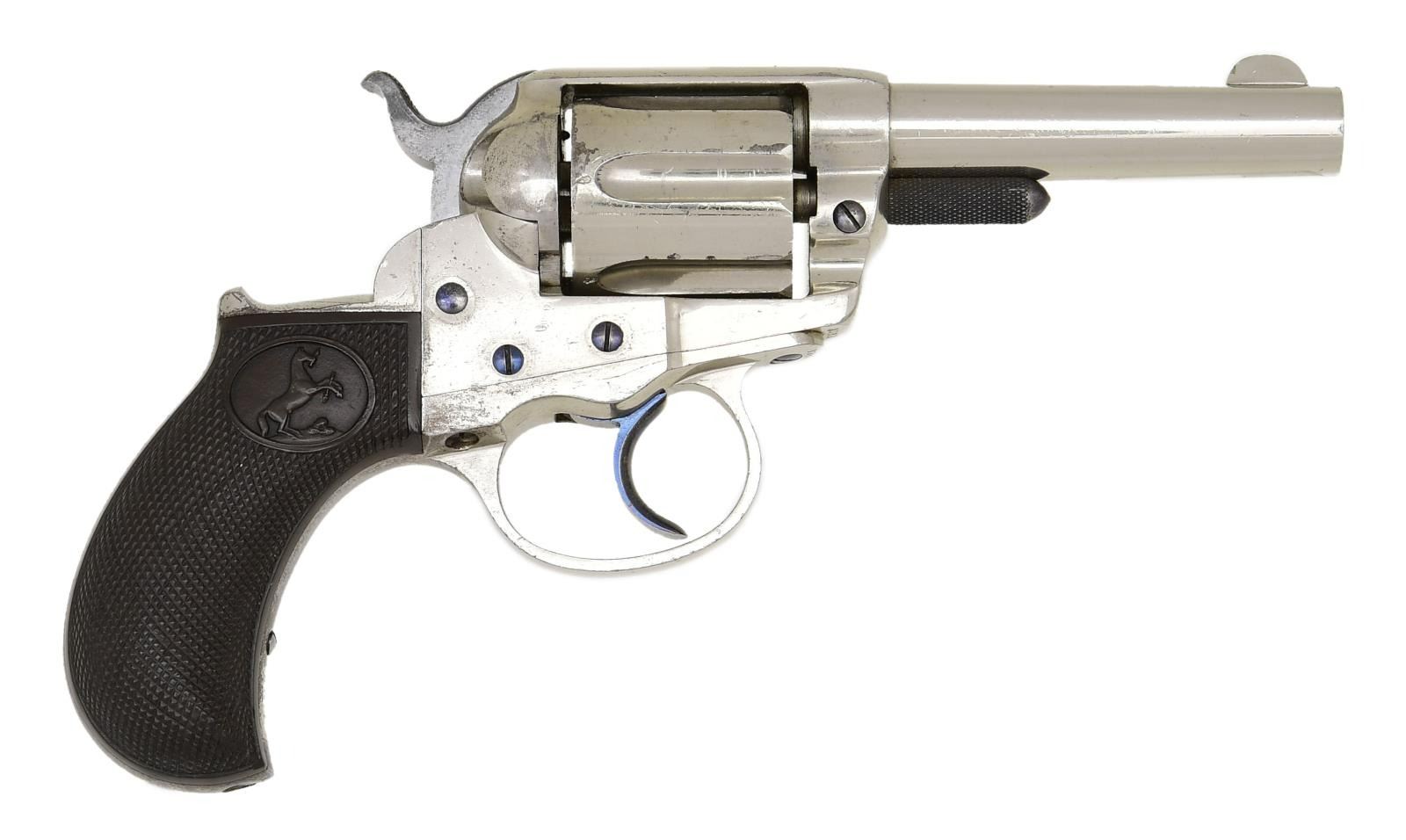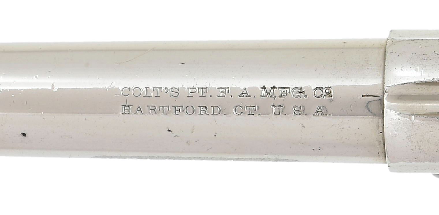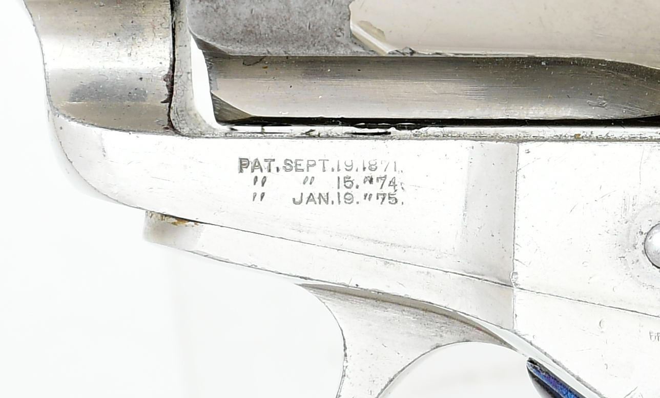 Cal. 38 Colt. S#.3083. Bbl. 3 1/2" with Hartford address, and etched panel caliber marking. Blade sight. 6 shot fluted cyl. Nickel finish with fire blued trigger & hammer, hammer has polished sides. 1 piece checkerd hard rubber round butt rampant colt grips. 1878 mfg. UNATTACHED ACCESORIES: English trade casing. Original paper label on inside lid is marked "Colts. Patent. FireArms, Manufacturing Co. / 14, Pall. Mall. S.W. / London." Blue velour fitted interior with 16 round wood cartridge black. Case contains a wire cleaning rod. CONDITION: Fine retaining over 80% nickel showing scattered flaking & marks. Etched panel caliber marking is clear & well defined. Hammer & trigger have strong fire blue. Grips show light wear. Action sound & tight. Very good rifling with a few spots of light pitting. PROVENANCE: From the Lifelong Collection of Glen E. Mattox. (01-22429/DS). ANTIQUE. $2000-3000.