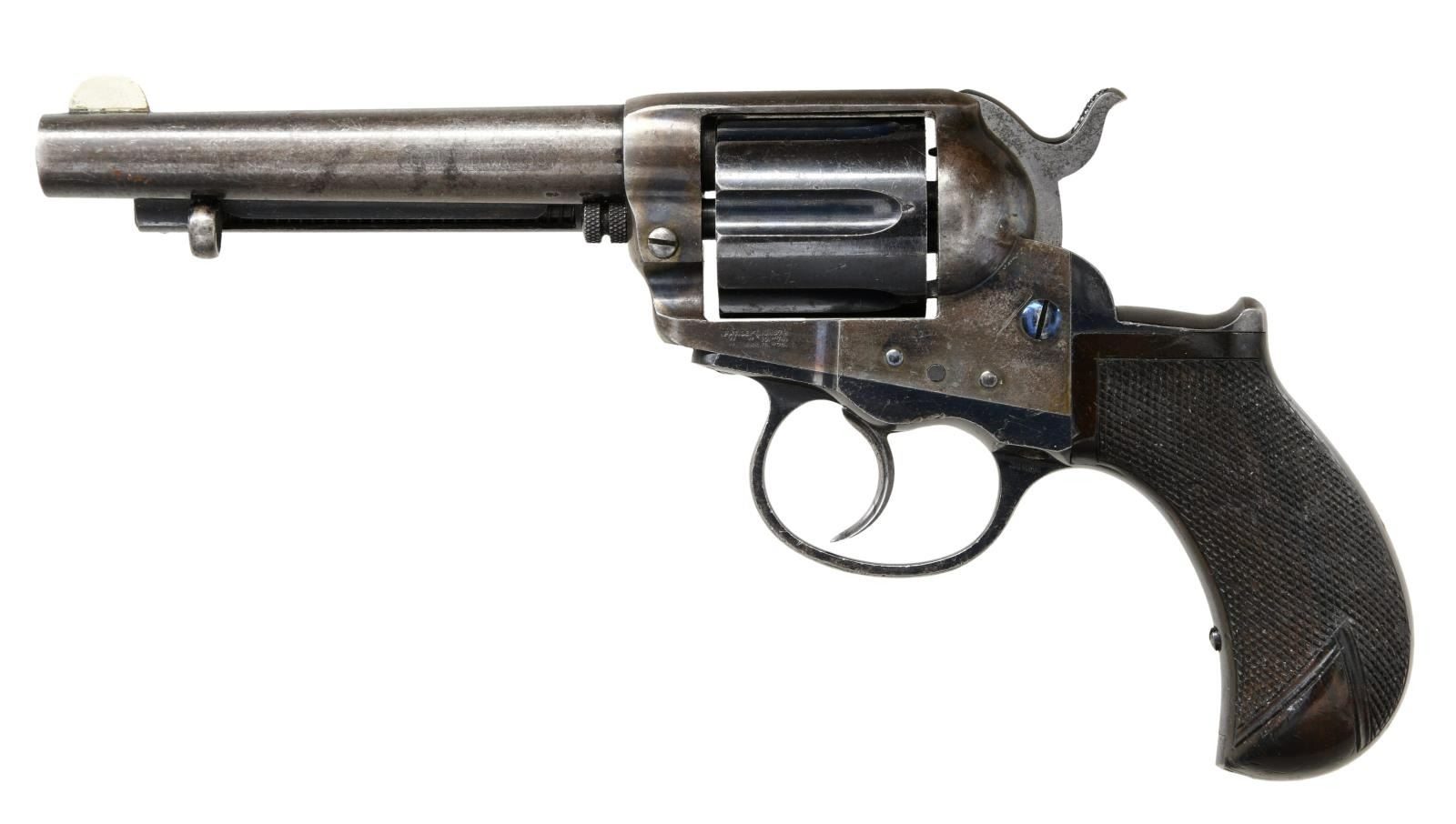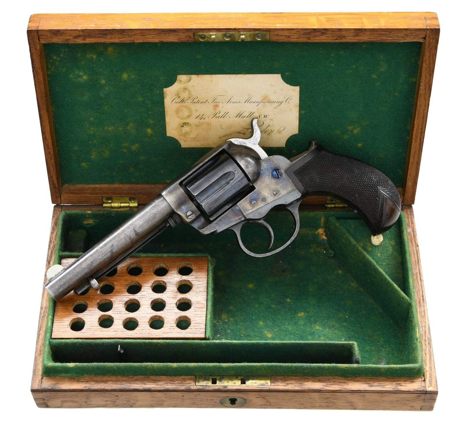 Cal. 38 Colt. S#. 25718. Bbl. 4 1/2" with Hartford address is marked "DEPOT 14 PALL MALL LONDON." Right side has etched panel cal. marking & 2 British proofs. German silver blade sight. 6 shot fluted cyl. Blue & case colored finish with fire blued hammer having polished sides. Checkered walnut 1 piece grip. 1880 mfg. UNATTACHED ACCESORIES: English trade case. Inside of lid has original paper label marked "Colts. Patent. FireArms Manufacturing Co. / 14 Pall. Mall. S.W. / London." Green felt fitted interior has a 20 round wood cartridge block. includes a wire cleaning rod. Case interior shows spots of wear & fading. CONDITION: Fine. Frame retains over 70% case colors. Over 70% blue, left side of bbl. is faded. Etched panel marking is weak. Hammer has bright fire blue. Grip shows light wear & marks, checkering has some flattened diamond. Action function well in DA mode with a slight catch in SA mode. Bright bore retains strong rifling. PROVENANCE: From the Lifelong Collection of Glen E. Mattox. (01-22430/DS). ANTIQUE. $2000-3000.