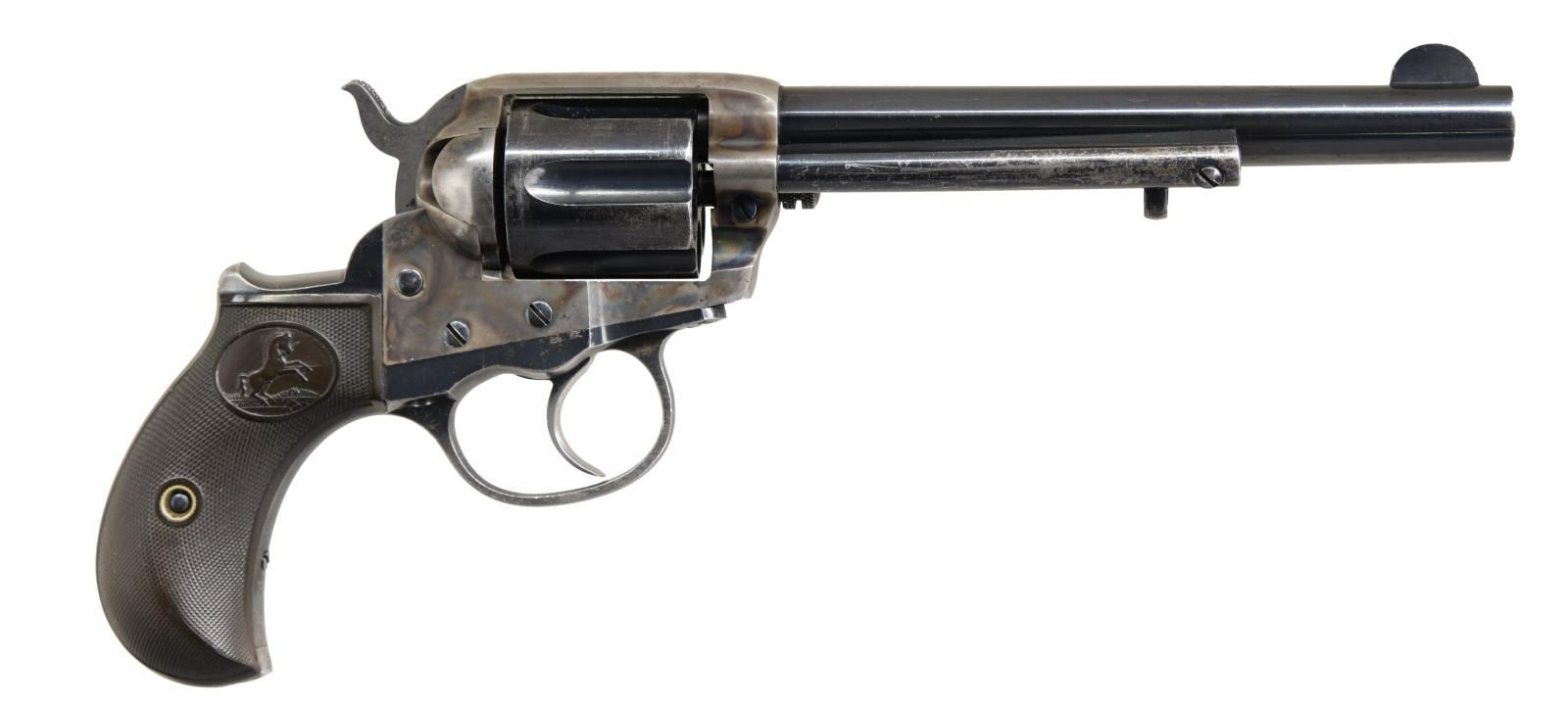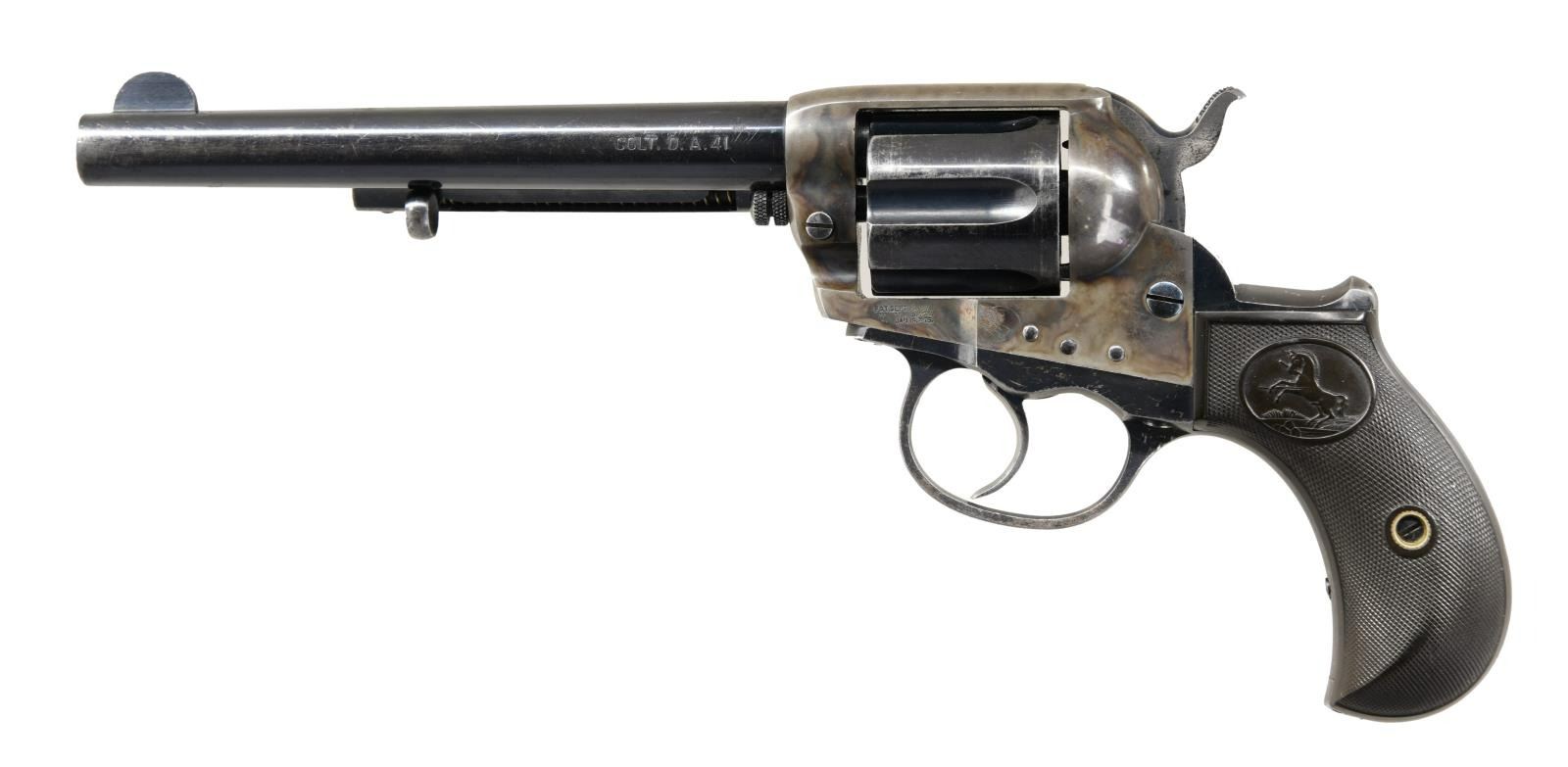 LETTER. Cal. 41 Colt. S# 163026. Bbl. 6" with blade front sight & marked on left side "COLT. D.A. 41". Blued steel bbl., grip frame & 6 shot fluted cyl. Black checkered hard rubber grips with Rampant Colt in ovals. UNATTACHED ACCESSORIES: Colt factory letter stating the following "Serial Number: 163026 / Caliber: .41 /c / Barrel Length: 6" / Finish: Blue / Type of Stocks: Not Listed / Sold ToBrittain and Company / Address: Unavailable / Shipped to: Pacific Hardware & Steel Company / Address: San Francisco, California / Date of Shipment: April 4, 1907 / Number of Same Type Guns in Shipment: 24". CONDITION: blued parts retain 70% overall thinning finish with high edge wear & scattered light scratches. Frame retains 80% original vivid case colors. Very good grips show light high edge wear. Bore retains strong rifling with scattered minor pitting. (23-5068/BH). CURIO. $1,500-2,000.