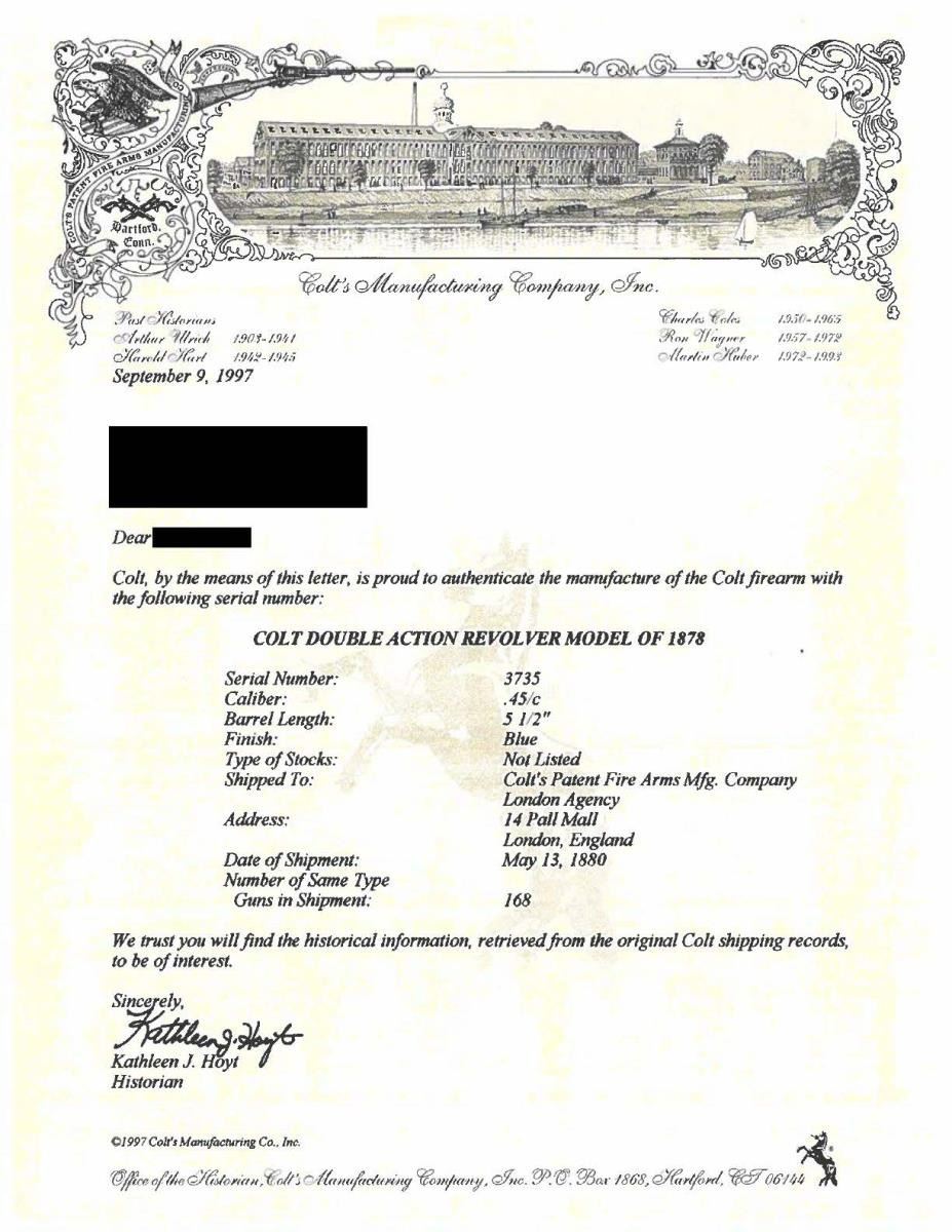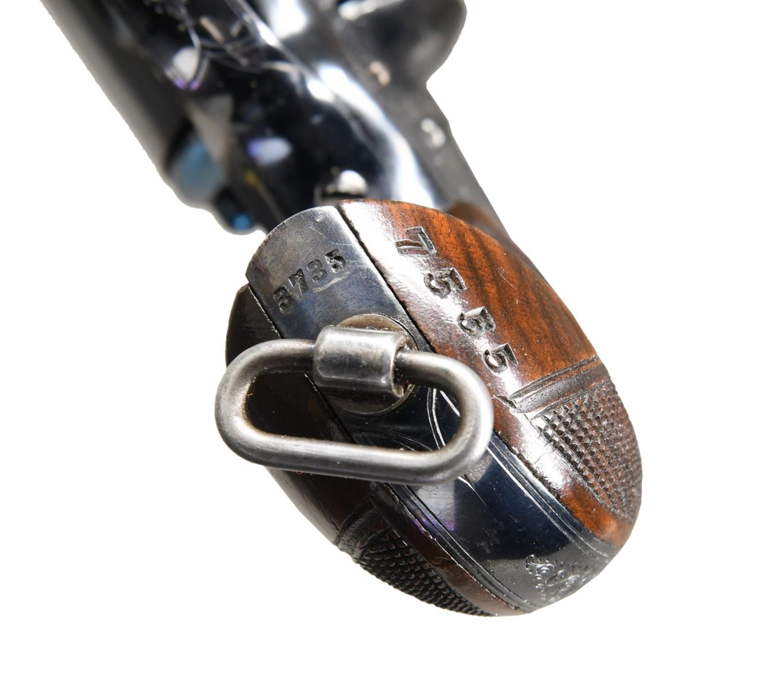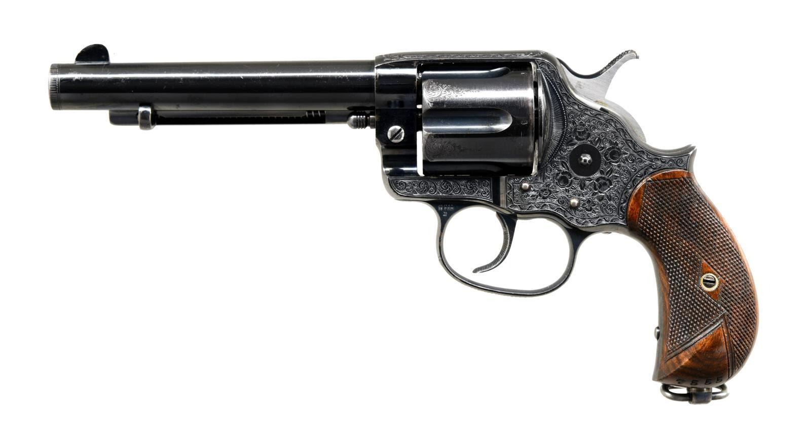 WITH CASE. Cal. 45. S# 3735. You won't find a more impressive Colt model 1878 DA revolver. The accompanying factory letter states gun was shipped to London agency in 1880 but makes no mention of engraving which is characteristically English with tighter and finer scrolls and this example has flowers incorporated in the scrolls. Standard configuration with 5.5" barrel marked: "COLT'S PT.F.A. MFG. Co HARTFORD CT. U.S.A. DEPOT 14 PALL MALL LONDON", tiny British proofs on bottom of barrel add back edge of cylinder, fire blue finished trigger and back of hammer, sides of hammer are polished bright, checkered and varnished two piece burl walnut grips, case hardened sling swivel riveted at butt. "45CAL / B" stamped on left forward trigger bow web. The revolver is housed in an accompanying red baize lined British-style oak case, round brass plate in lid with 3 scratched initials. The interior compartmented for revolver, 18-round cartridge block, gutta percha oil bottle, 3 matching wood handled tools. UNATTACHED ACCESSORIES: Colt factory letter, lase & accessories as listed above. CONDITION: excellent overall, all matching & original, retaining over 95% bright original high polish blue including fire blue on trigger and back of hammer. Only noticeable losses to blue or the lightly worn areas on back edge of cylinder. Mechanically crisp with bright shiny bore. Accompanying later manufacture London Colt casing is fine as are accessories. There is 4 digit number stamped in butt stock, unknown "collection or inventory number". PROVENANCE: Pete Holder, Little John's auction 1998, Collection of Horst Kreiner. (01-24017/JS). ANTIQUE. $15,000-20,000.
