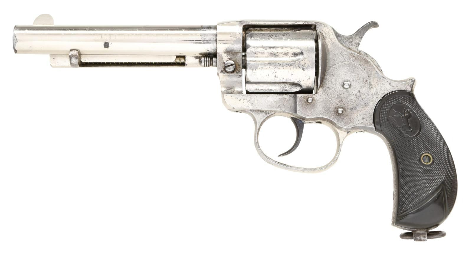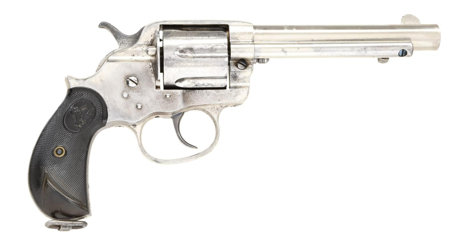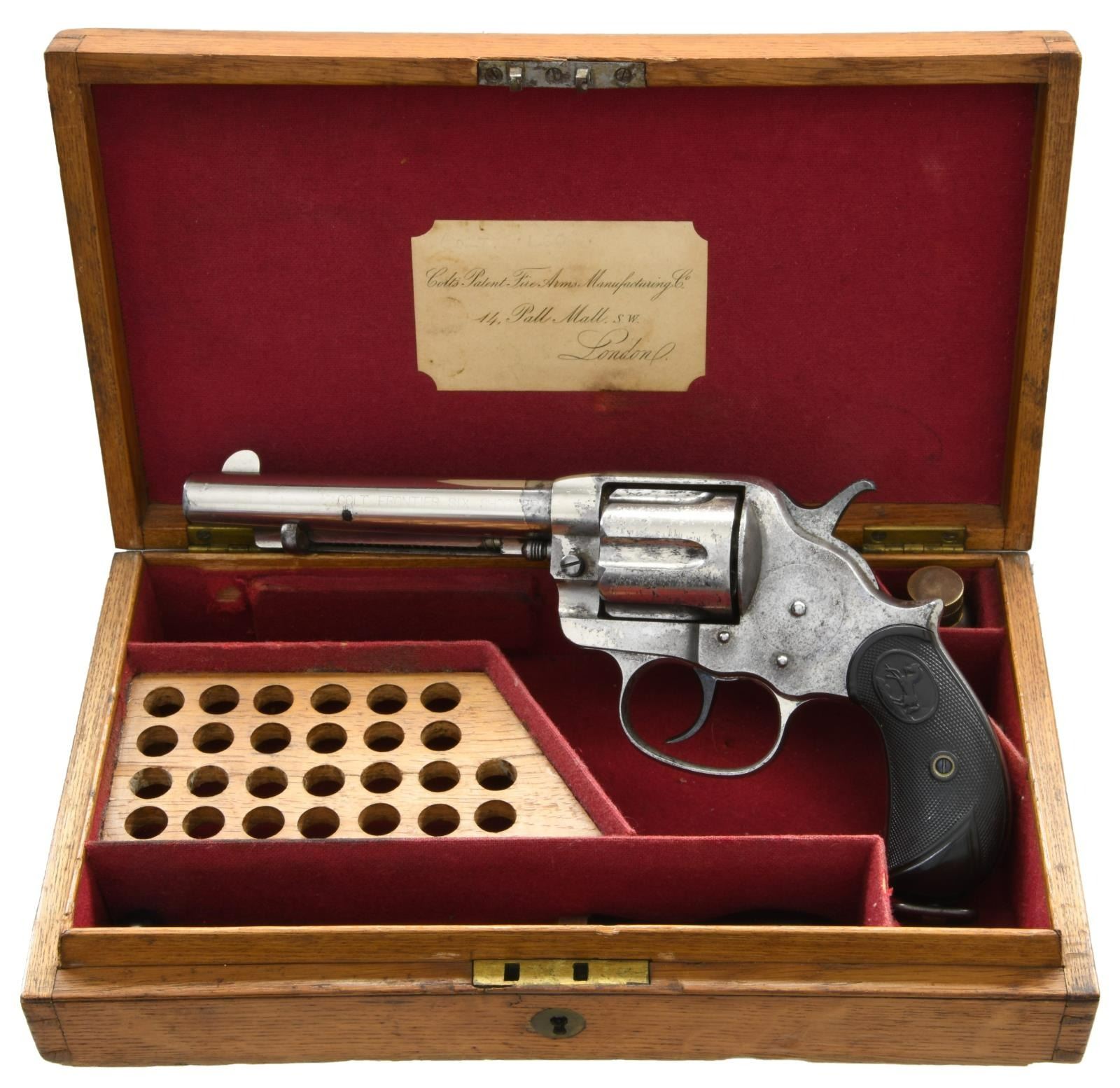 REVOLVER. Cal. 44-40. S#. 24282. Bbl. 5 1/2" round with Hartford address & blade sight . Long flute 6 shot cyl. Full nickel finish. 2 piece checkered hard rubber rampant colt grips with lanyard loop at butt. Right panel is stamped "610" near the bottom. 1889 mfg. UNATTACHED ACCESORIES: English wood casing. Original paper label on lid interior reads"Colts. Patent. FireArms Manufacturing Co. / 14 Pall, Mall, S.W. / London." Red felt fitted interior features a 26 rd wood cartridge block. Case contains ebony handled turn screw & cleaning rod, oil bottle & key. CONDITION: Fine. Bbl. retains 70% nickel. Action has nickel in protected areas. Grips show light wear, right panel has a gouge near butt. Cyl. exhibits some side play. Lightly pitted bore has worn rifling. PROVENANCE: From the Lifelong Collection of Glen E. Mattox. (01-22432/DS). ANTIQUE. $2500-3500.
