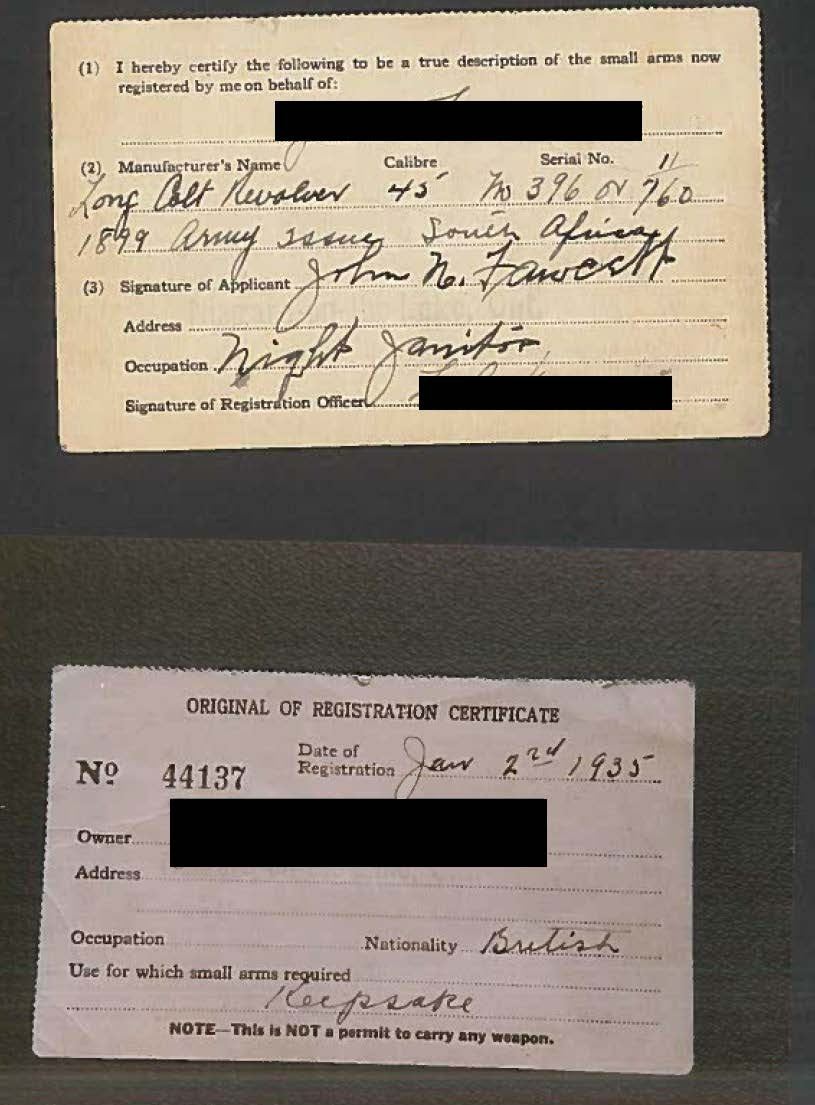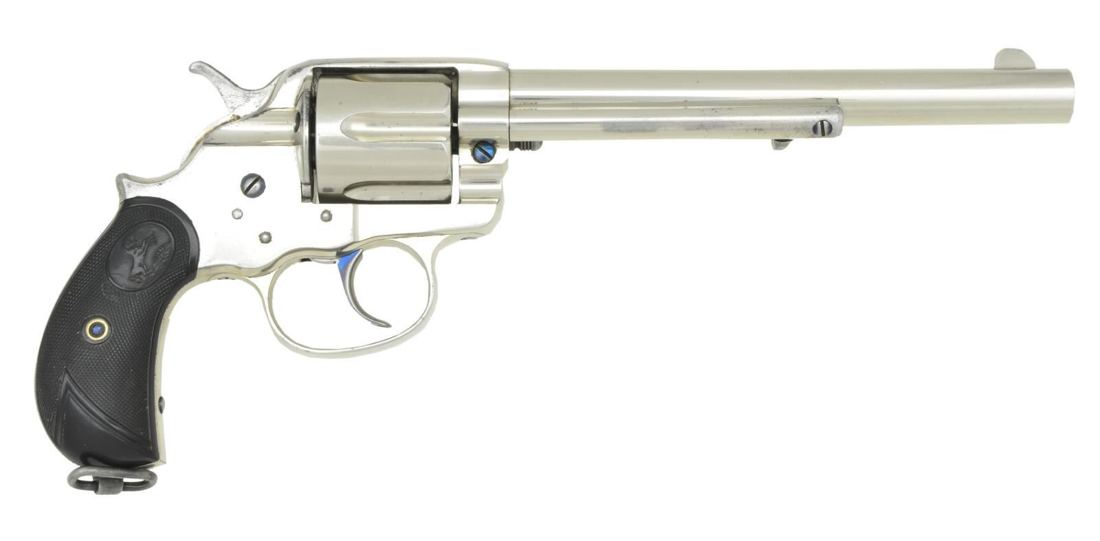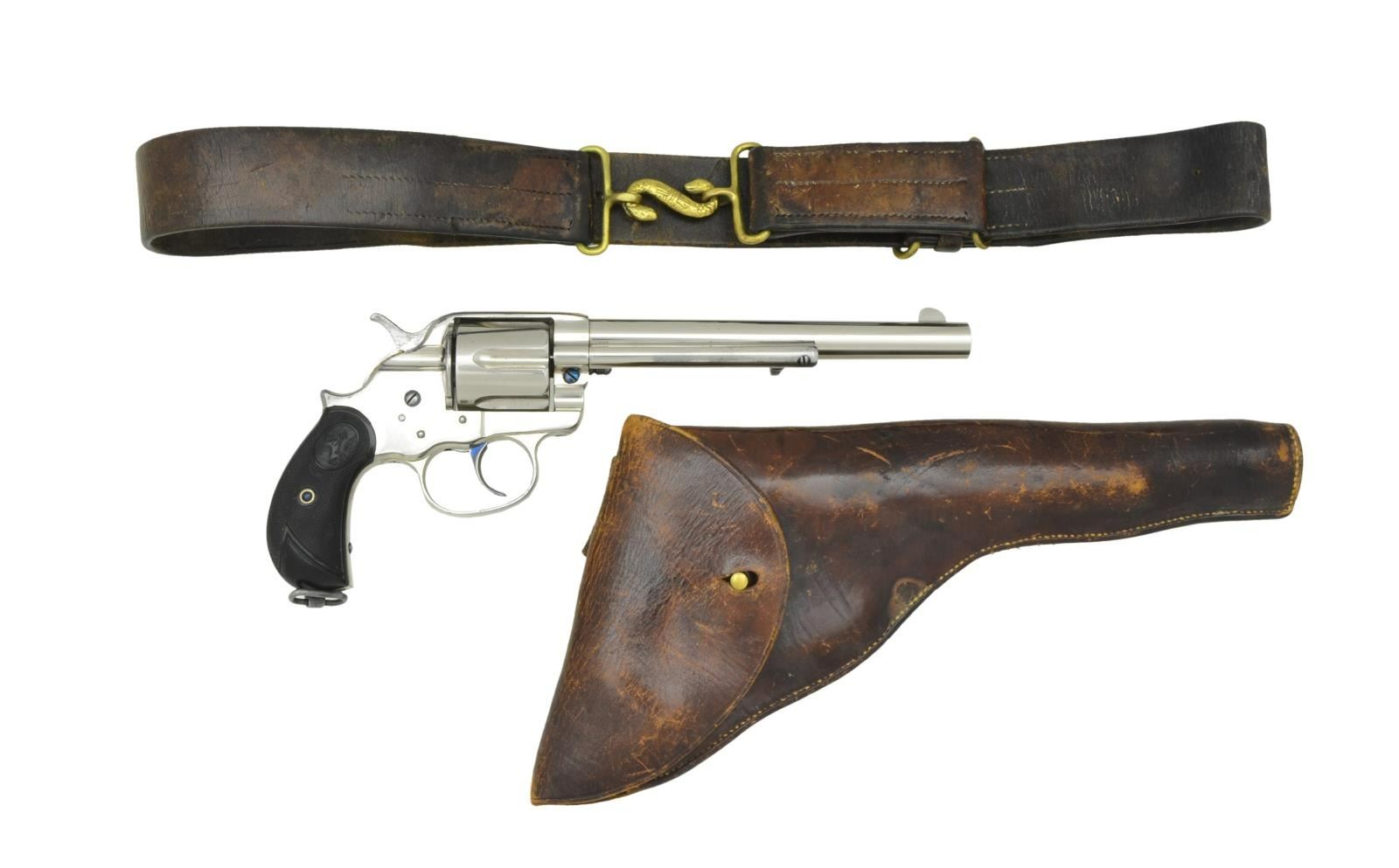 DA REVOLVER. Cal. 45 Colt. S# 11760. Bbl. 7 1/2" w/ blade sight. Six shot long flute cyl. Full nickel finished w/ fire blue hammer & trigger. 2 piece checkered hard rubber rampant colt round butt grips w/ lanyard ring at butt. Mfg. 1883. UNATTACHED ACCESSORIES: Colt firearms letting listing the following information: "COLT MODEL 1878 DOUBLE ACTION REVOLVER", "Serial Number: 11760", "Caliber: .45/c", "Barrel Length: 7 1/2", "Finish: Blue", "Type of Stocks: Not listed", "Shipped To: Hartley & Graham", "Address: New York, New York", "Date of Shipment: October 27, 1883" & "Number of Same Guns in Shipment: 40". Black ring binder w/ a large volume of information about the revolver from the Canadian National Archives. Registration certificates, military records & Canadian war history as well as photos. A chain of custody for the revolver is detailed starting w/ Colt to Hartley & Graham to the Canadian government to three subsequent owners to the consignor. A copy of the gun report volume 43, no. 1 June 1997 is included w/ an article starting on page 31 about the Canadian Militia & Defense colt 1878 revolvers. This revolver & its holster are pictured in the article. Leather flap holster & belt w/ brass hook. Inside flap has hand-written marking "P. V. C. Tice" & stamped name "A. Laurie". Belt & holster are in fair to good condition. SPECIAL NOTE: This revolver was issued in two historical Canadian wars; A) The North West Rebellion (Canada's Indian War of 1885). B) The 1899-1902 South African War. This was the first time in history that Canada dispatched troops to an overseas war. The names on the holster as well as the last registered owner were all in the same unit in South Africa. CONDITION: very fine as is the finest condition gun known to have taken part in both wars, along with the original holster & belt. Retaining over 95% nickel finish showing carry wear on backstrap & small spots. Grips show light wear. Sound mechanics. Bore retains strong rifling. (01-22034/DS). ANTIQUE. $3,500-5,500.