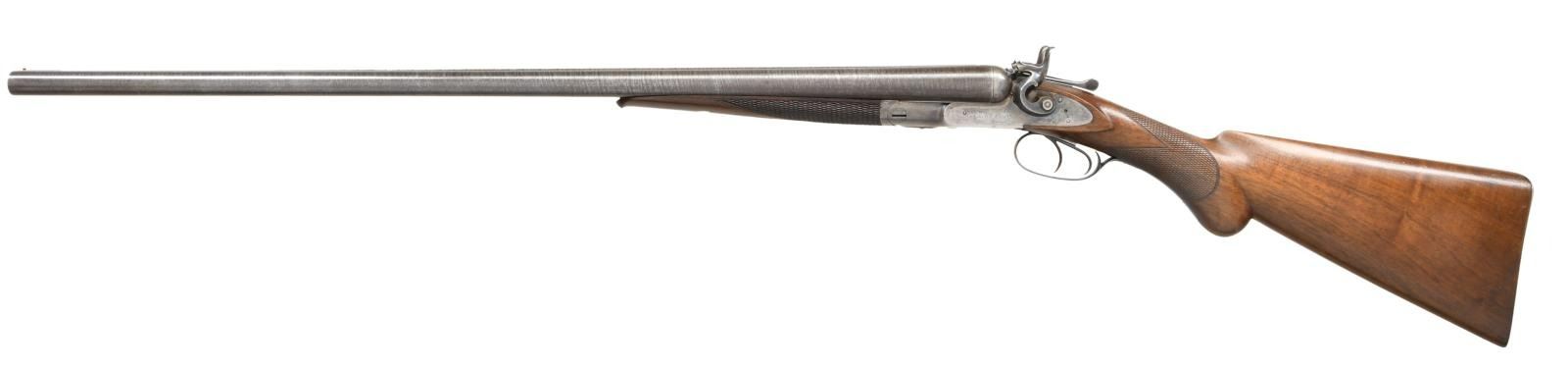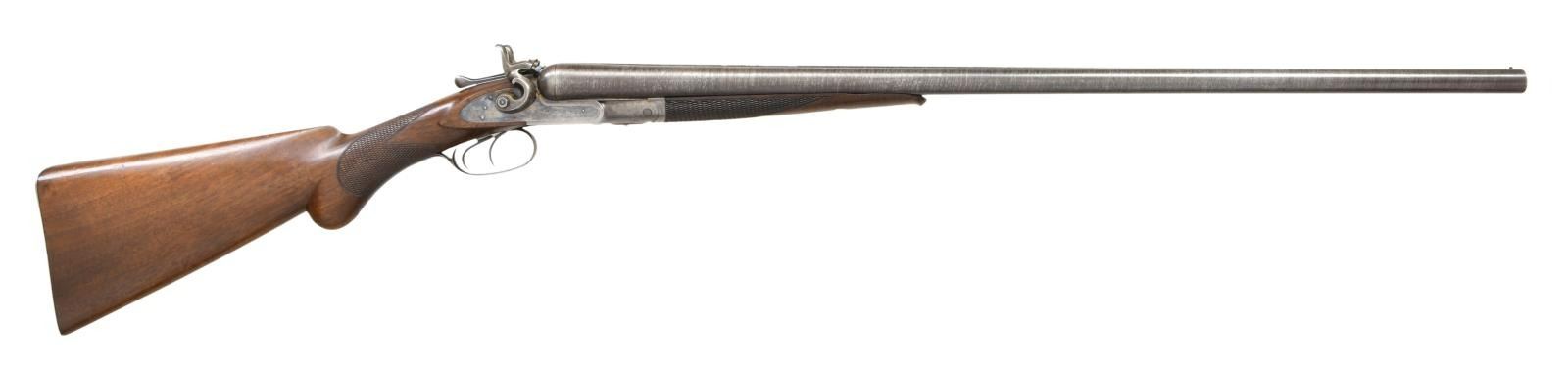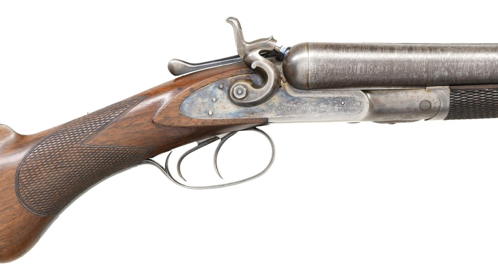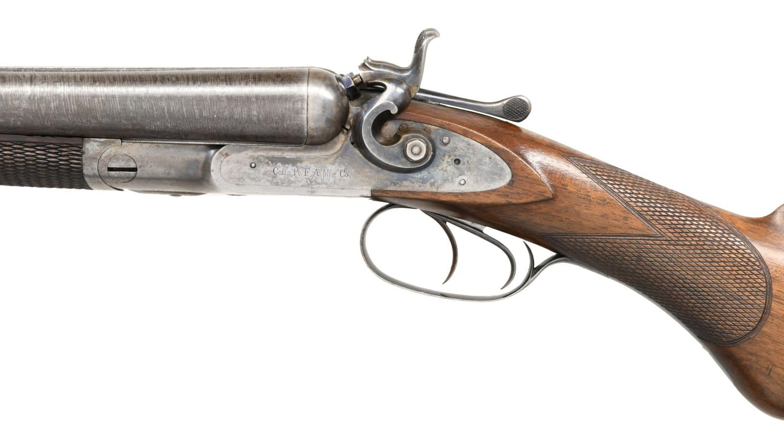 Cal. 12 Ga., 2 5/8". S# 3652. The 30" twist steel barrels are completely unmarked except for S# on rear lump. Case hardened top lever action is fitted with front spring locks with rebounding chamfered serpentine hammers. Each lockplate is marked "Colts PT. F.A. Mfg. Co.". S# is engraved on blued trigger guard tang. Round knob buttstock of plain American walnut measures 14 1/4" over case hardened steel buttplate. Point pattern checkering is at grip. Matching splinter forend with inlet ebony tip has Colt's adaptation of a Deeley type release. MEASUREMENTS: BBLS: Bore Diameter: L .738. R .737. Restriction: L .024 (Mod). R .023 (Mod). Wall thickness: L .032. R .034. STOCK: DAH: 3 1/4". DAC: 1 7/8". CAST: neutral. LOP: 14 1/4". WEIGHT: 8 lb. 4 oz. CONDITION: very fine. Barrels retaining over 90% original twist finish with some scattered marks. Action and lockplates retain 40-50% original case hardening color. Right plate is quite strong with about 80% color. Action shows some spotting. Top lever, trigger plate and trigger guard retain over 80% original bright blue. Buttplate has a good amount of its original case hardening color. Stocks retain over 90% original oil finish with a good scattering of light marks and a few deep bumps. Bores are bright and shiny with raised dent 8" behind muzzle of right barrel and with a minor dent at same area of left. (01-24122/MGM). ANTIQUE. $3,000-4,000.