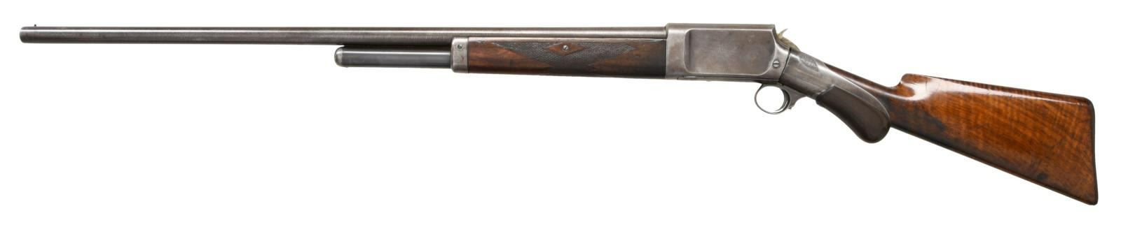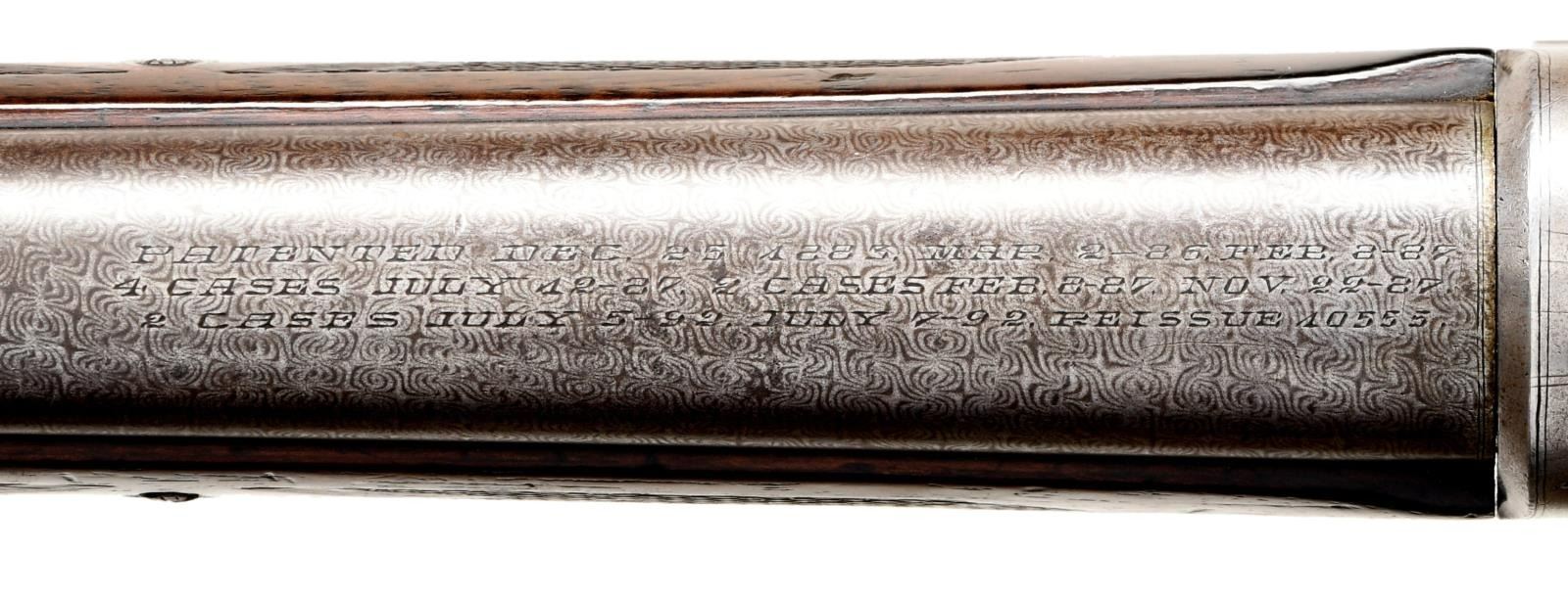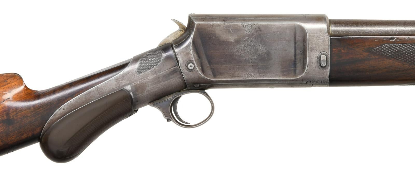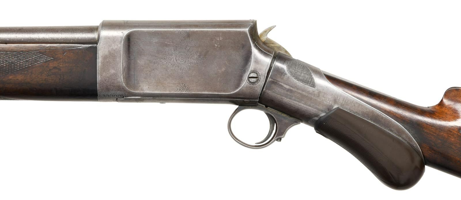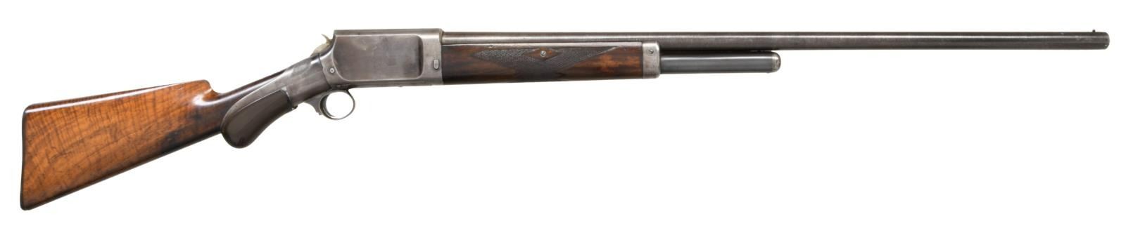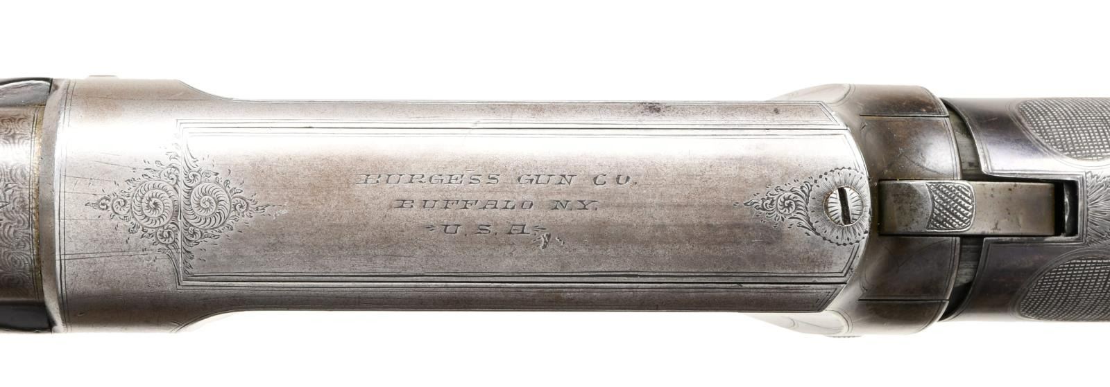 Cal. 12ga. S# 1037. Bbl. 30" fine Damascus steel w/ fixed full choke. Unique slide action design by Andrew Burgess, also known for his Colt & Whitney lever action rifles. An estimated quantity of a few thousand were produced by the Burgess Gun Company of Buffalo, NY, 1892-99. The company was purchased by Winchester in 1899 & mfg. was discontinued. The action is cycled by the rearward motion of an iron sleeve w/ hard rubber grip over the wrist of the stock. Bbl. & top of breech block have standard Burgess markings. Action has factory engraving consisting of ornate spirals on sides of frame w/ straight line borders as well as spiral & leaf highlights. Straight grip stock of nicely grained walnut w/ hard rubber buttplate. Walnut forearm has wraparound point pattern factory checkering. Half length tubular mag. CONDITION: bbl. retains over 70% brown finish showing a vivid Damascus pattern. Exposed portion of mag. tube retains 80% blue. Action & slide have 30% fading blue in protected areas. Original wood finish & checkering show wear w/ dents, scratches & marks. Sound mechanics. Very good bright bore. (01-23418/DS). ANTIQUE. $1500-2500.