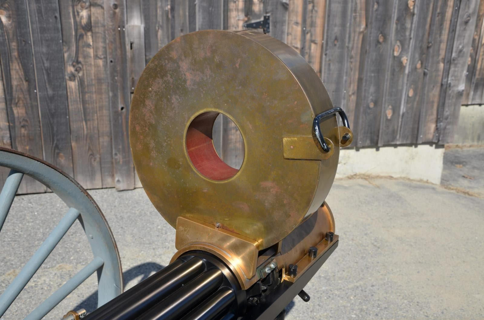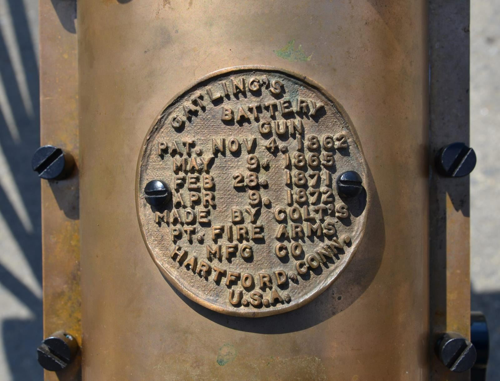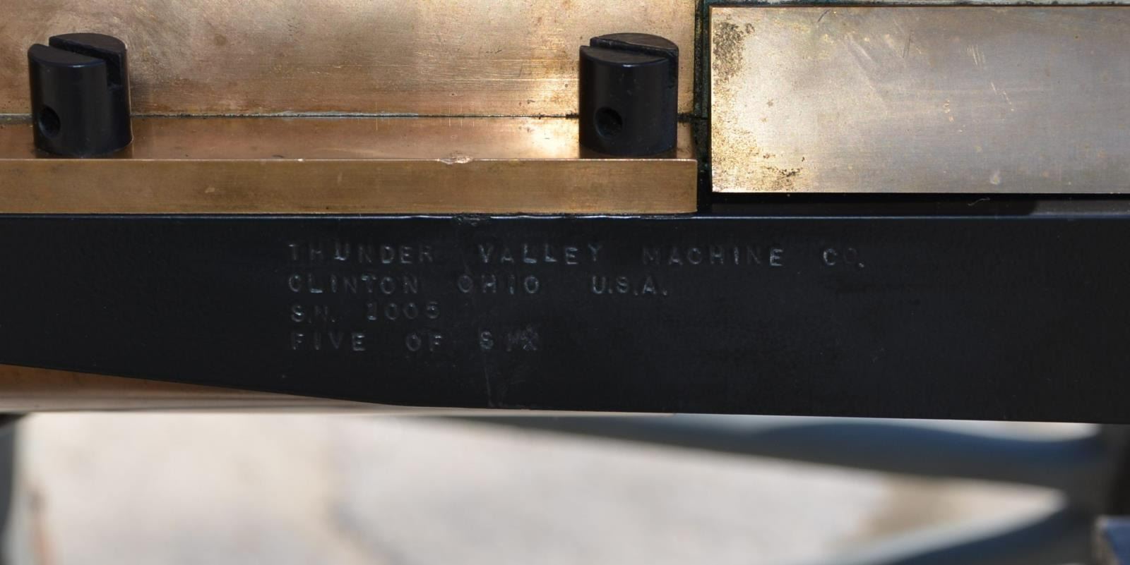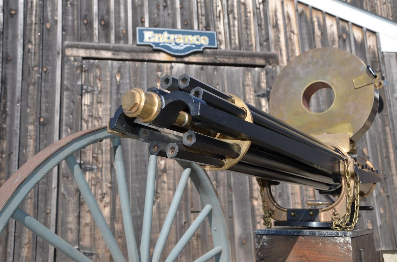 GUN. Cal. 45-70. S# 1005. Bbl. 31". A full scale, functional reproduction of the well known 1883 Battery Gun. These guns boast a large round brass receiver w/ an exposed 10 barrel cluster. Heavy duty circular name plate w/ the original Gatling nomenclature, directly behind the feed mechanism that reads "GATLING'S BATTERY GUN / PAT. NOV 4. 1862 / MAY 9. 1865 / FEB 28. 1871 / APR 9. 1872 / MADE BY COLT'S PT. FIRE ARMS / MFG CO / HARTFORD, CONN. U.S.A." Running parallel w/ the barrel cluster are 2 steel frame rails on either side, right side of receiver rail marked "Thunder Valley Machine Co. Clinton, Ohio. SN 1005". The feed mechanism is the circular Accles positive feed device. They are often referred to as a 100 round magazines though it is not uncommon for them to hold any capacity between 99-104 rounds, (we are uncertain of the capacity on this gun). The gun is mounted on a classic style field carriage w/ 48" wooden spoked wheels. Steel hubs & external steel wheel band. Gun measures 55" in length & overall length on carriage is 85" w/ a width of 58". Gun & carriage utilize a brass pintle allowing several degrees of elevation adjustment utilizing the screw elevation mechanism at the rear, below the receiver. MAGS: 1 Accles power feed drum. UNATTACHED ACCESSORIES: black steel tripod w/ central chain. The legs are 34" in length & the height from the ground to the bottom of the receiver is 30". CONDITION: both mechanically & aesthetically, everything appears to be in good condition. Brass receiver is appropriately spotted as it does w/ age, and could be heavily polished to a bright mirror surface, or as most often desired, left alone to continue to age naturally. The barrel cluster spins freely by turning crank. Accles power feed drops onto receiver but must be hand fitted to properly engage & lock in place to function. Carriage is sufficient for display while w/ some structural strengthening could make a fantastic live fire mount. Bores vary slightly in condition though all retain descent rifling & most are quite bright. Fire control mechanism appears to function correctly when cycled by hand. (20-459/JZ). MODERN. $10,000-15,000.