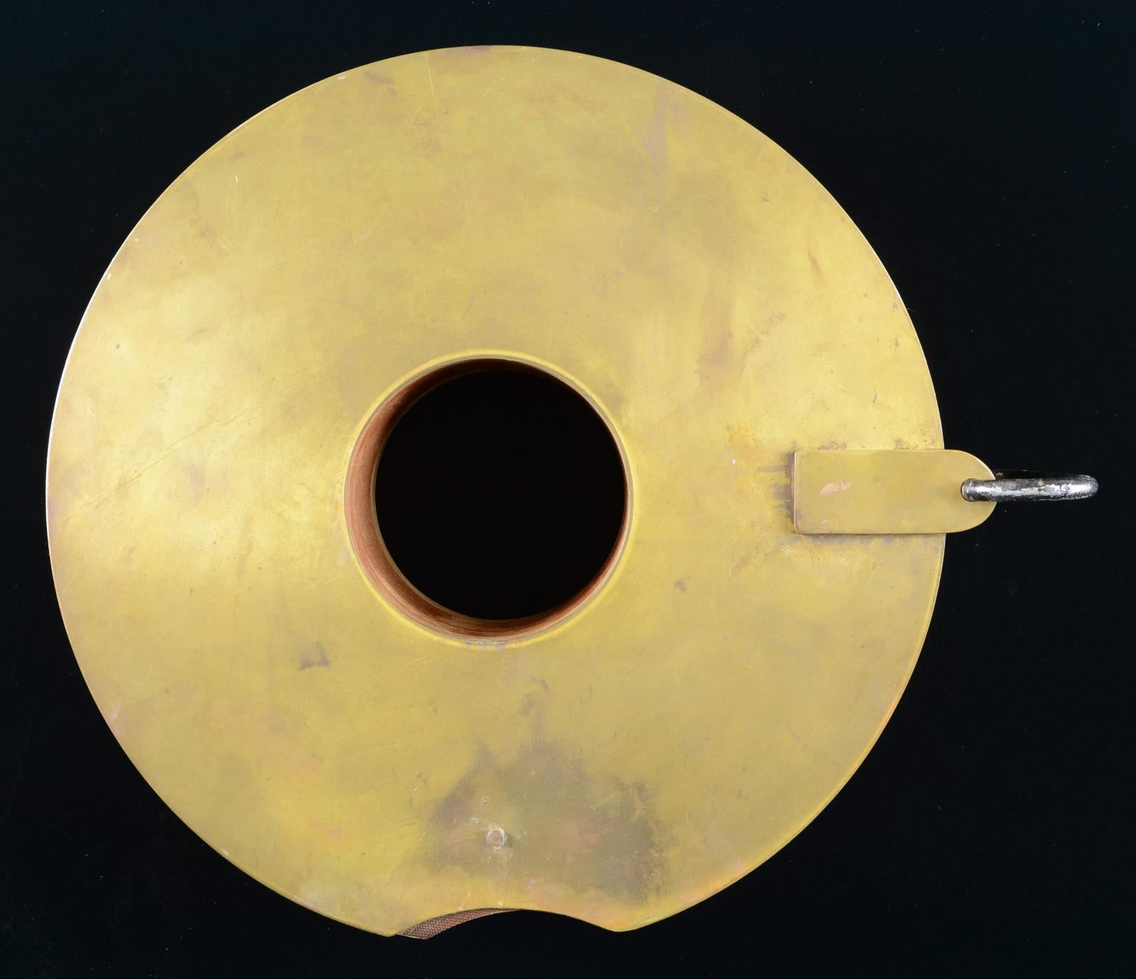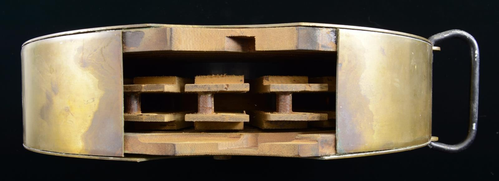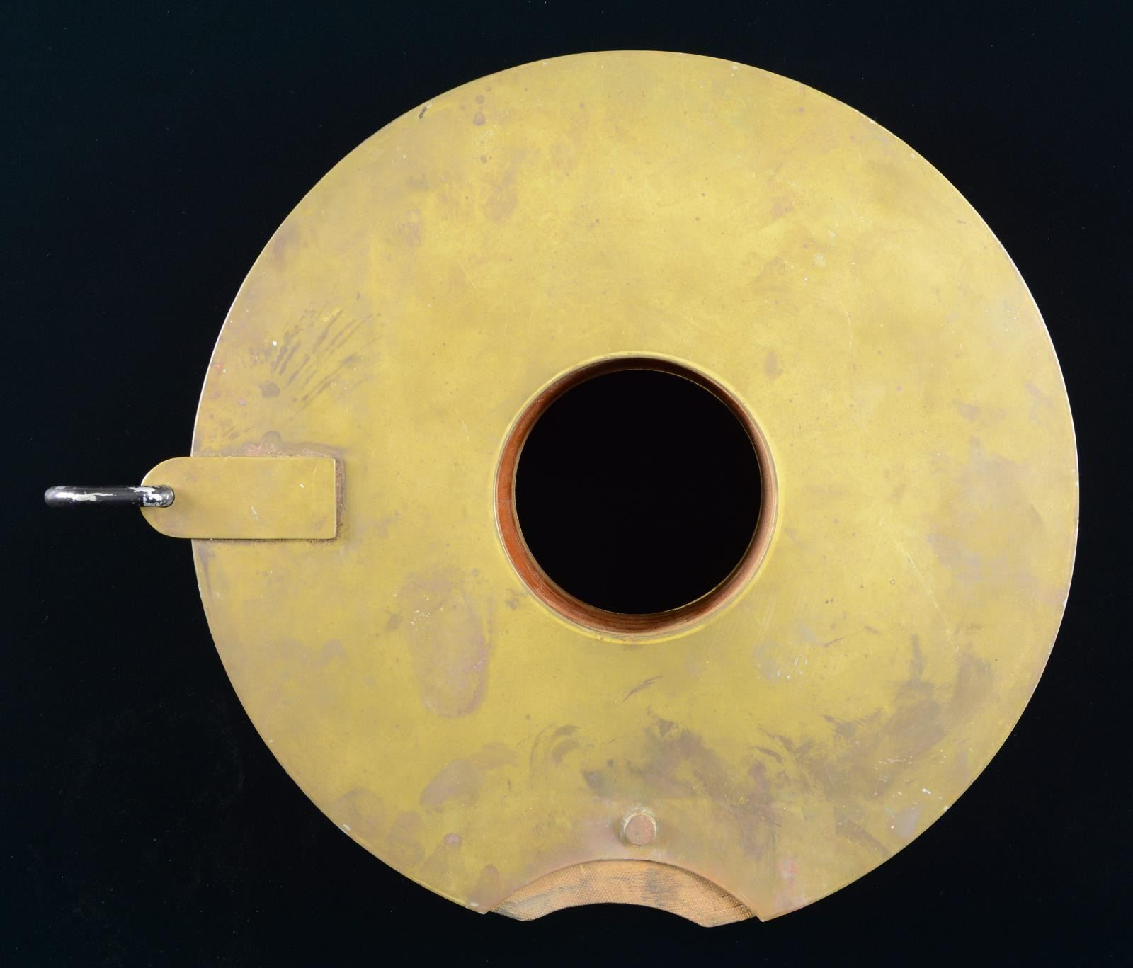 Cal. 45-70. Appears to be Thunder Valley manufacture, though no external markings. Circular Accles positive feed device is often referred to as a 100 round magazine though it is not uncommon for them to hold any capacity between 99-104 rounds, we are uncertain of the capacity on this drum. Brass outer shell w/ wood internal drive mechanism. 14" in diameter w/ 4.37" center hole.. Approximately 3.20" in width at feed location. Locking pins measure 0.47" & 0.23" in diameter. Steel carry handle. CONDITION: Feed mechanism rotates smoothly & feeds easily w/ the few test rounds we had on hand. Proper patina finish on external surfaces. No externally visible dents or impressions that would interfere w/ operation. (02-21037/JZ). $500-1,000.