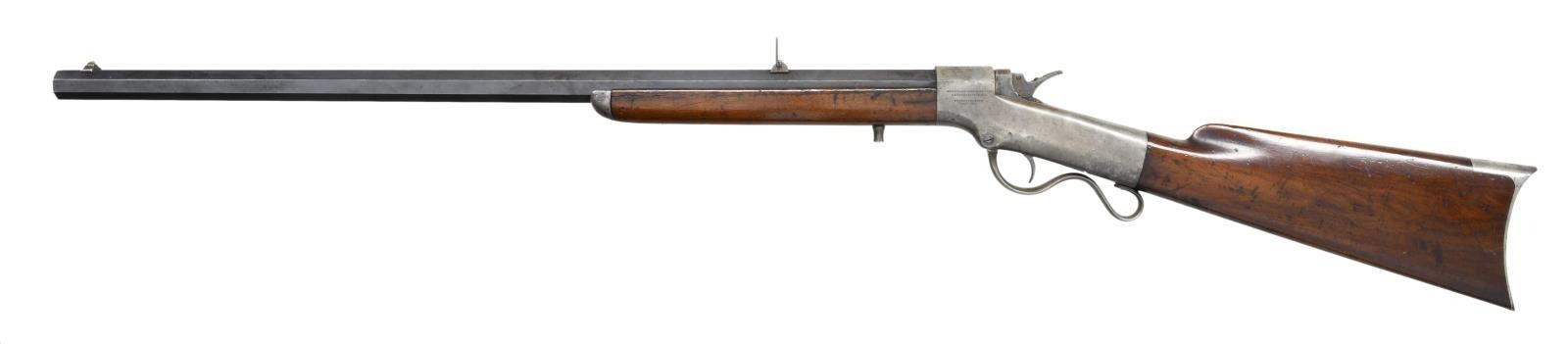 IGNITION SPORTING RIFLE. CAL. 38 RF/ 38 Perc. S# 19773, Mfg. 1867-69 with approx. 2200 mfg. Nearly all of the Merrimack Ballard's are fitted with the dual ignition system allowing the firearm to function utilizing 38 RF or 38 percussion with a quick adjustment of the swivel RF firing pin. FItted with a 26" oct. Bbl with dovetailed front sight holding a German silver blade insert and two leaf rear sight. External extractor. CONDITION: Overall very good with strong original blue bbl. Frame retains faded case colors. Crisp markings. Refinished stock set has scattered handling marks (some heavy), dark staining, a check crack at the forearm and some minor small chips. Very good bore with nice rifling. PROVENANCE: From the Lifelong Collection of Glen E. Mattox. (01-22515/ZAL) ANTIQUE $1200-1800